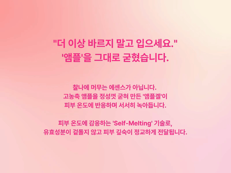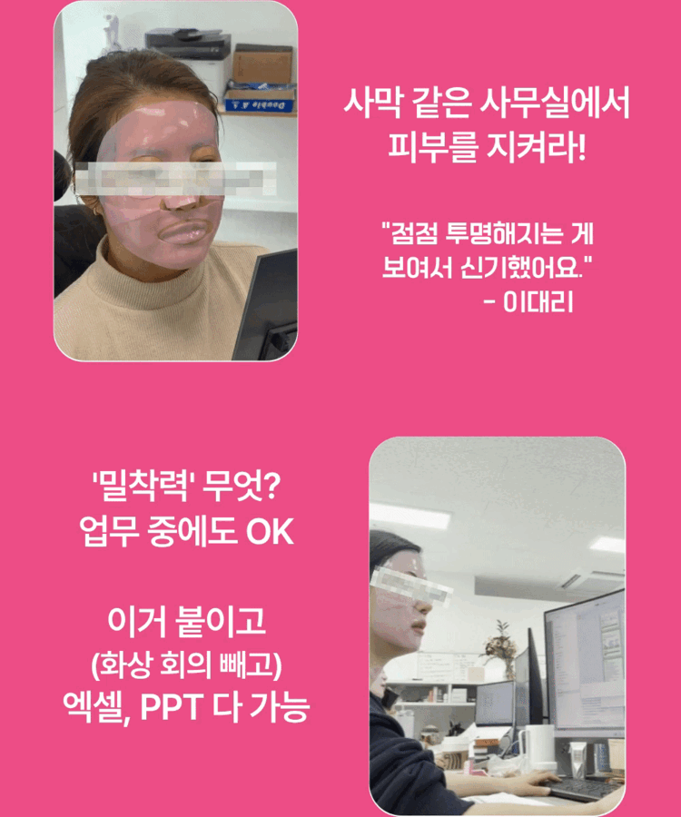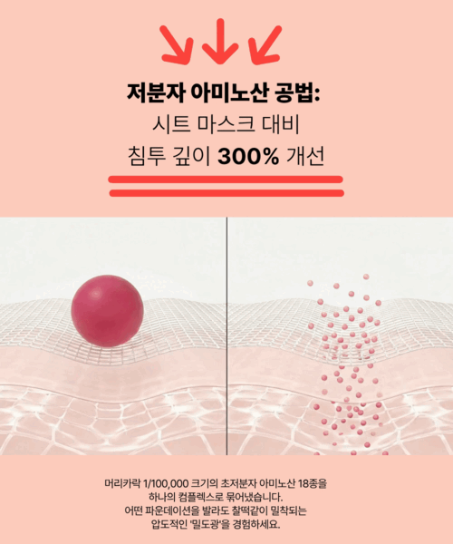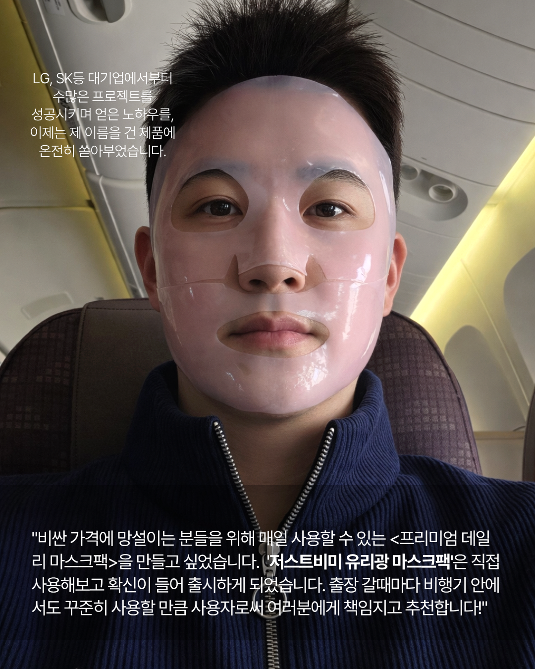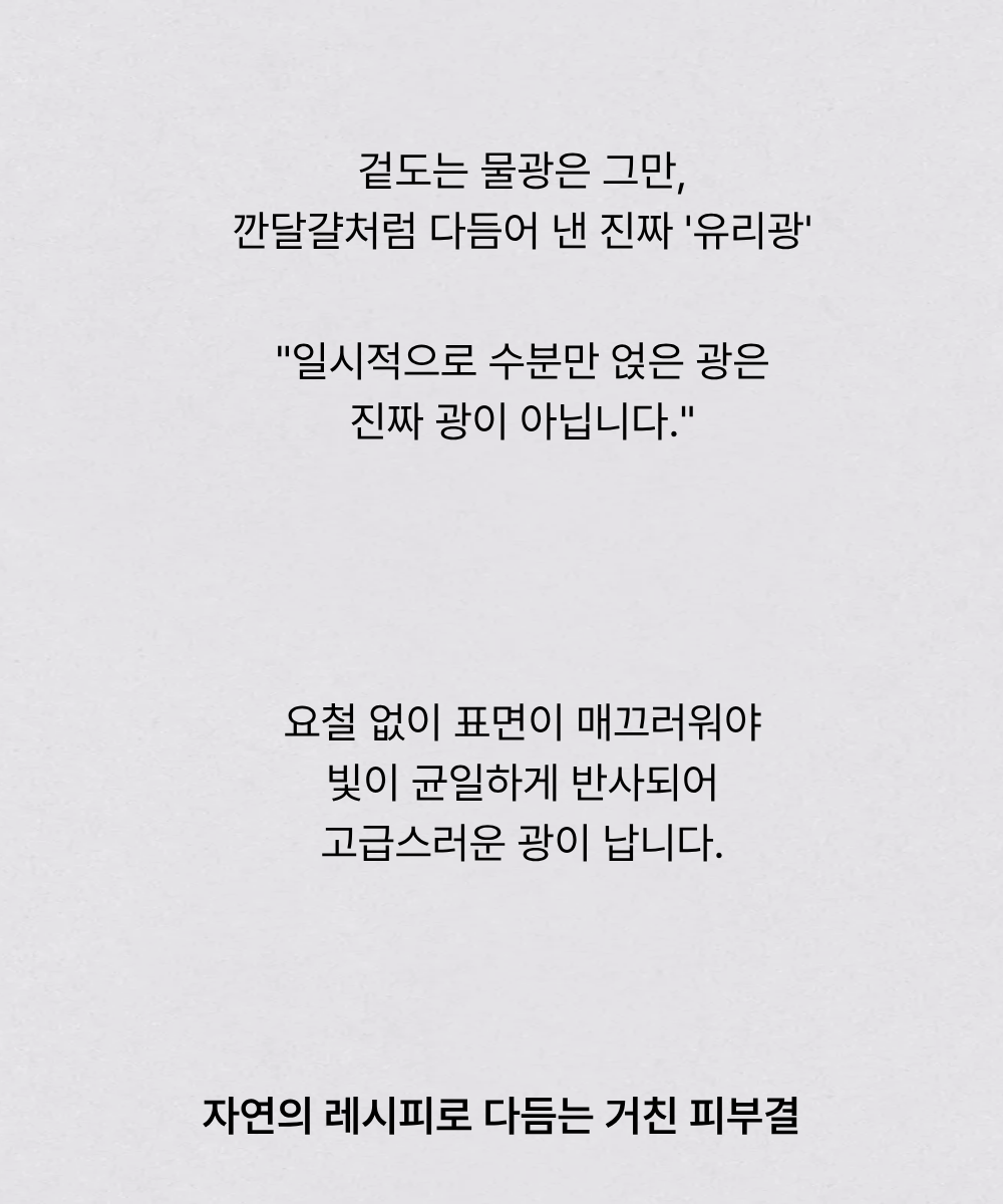 - 설명: 팩을 붙인 채로 그대로 푹 주무셔도 좋습니다! 피부 온도에 반응해 녹아드는 고밀착 하이드로겔 시트가 수분 증발을 완벽히 차단하여, 다음 날 아침 세수하기 아까울 정도의 '최상급 유리광 텐션'을 선사합니다.