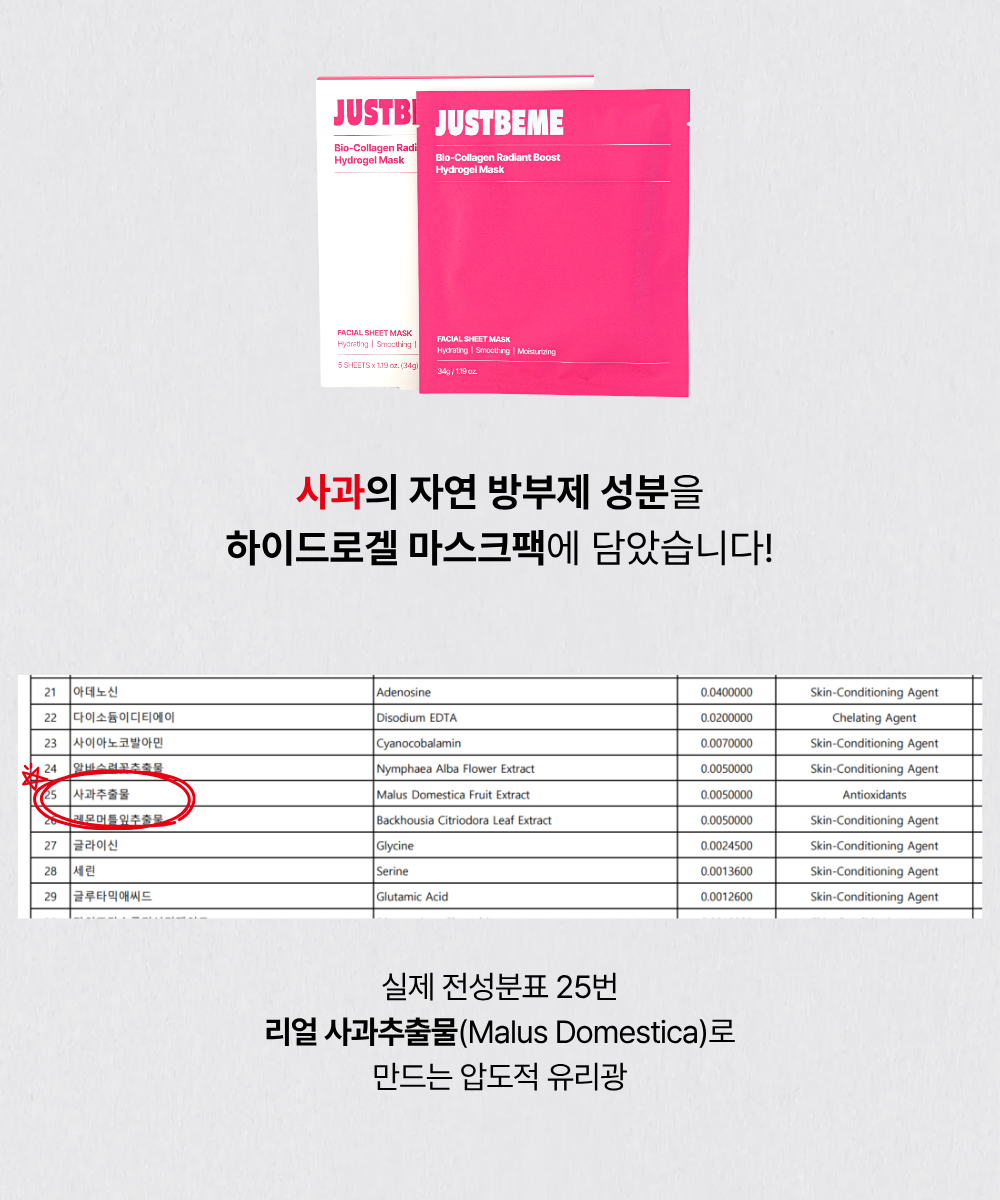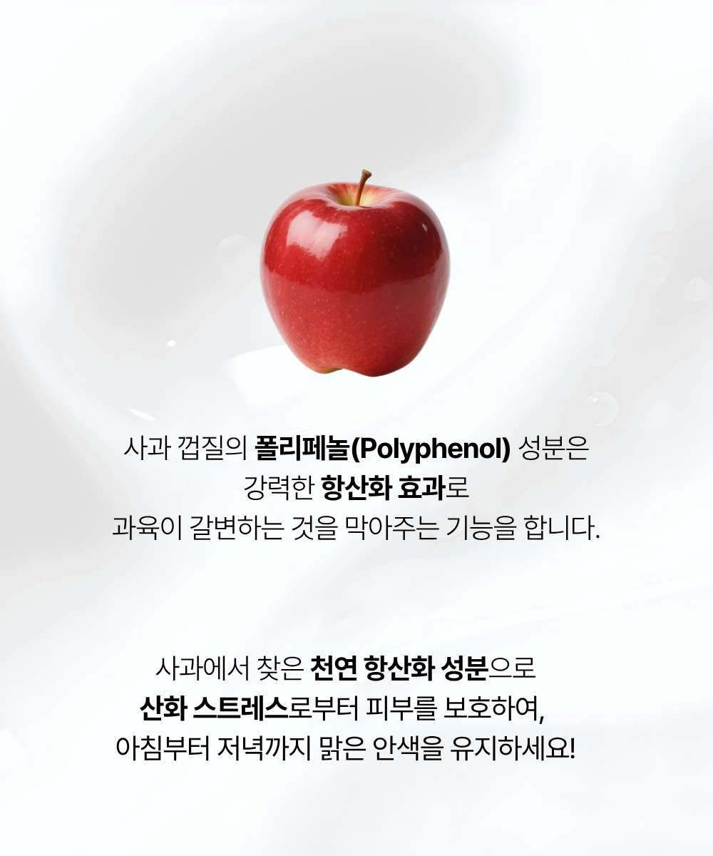 설명: 세안 후 스킨케어 마지막 단계에 여유롭게 붙여주세요. 사과추출물과 아스타잔틴의 유효 성분이 피부 깊숙이 촘촘하게 흡수되며, 팩이 점점 투명하게 변하는 것을 확인할 수 있습니다.