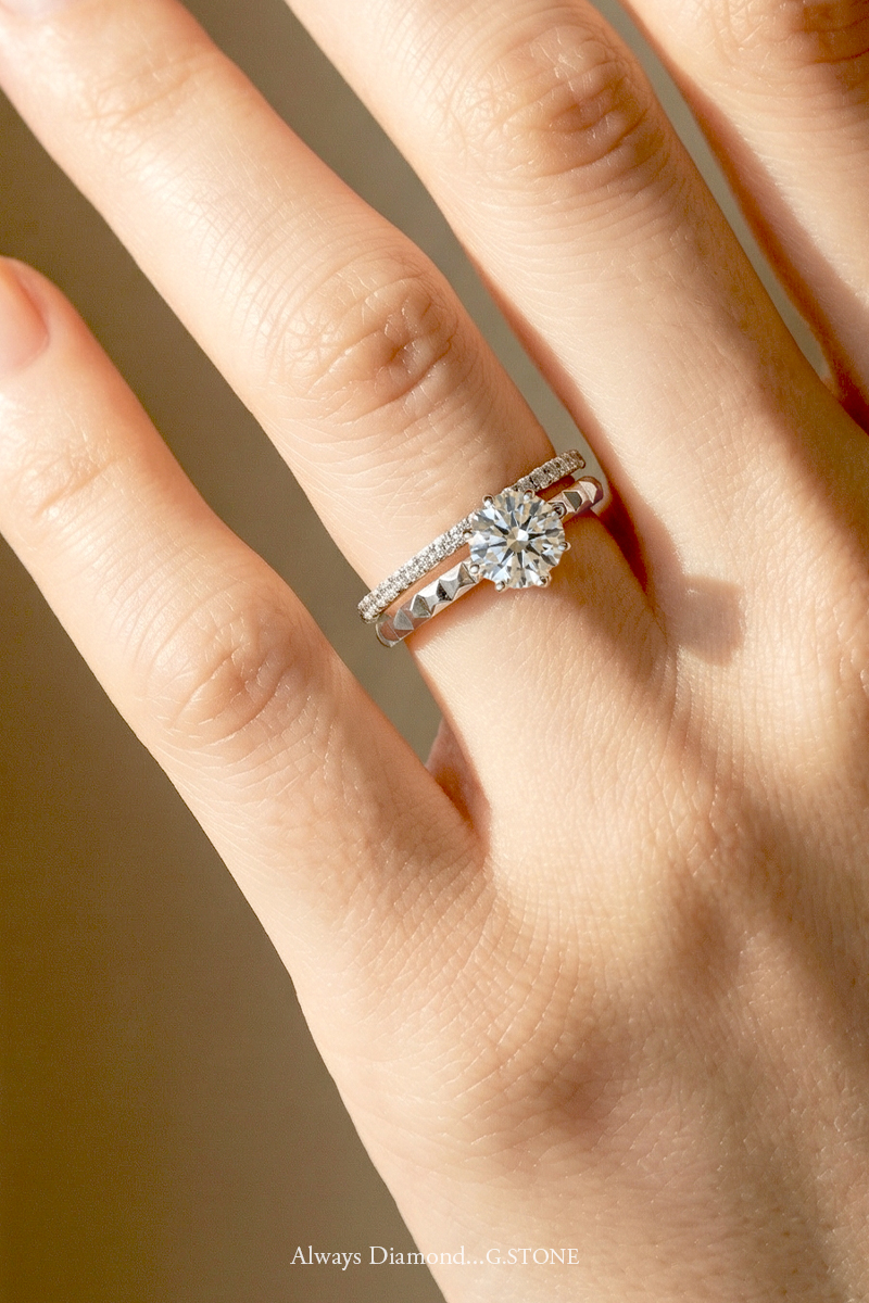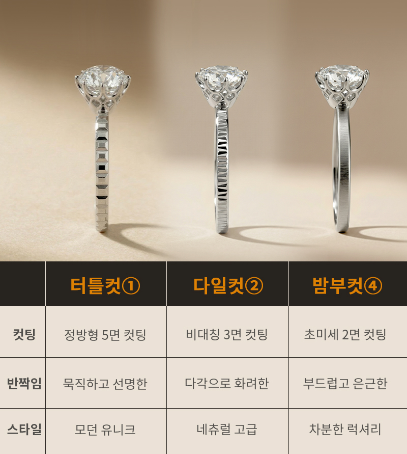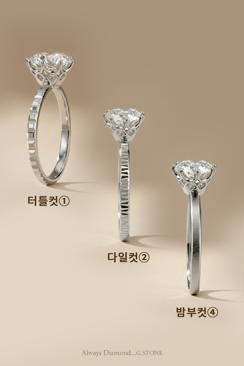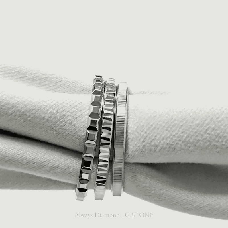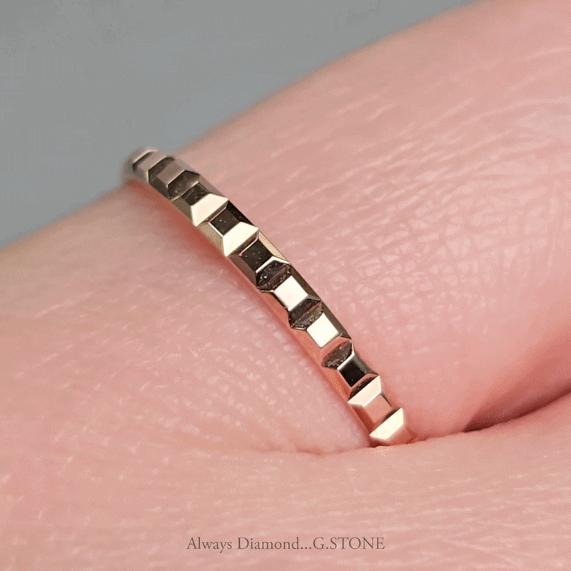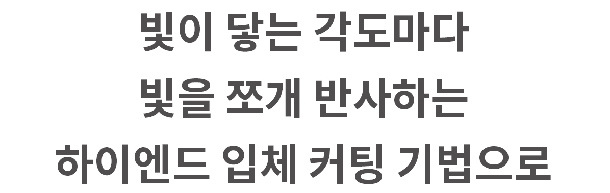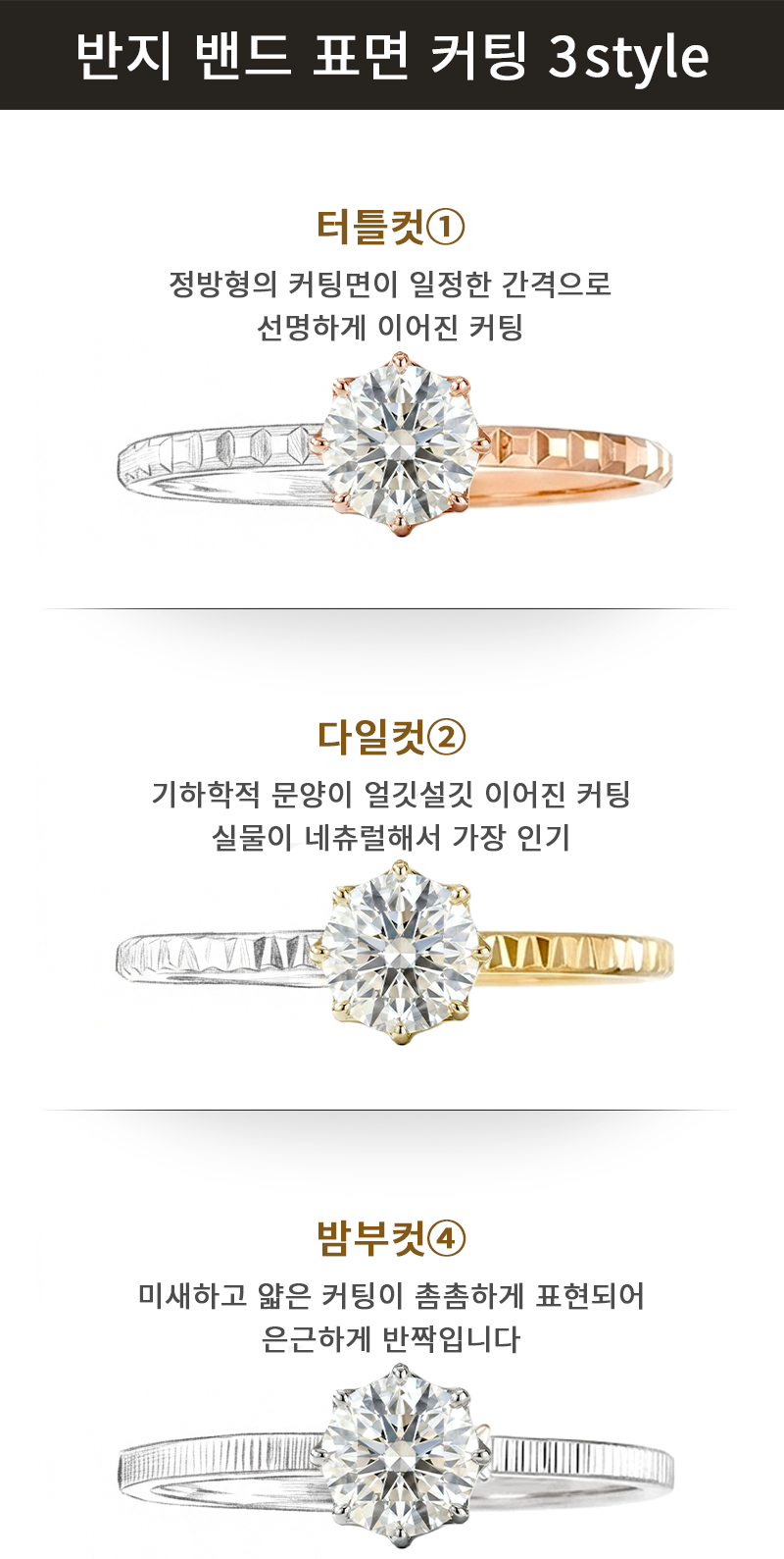 기계적이고 과한 일반 기계커팅과 다르게, 네추럴하고 고급스러워서 오랫동안 질리지 않고 캐럿 반지와 커플링으로도 인기가 많은 유럽 감성의 핸드메이드 커팅 기법