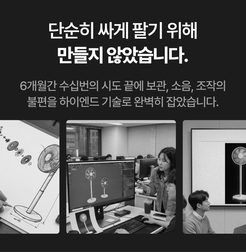 4세대 BLDC 무소음 모터에 전용 가방까지, 전부 다 드리고도 6만원대. 이건 가히 기적입니다. 런칭 특가로 소개하는 가격이라, 진짜 더워지면, 그리고 최근 들어 급격한 환율 인상으로 펀딩 수량이 마감되고 나면 가격은 최소 2만원 이상 오르는 점 너른 양해 부탁드리겠습니다.