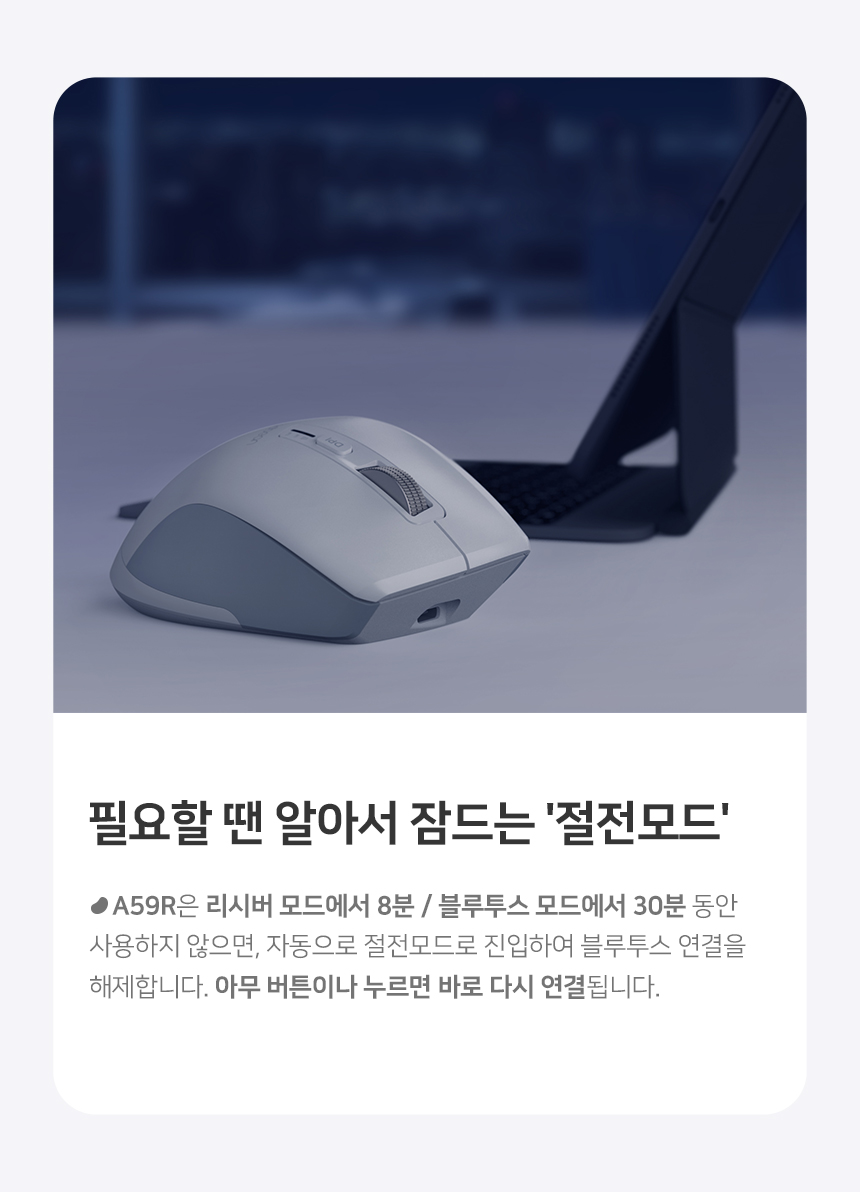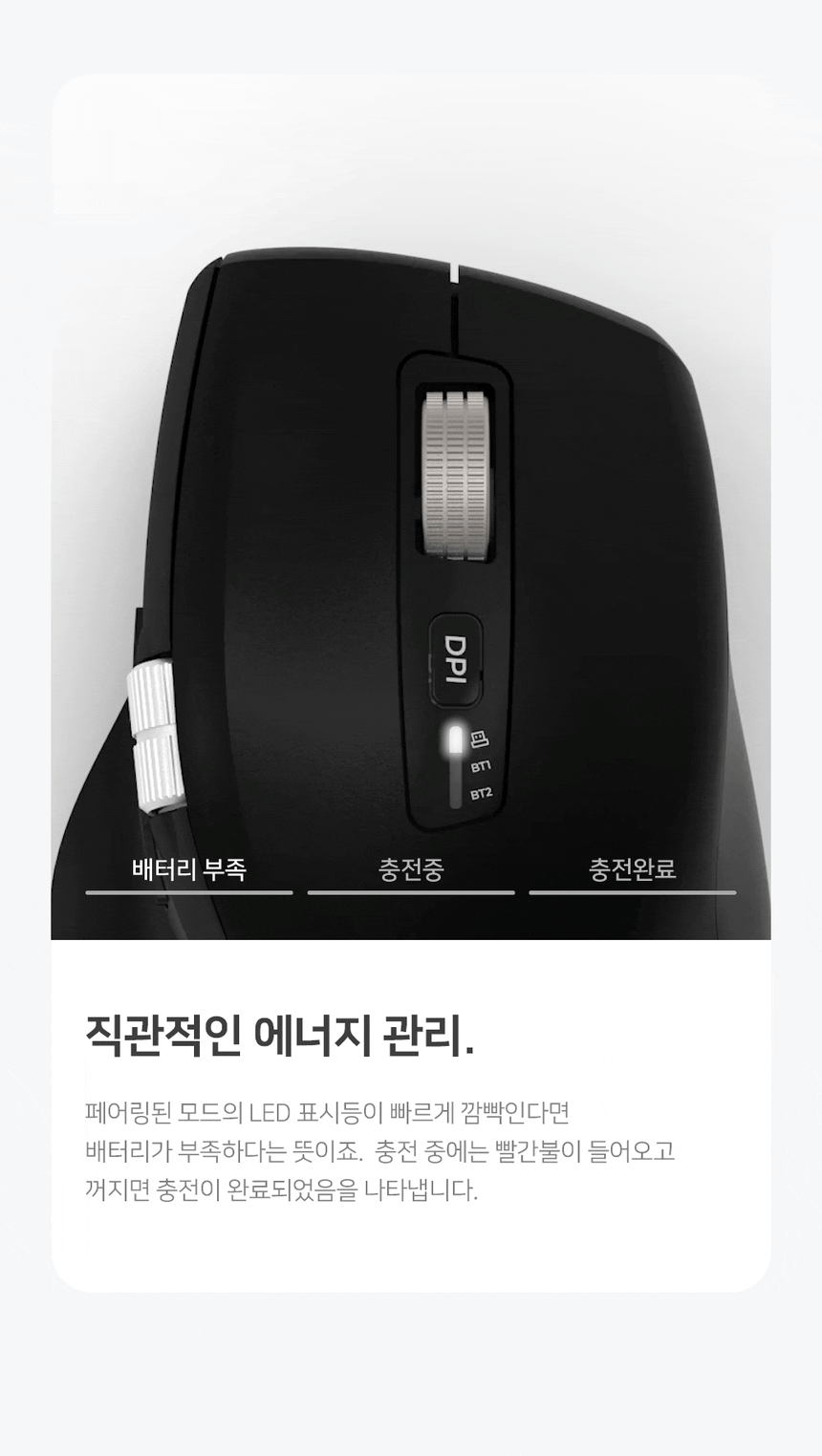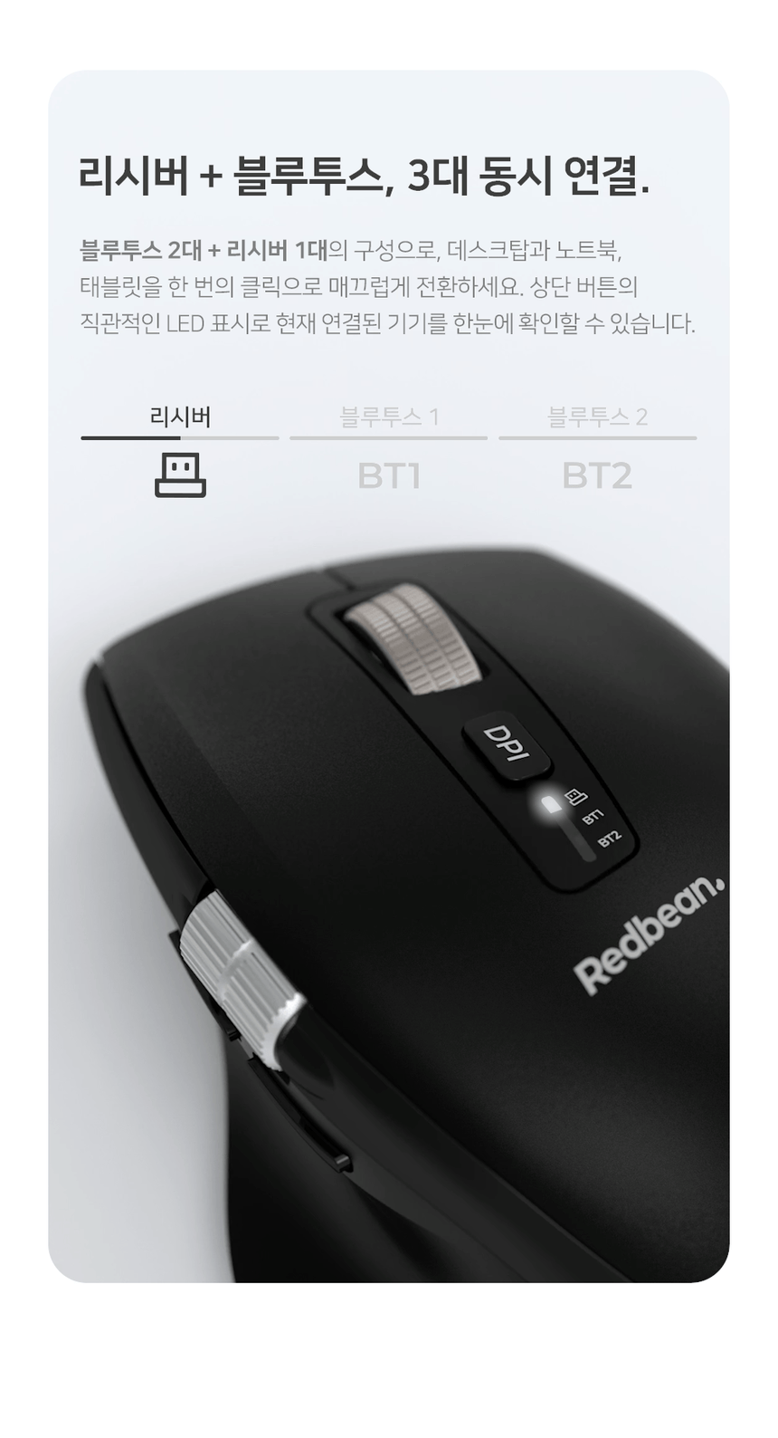 기기마다, 사용할 때마다 마우스를 찾고 리시버를 바꿔 꽂을 필요가 없습니다. 총 3대를 동시 연결하며, 버튼 한 번으로 현재 연결된 기기를 바꿔가며 전환할 수 있습니다.