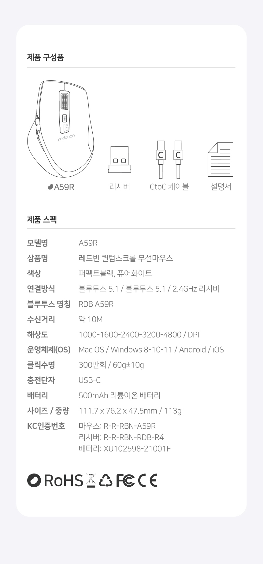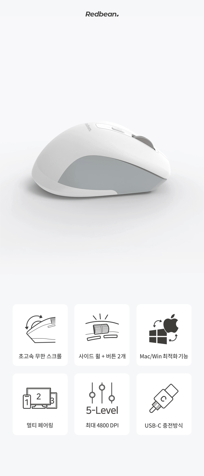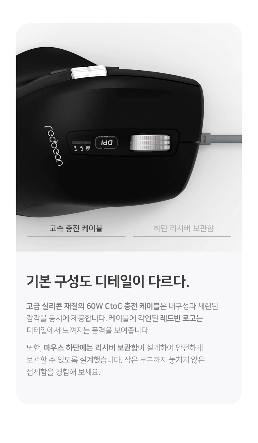 마우스 하단에는 자주 잃어버리는 리시버를 보관할 수 있도록 설계했고, C타입 충전 케이블은 고급실리콘 소재와 레드빈 로고를 각인하여 잦은 고장을 줄이고, 사용이 편리하면서 고급스럽게 설계하였습니다.
