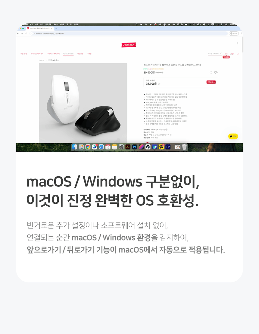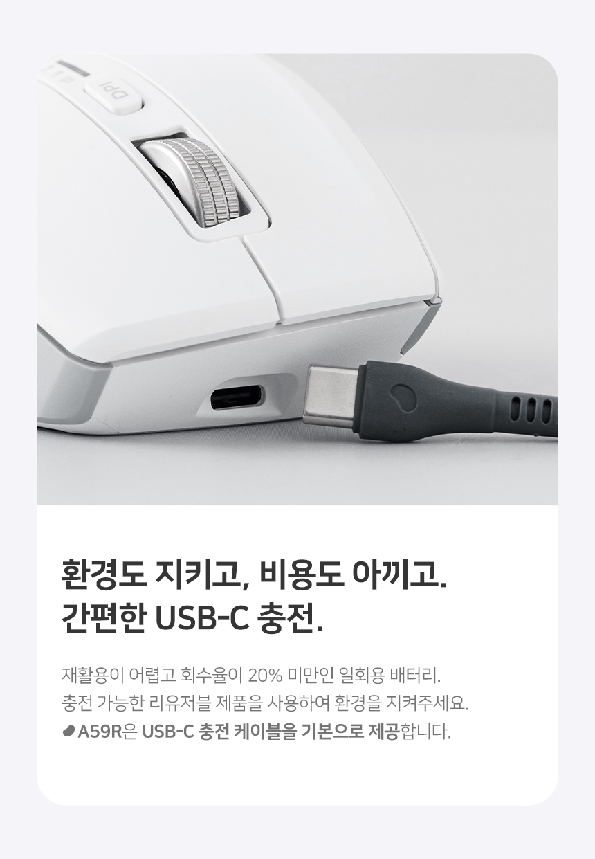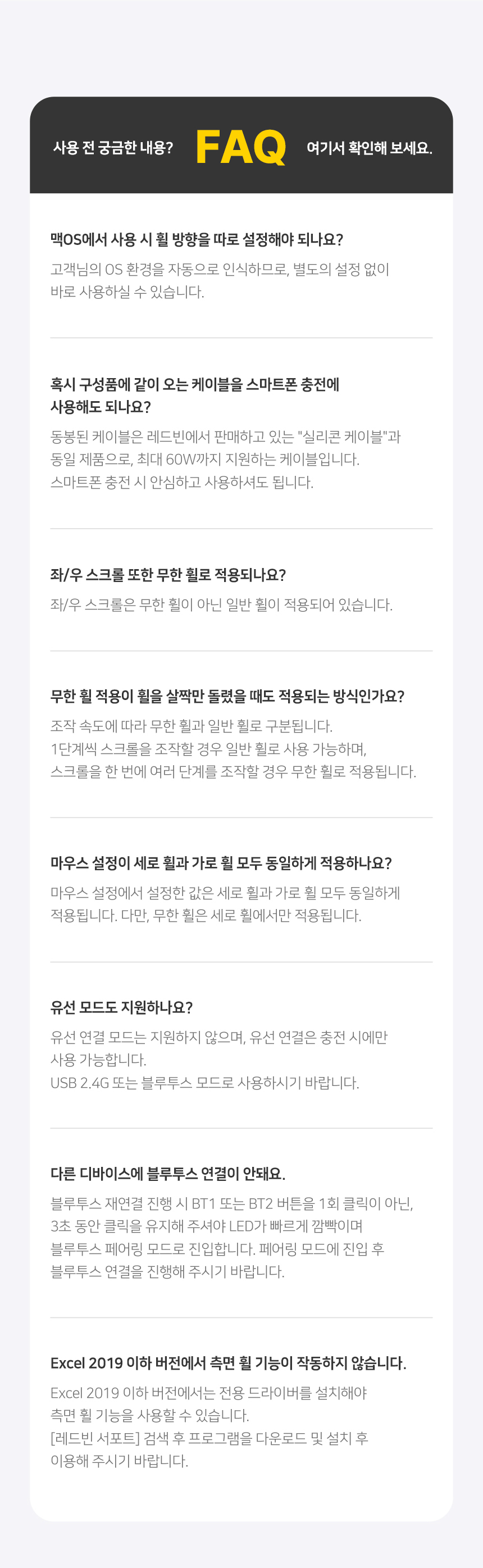 마우스 하단에는 자주 잃어버리는 리시버를 보관할 수 있도록 설계했고, C타입 충전 케이블은 고급실리콘 소재와 레드빈 로고를 각인하여 잦은 고장을 줄이고, 사용이 편리하면서 고급스럽게 설계하였습니다.