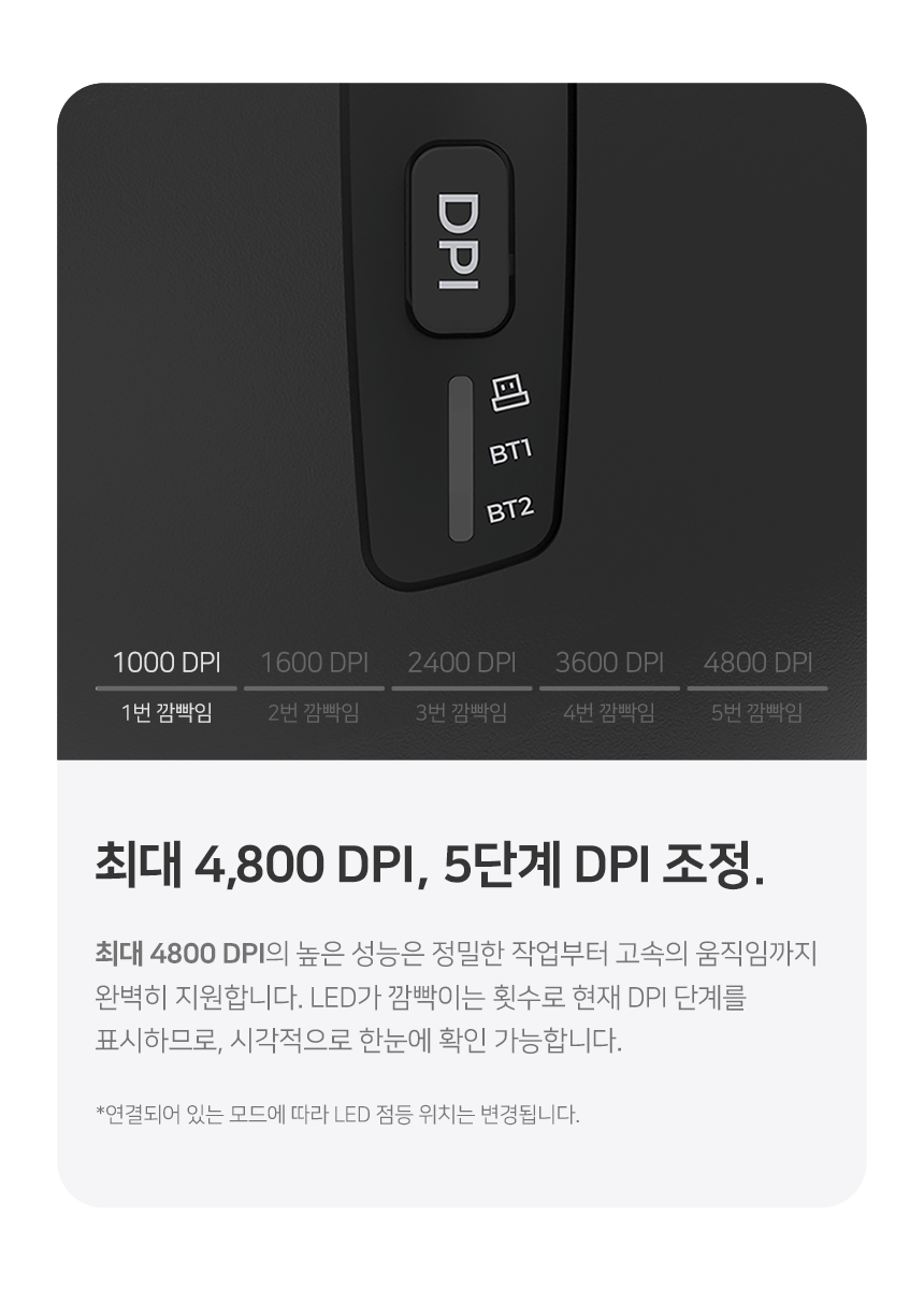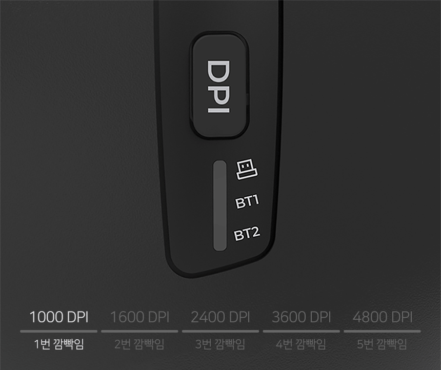 즉, 내가 마우스를 사용하는 목적에 따라 효율을 향상시키기 위해 DPI 값을 버튼 한 번에 조정해서 총 5단계로 사용할 수 있으며, 고급 마우스 기능 중 하나입니다.