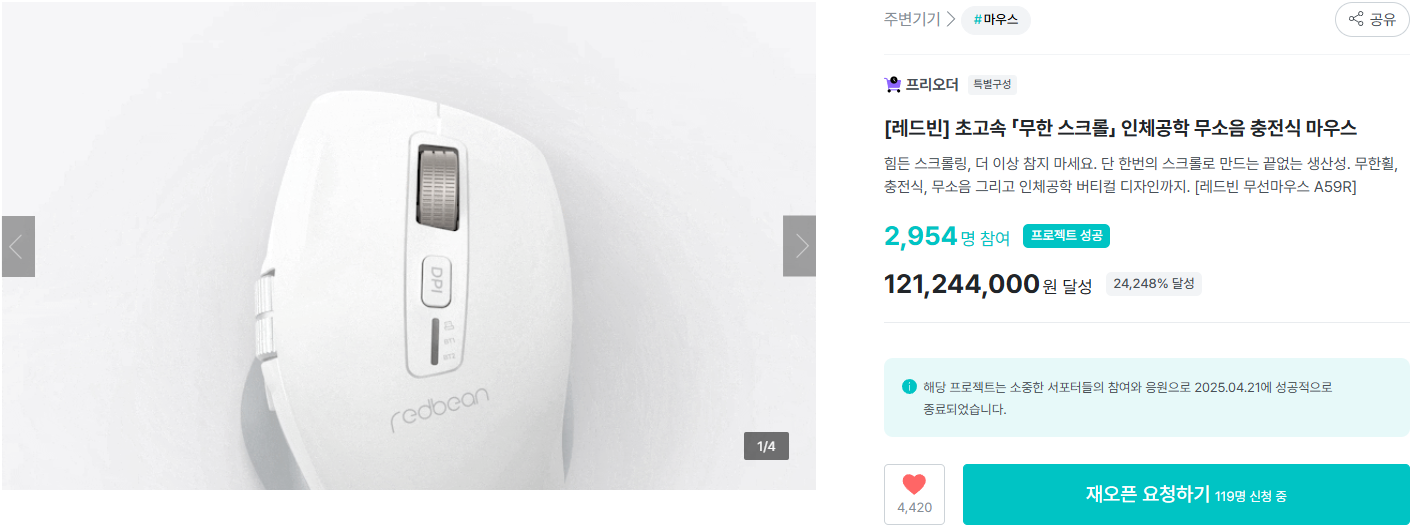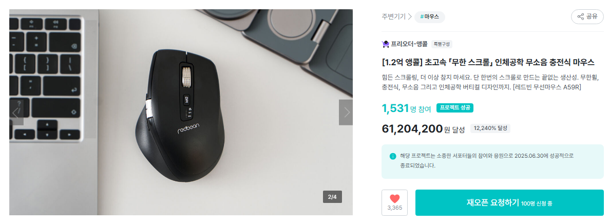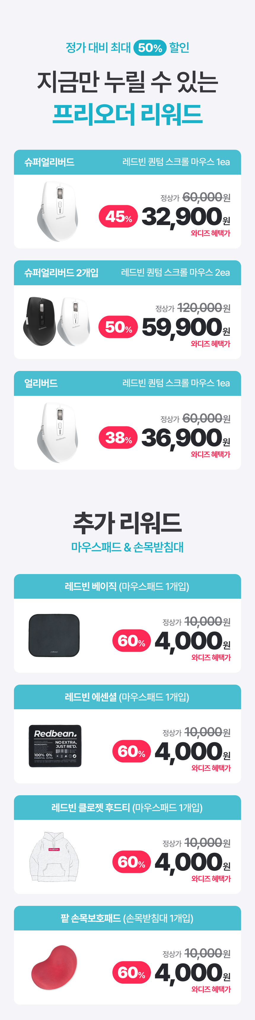 와디즈 서포터분들이 먼저 알아봐 주신 가치, 이제 한국 최대 플랫폼 네이버에서도 1등으로 증명했습니다. 지난 프리오더 레드빈 퀀텀 마우스에 많은 사랑과 관심을 보내주신 서포터님들께 다시 한번 감사의 말씀 전합니다. 많은 서포터님들께서 높은 평점과 앵콜요청으로 다시 한번 와디즈 특별 혜택으로 돌아왔습니다.