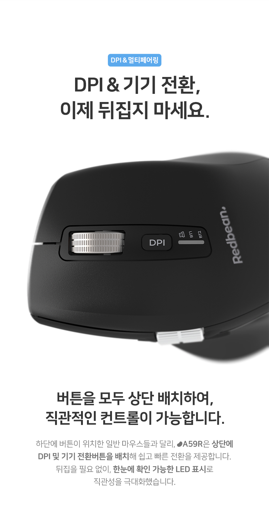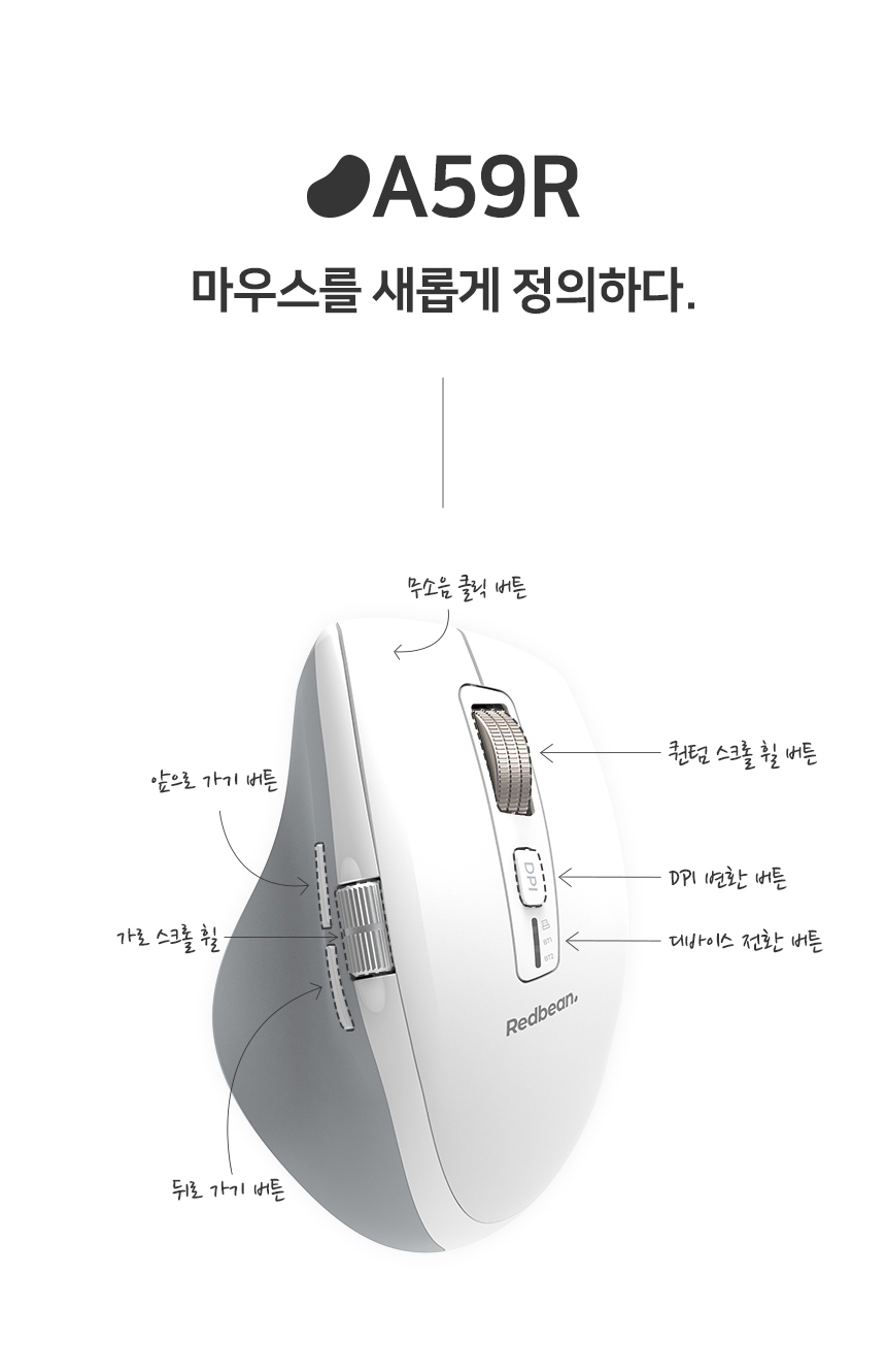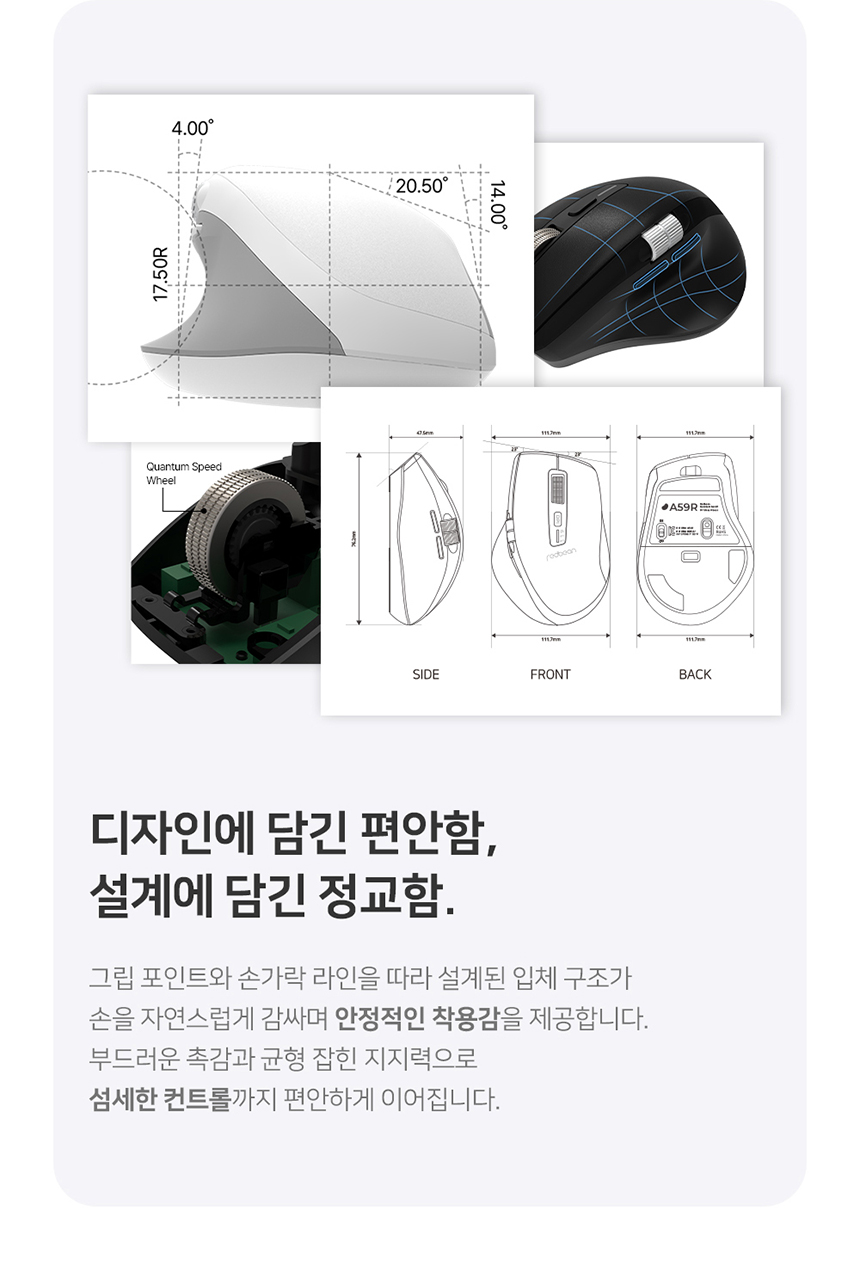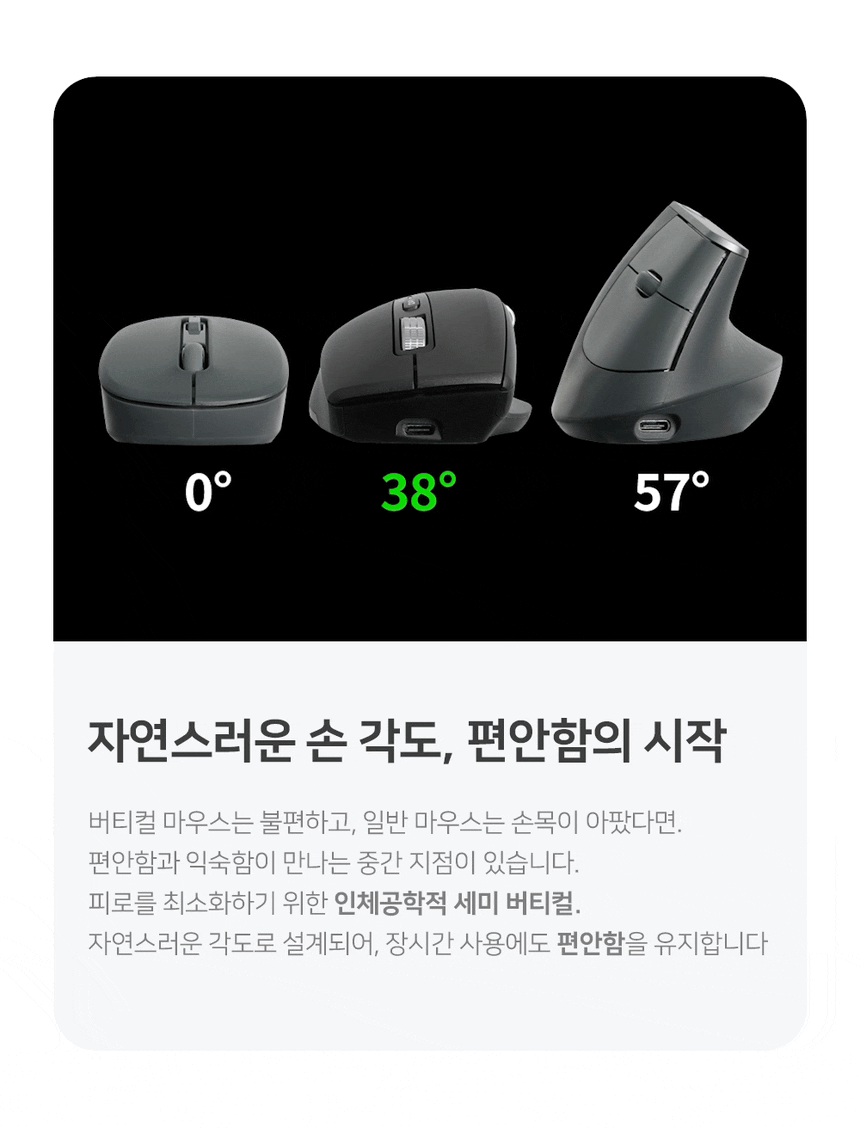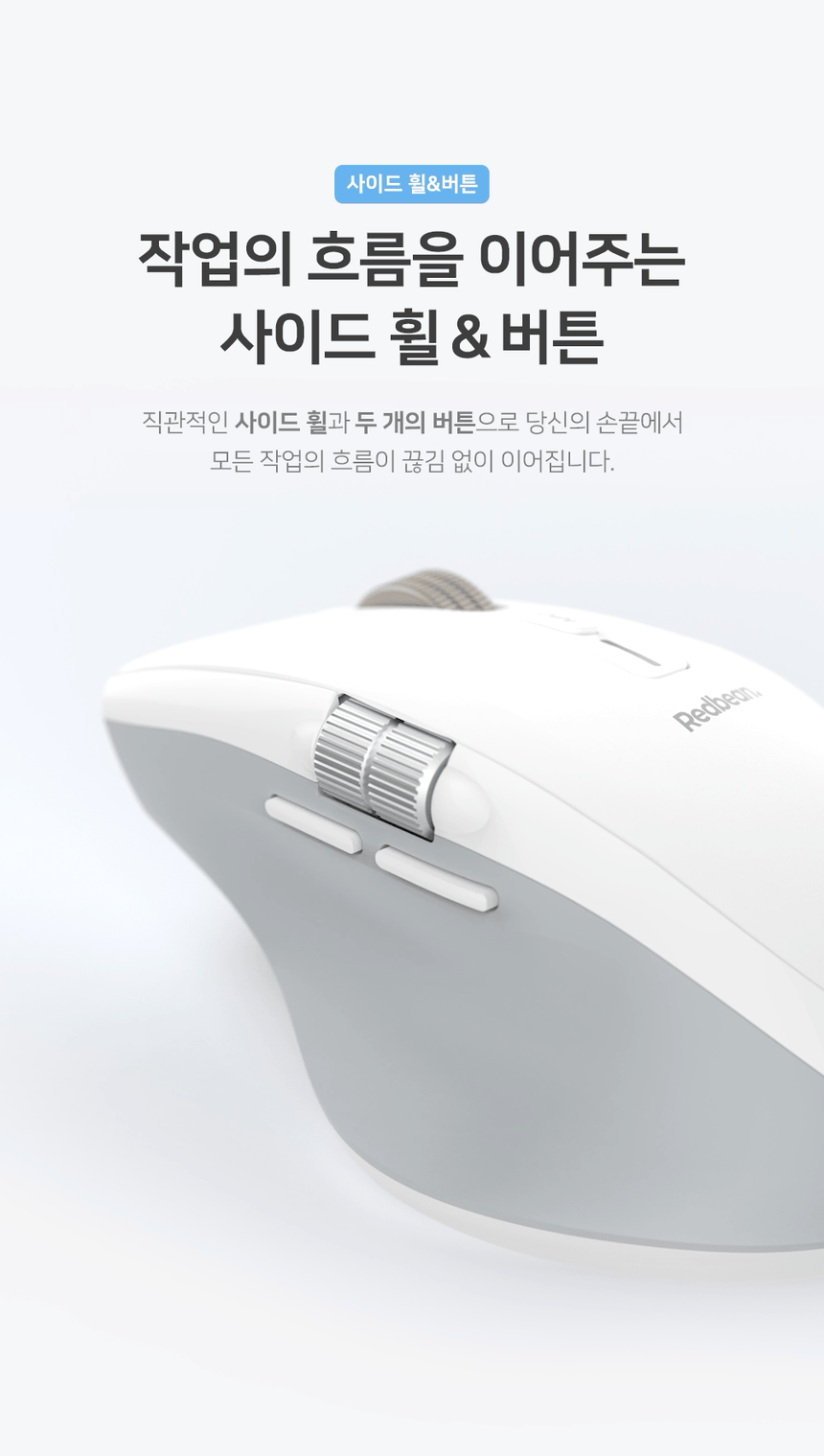 버티컬 마우스는 불편하고, 일반 마우스는 손목이 아팠다면. 이번 무한스크롤 마우스는 '세미 버티컬 디자인' 입니다. 장시간 사용에도 손목에 부담이 적으며, 손에 착 감기는 기분좋은 그립감을 느껴보실 수 있습니다.