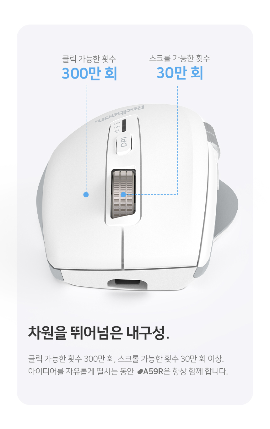 오래도록 손에 착 감겨 쓸 수 있도록. 클릭 가능한 횟수 300만회, 스크롤은 무려 30만회. 믿고쓰는 레드빈이니까 가능하죠. 든든한 내구성으로 좋은 마우스를 오래도록 쓰세요.