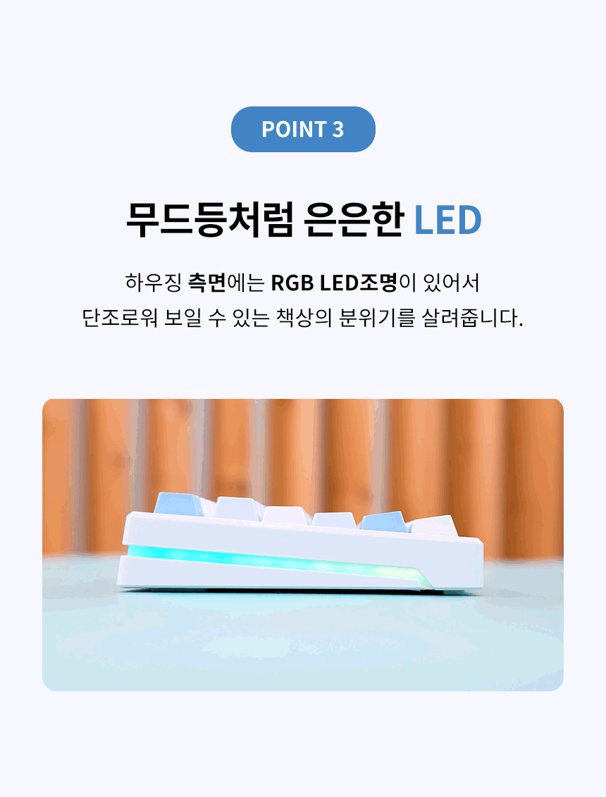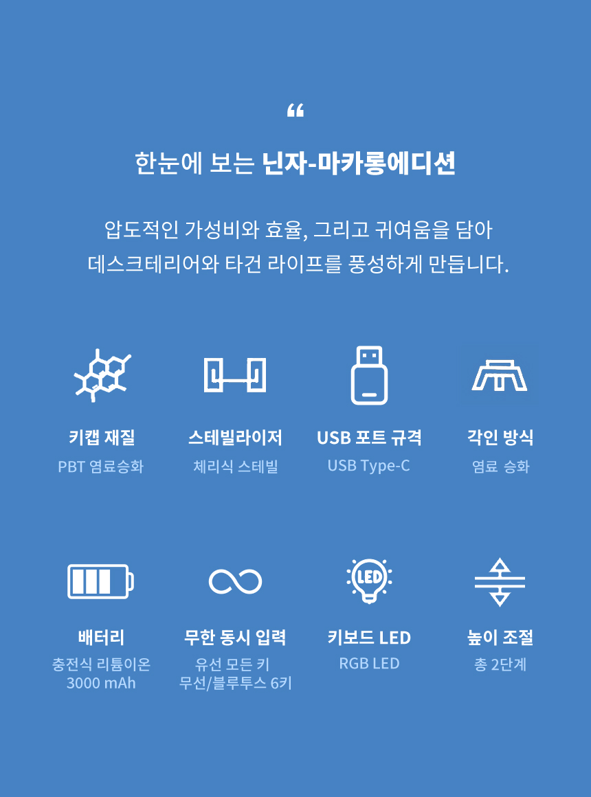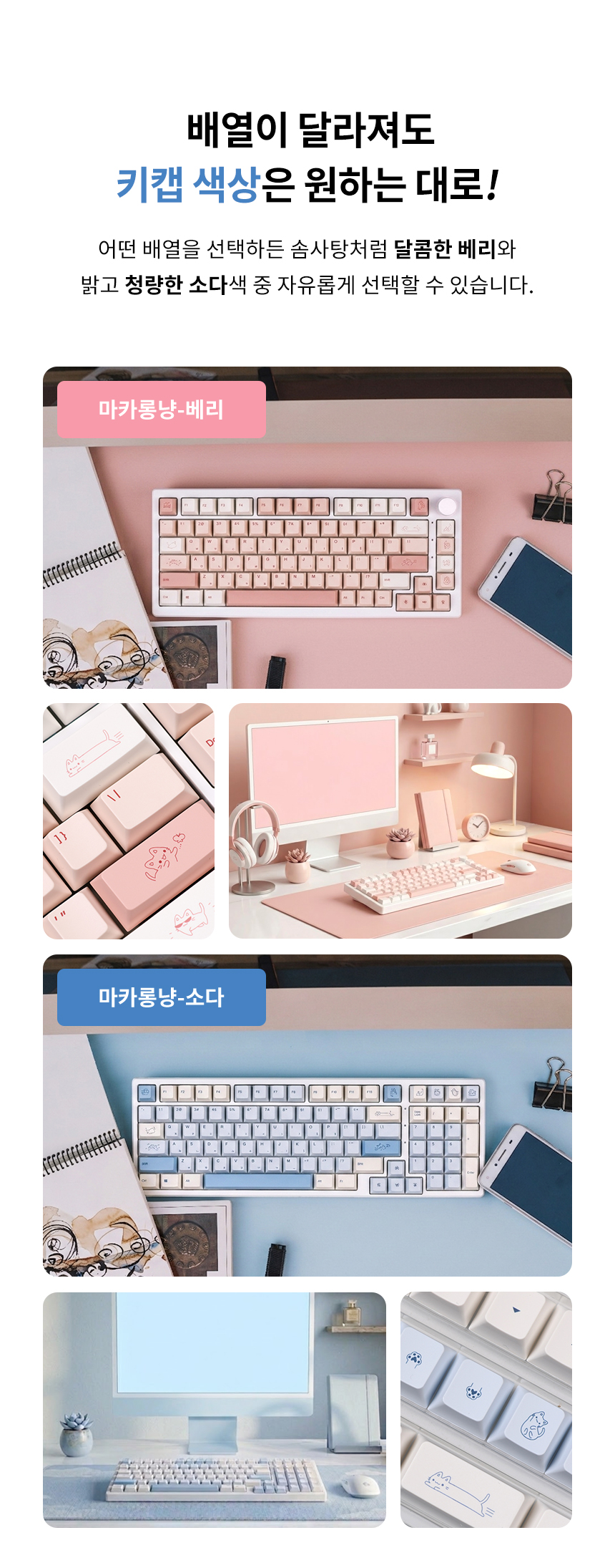 1. ⌨️ 프리미엄 기계식 키보드 - 마카롱 감성 컬러와 완성도 높은 디자인 제공 2. 🎨 맞춤형 키캡 색상 선택 - 베리·소다 색상으로 개인 취향 반영 가능 3. 🔋 유·무선 연결과 대용량 배터리 - USB C, 블루투스, 3000mAh 배터리 탑재