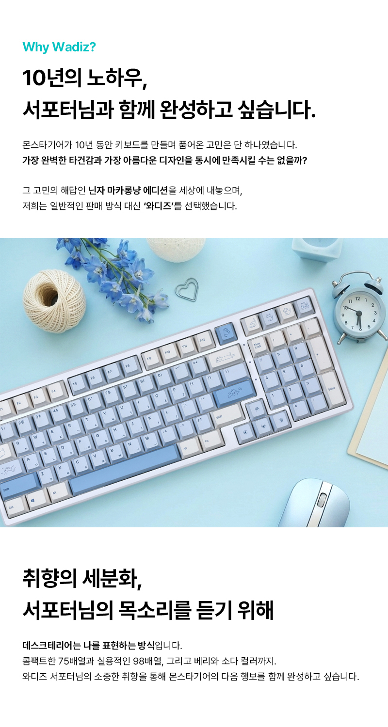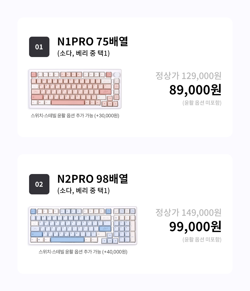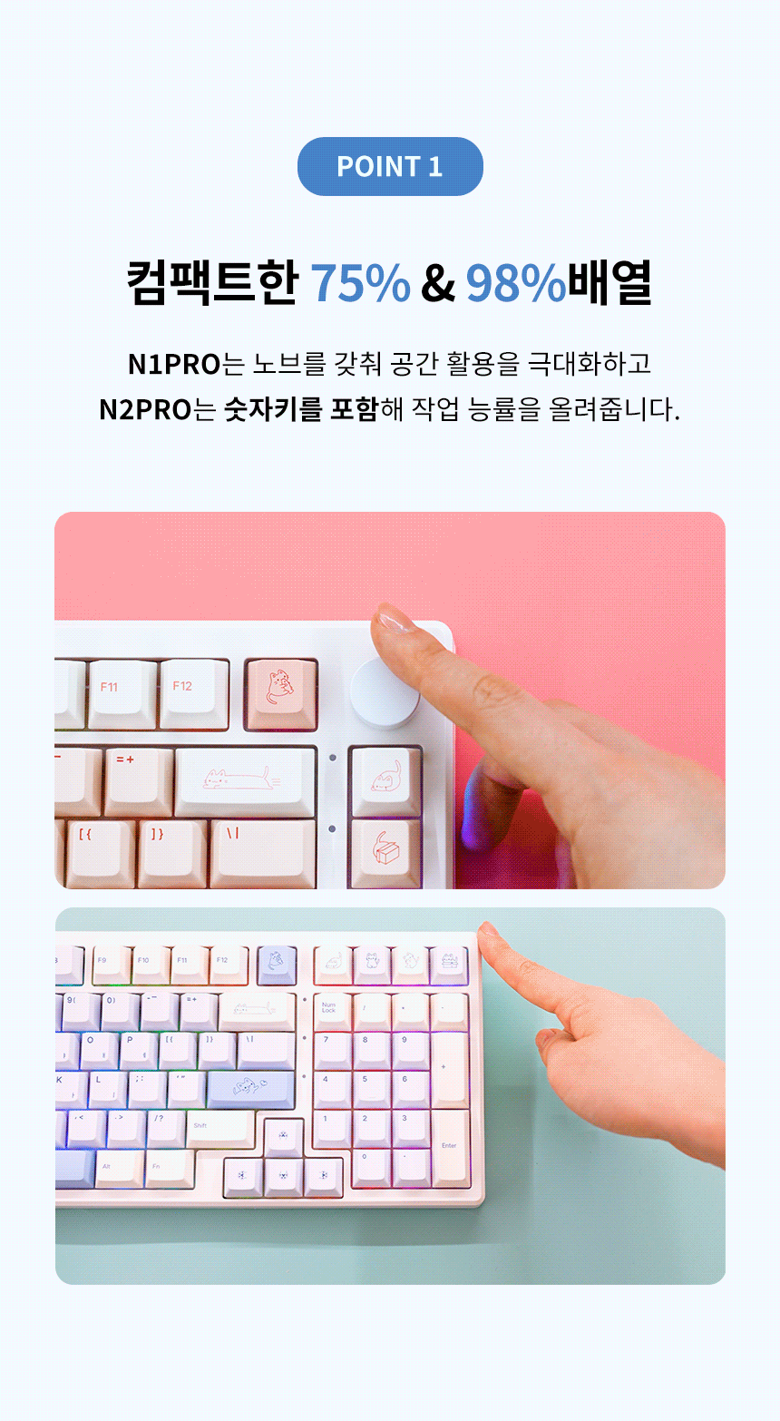 1. ⌨️ 프리미엄 기계식 키보드 - 마카롱 감성 컬러와 완성도 높은 디자인 제공 2. 🎨 맞춤형 키캡 색상 선택 - 베리·소다 색상으로 개인 취향 반영 가능 3. 🔋 유·무선 연결과 대용량 배터리 - USB C, 블루투스, 3000mAh 배터리 탑재
