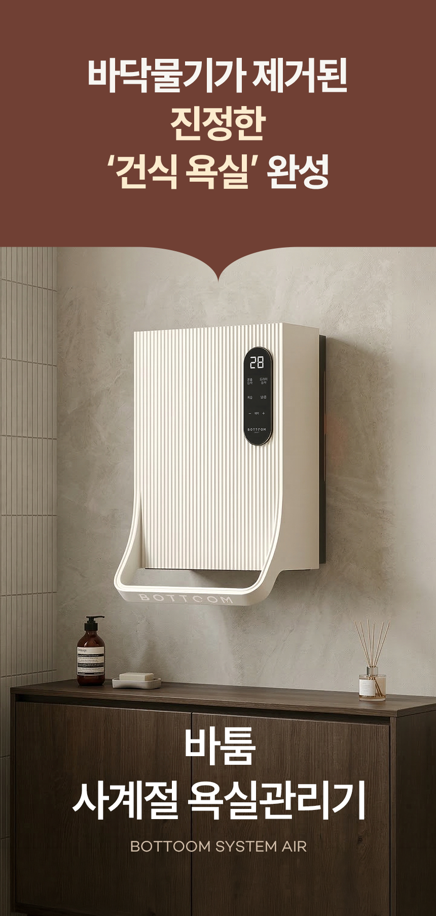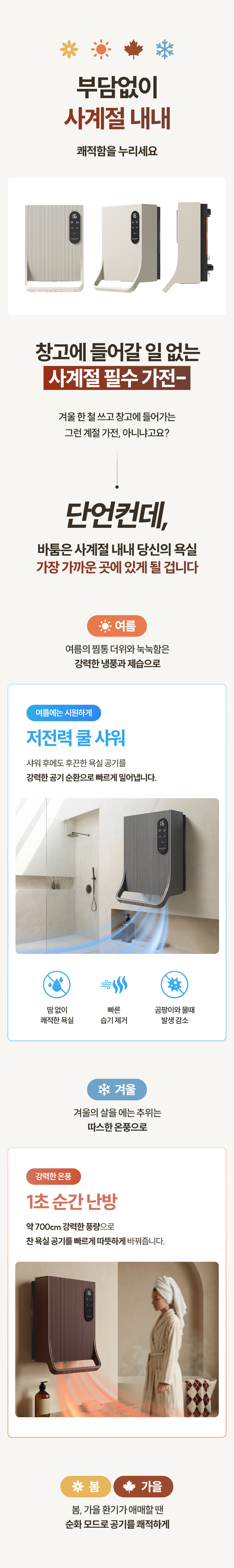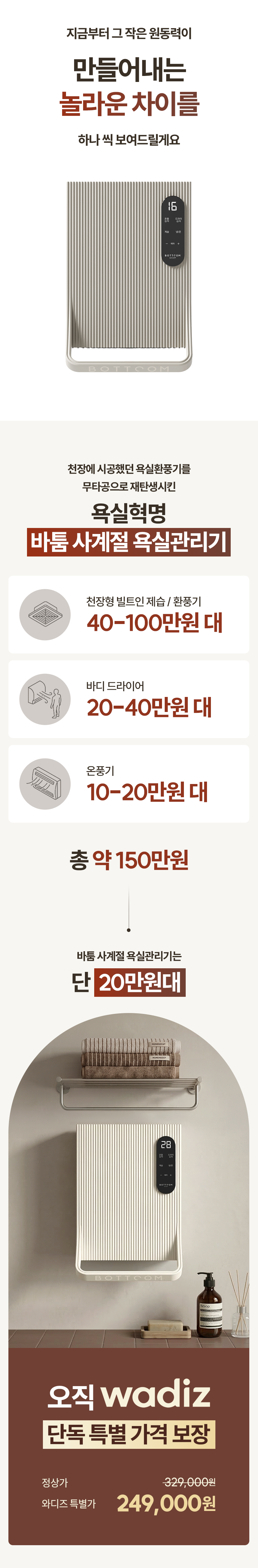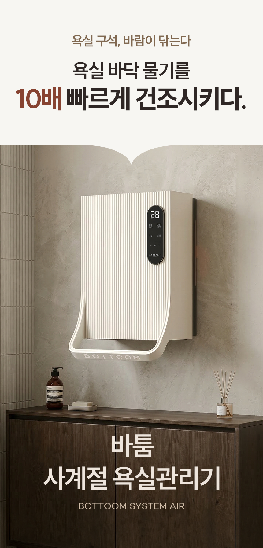 1. 💨 초강력 욕실 건조기 - 풍속 8.3m/s로 욕실 바닥 물기 10배 빠르게 건조 2. 🌦️ 사계절 쾌적 욕실 관리 - 제습, 냉풍, 온풍, 바디드라이 기능 통합 제공 3. 🎯 와디즈 단독 특별가 - 249,000원 단독가로 경제적 부담 대폭 감소