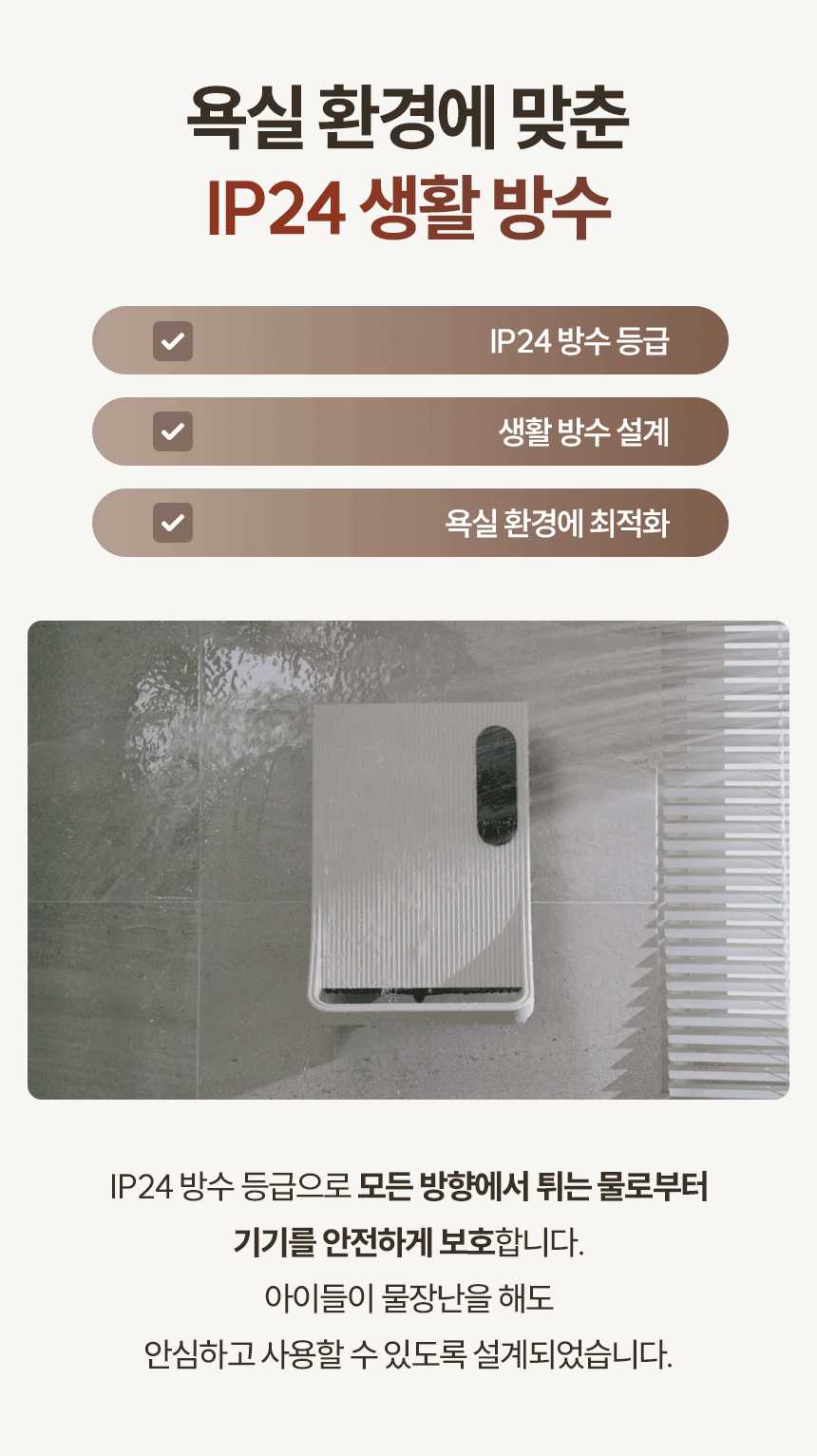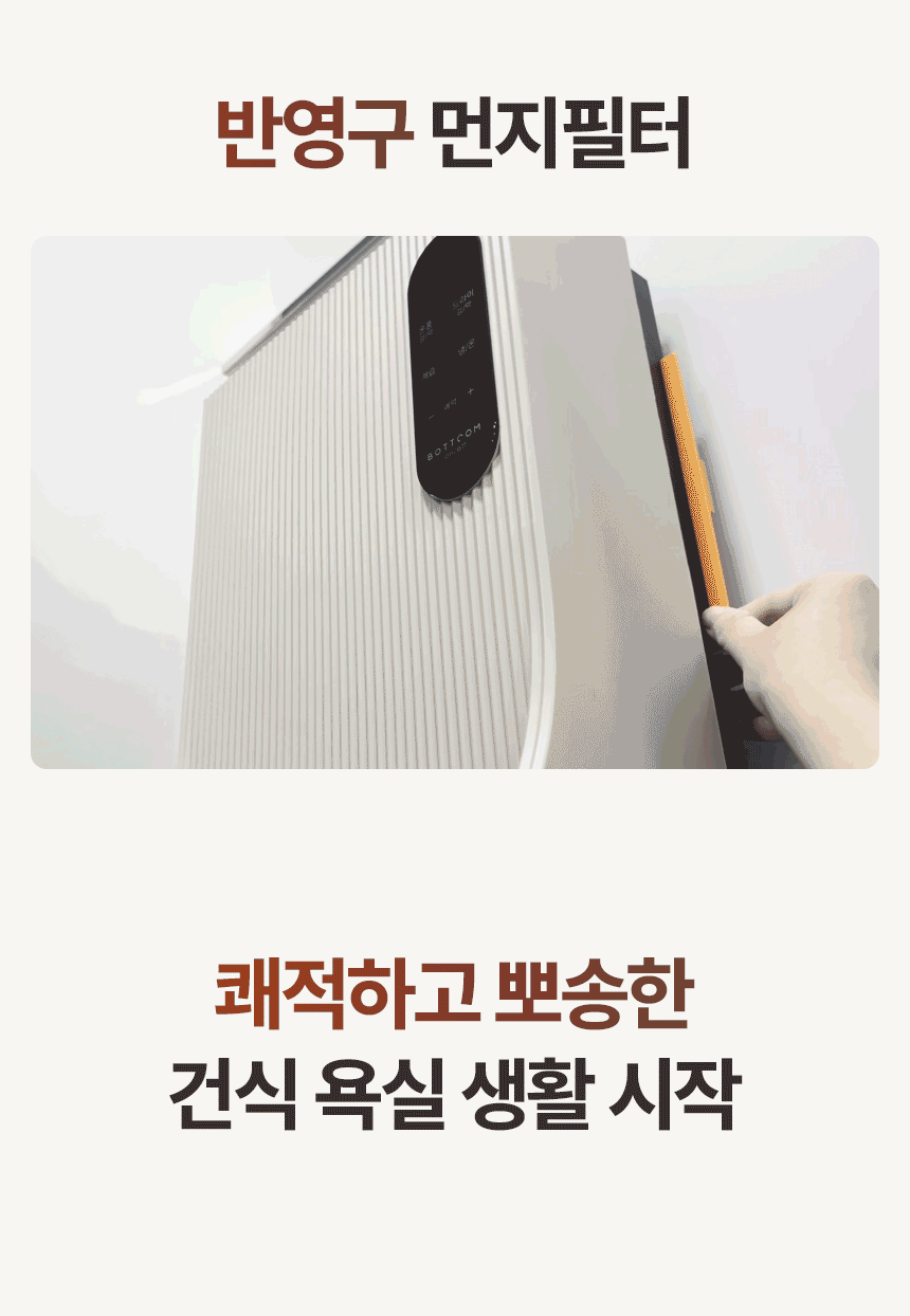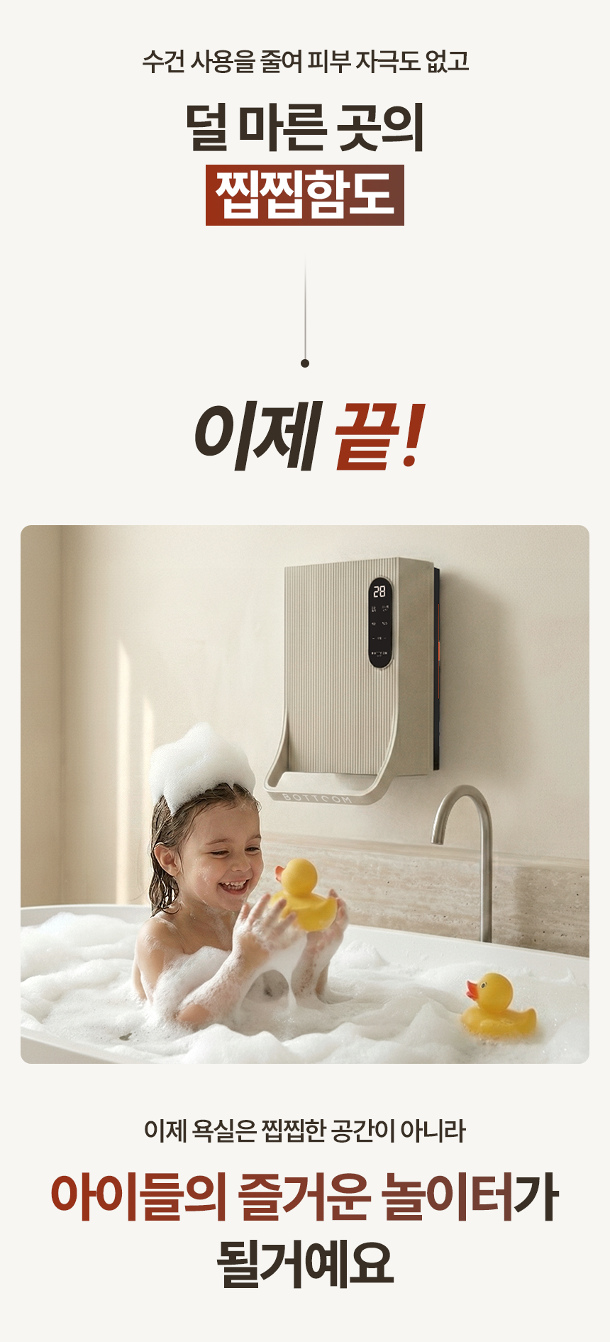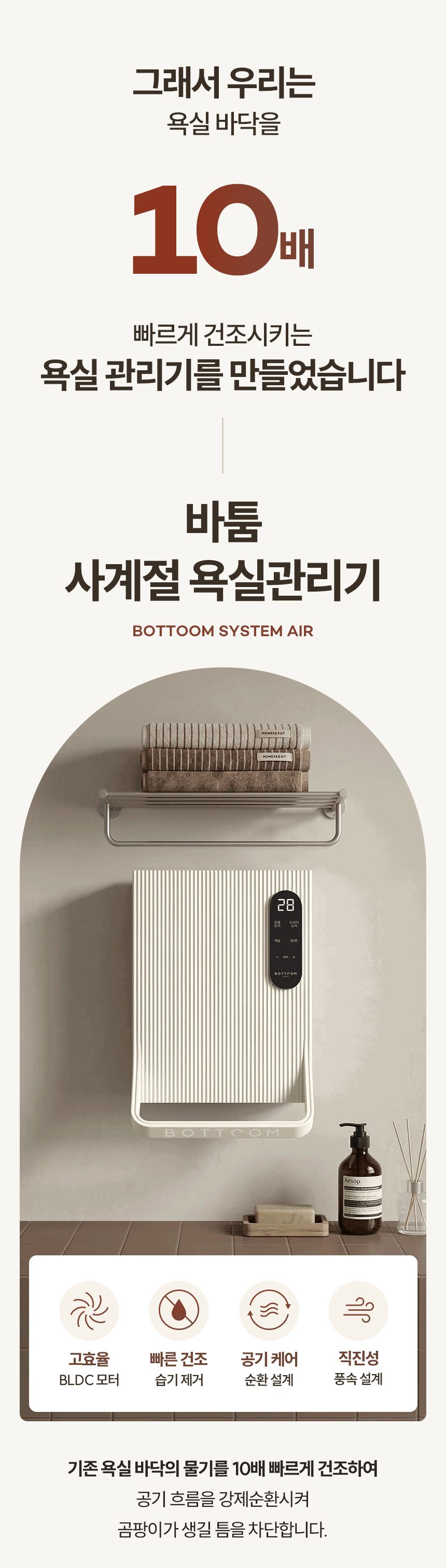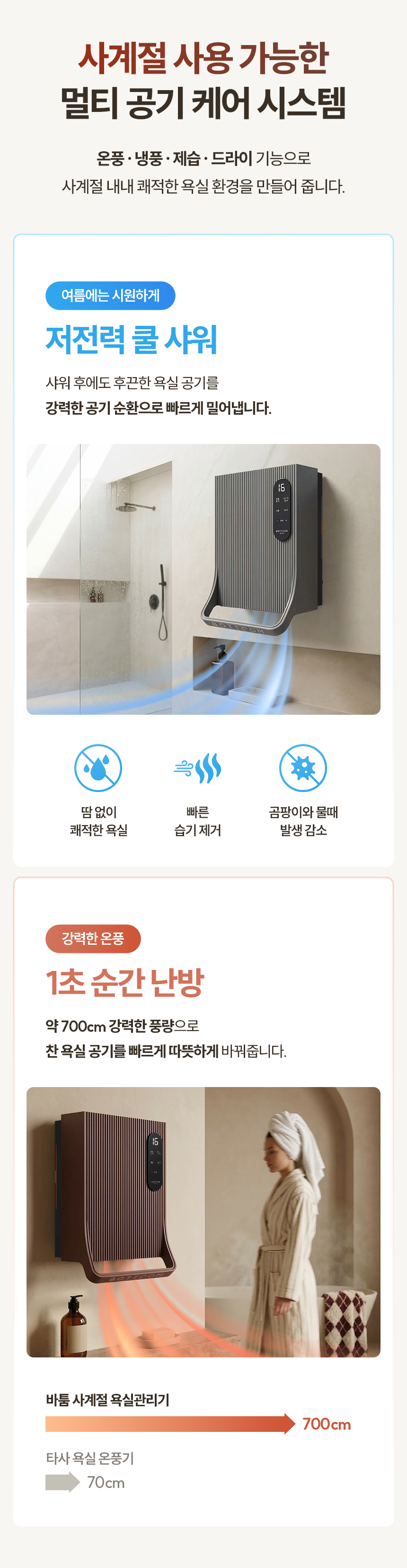 1. 💨 초강력 욕실 건조기 - 풍속 8.3m/s로 욕실 바닥 물기 10배 빠르게 건조 2. 🌦️ 사계절 쾌적 욕실 관리 - 제습, 냉풍, 온풍, 바디드라이 기능 통합 제공 3. 🎯 와디즈 단독 특별가 - 249,000원 단독가로 경제적 부담 대폭 감소