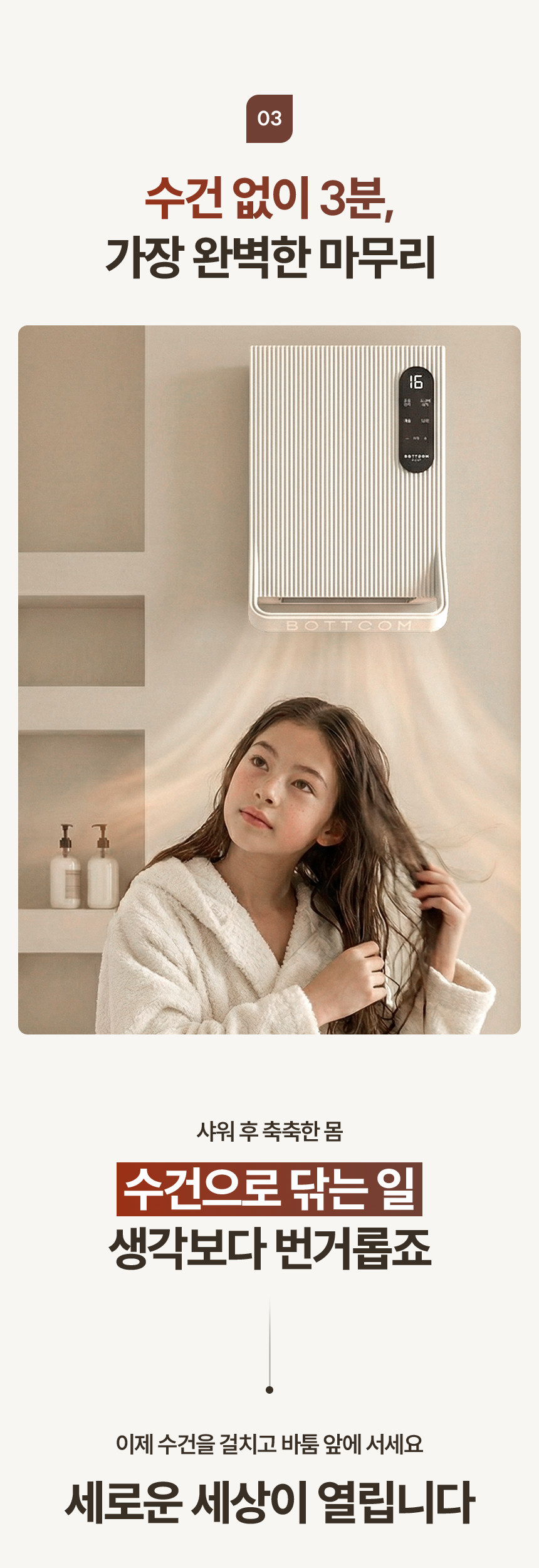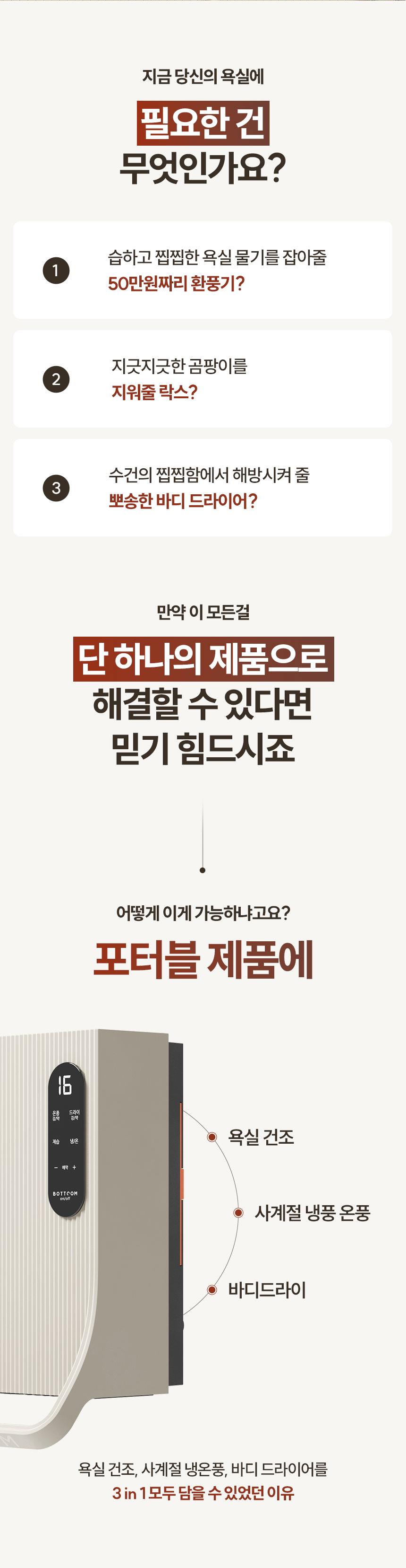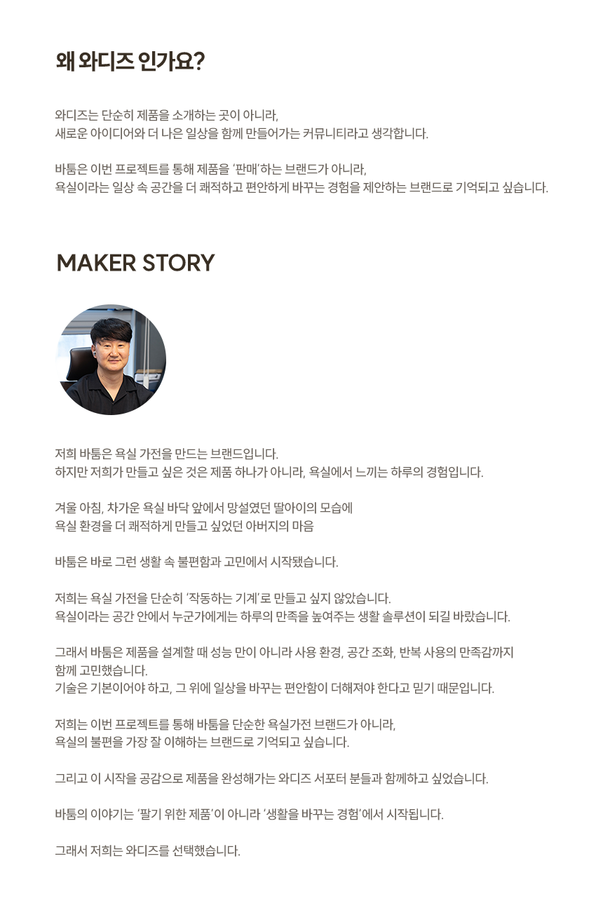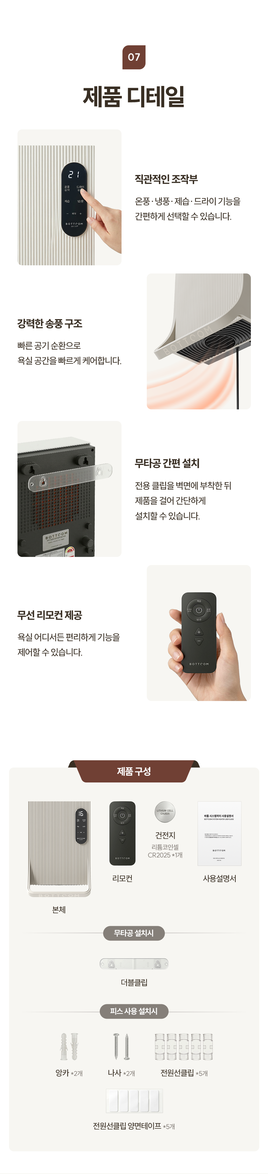 1. 💨 초강력 욕실 건조기 - 풍속 8.3m/s로 욕실 바닥 물기 10배 빠르게 건조 2. 🌦️ 사계절 쾌적 욕실 관리 - 제습, 냉풍, 온풍, 바디드라이 기능 통합 제공 3. 🎯 와디즈 단독 특별가 - 249,000원 단독가로 경제적 부담 대폭 감소