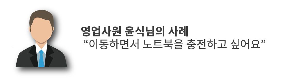 점심쯤 지나가면 노트북 배터리는 거의 닳아 있어요. 영업 담당자의 기본은 이동성이기에, 어디에 고정해 두고 충전할 수가 없어요. 이동하면서 노트북을 충전할 보조배터리가 있나요?