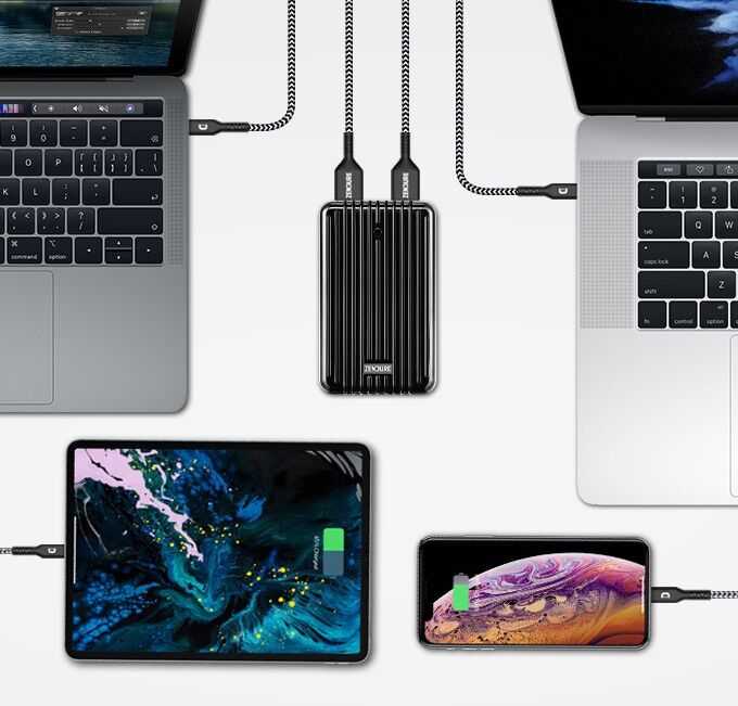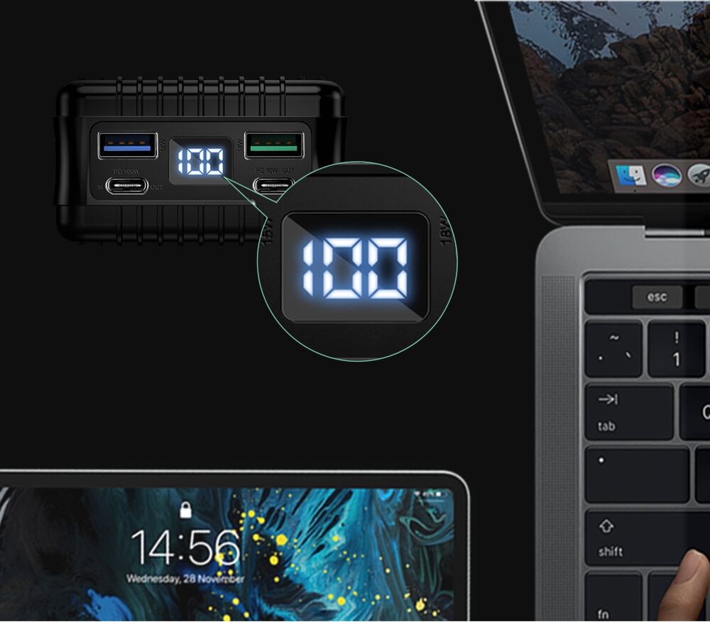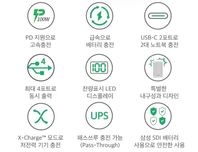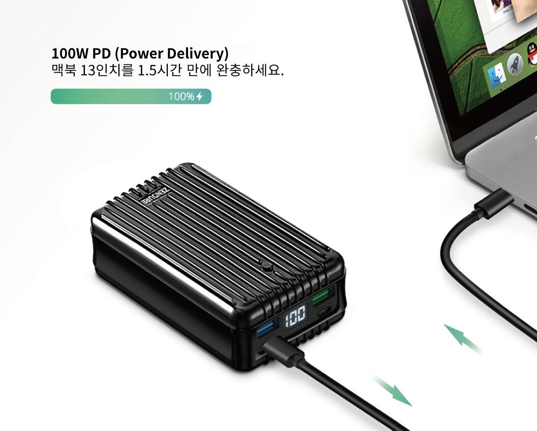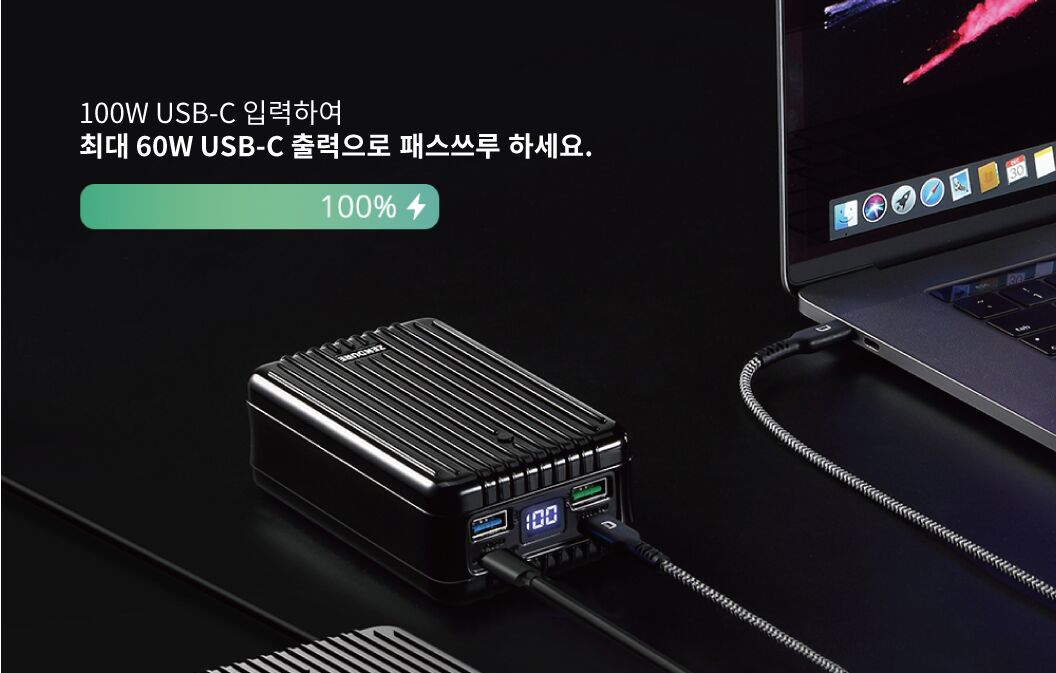 지금까지 느끼지 못한 대용량 고속충전 보조배터리를 사용하세요. USB-C 포트를 이용할 경우 100W 입/출력을 지원하여, 고전력 디바이스 고속충전이 가능합니다. 맥북 13인치를 1.5시간만에 완전 고속충전이 가능합니다. (맥북 13인치 58Wh 기준)