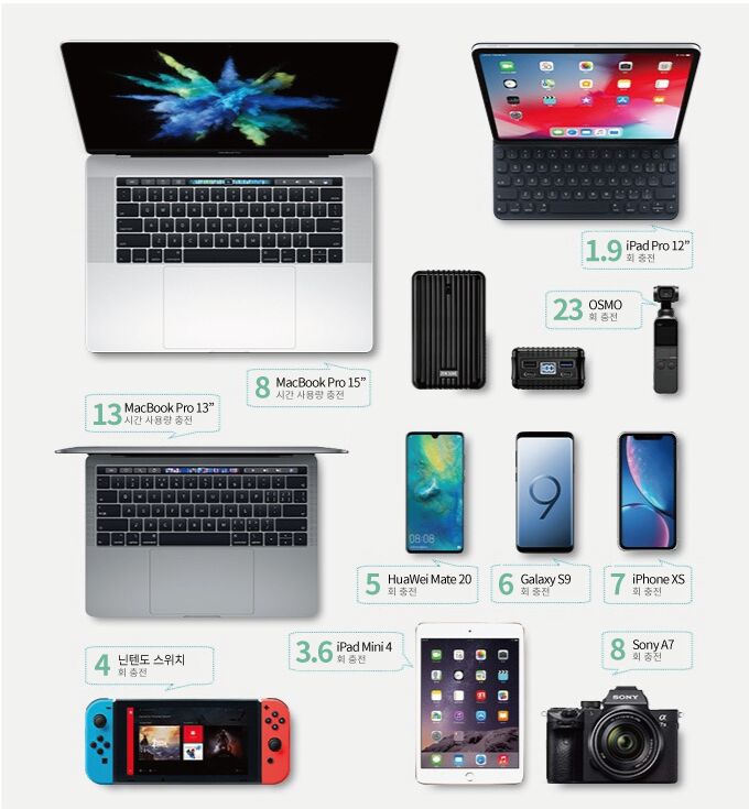 단, 노트북이나 스마트폰에 설치된 어플리케이션이나 프로그램의 환경에 따라 배터리 소모량이 기기마다 다를 수 있어 충전량에 대한 차이가 있을 수 있습니다. 이로 인한 AS 및 환불은 불가합니다. 추가로 제조사에 따라 충전이 지원되지 않을 수 있어 이로인한 펀딩취소 및 환불이 불가합니다.