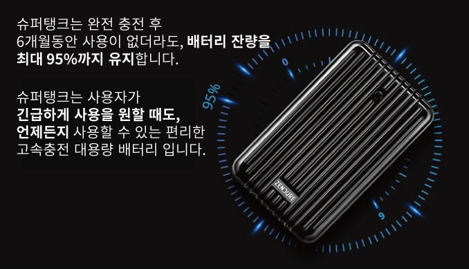 A. 슈퍼탱크는 내구성 뿐 아니라 외부 소재까지 신경쓴 복합기술의 산물입니다. 고급 캐리어에 사용되는 소재를 사용하여 쉽게 휘어지지 않으며, 배터리 셀에 온도 보호장치가 적용되어 있어 더욱 안전합니다.