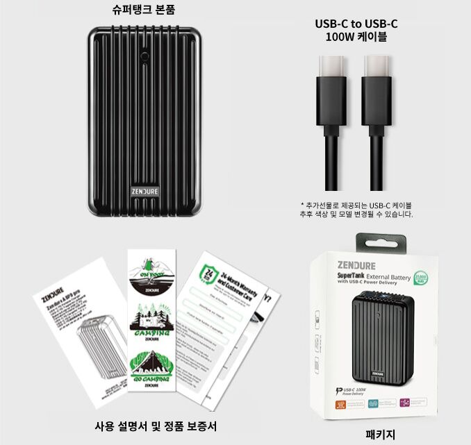 케이블의 경우 슈퍼탱크를 고출력/고입력 할 수 있는 100W USB-C TO USB-C 케이블을 추가선물로 드리고 있습니다. 만약 다른 타입을 사용하시는 경우에는 서포터님이 사용하시는 USB 케이블을 이용하시면 됩니다.