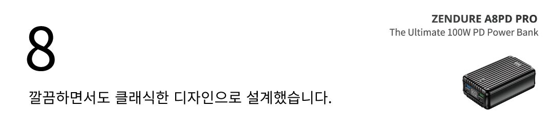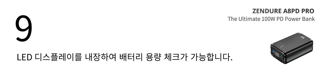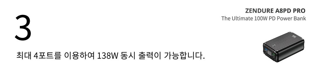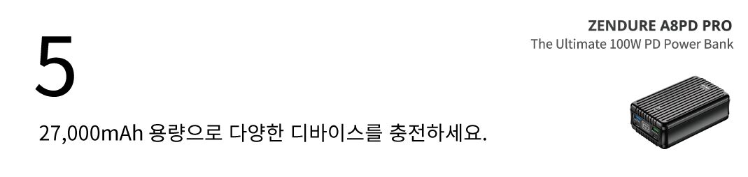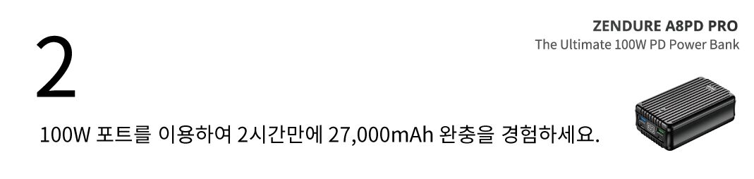느린 보조배터리 충전은 이제 그만! 100W 충전 포트를 이용하시면, 2시간만에 100%로 슈퍼탱크 보조배터리를 충전할 수 있습니다. 27,000mAh 대용량 배터리의 차원이 다른 충전속도를 경험하세요. (젠듀어 슈퍼포트 4 추후 펀딩예정)