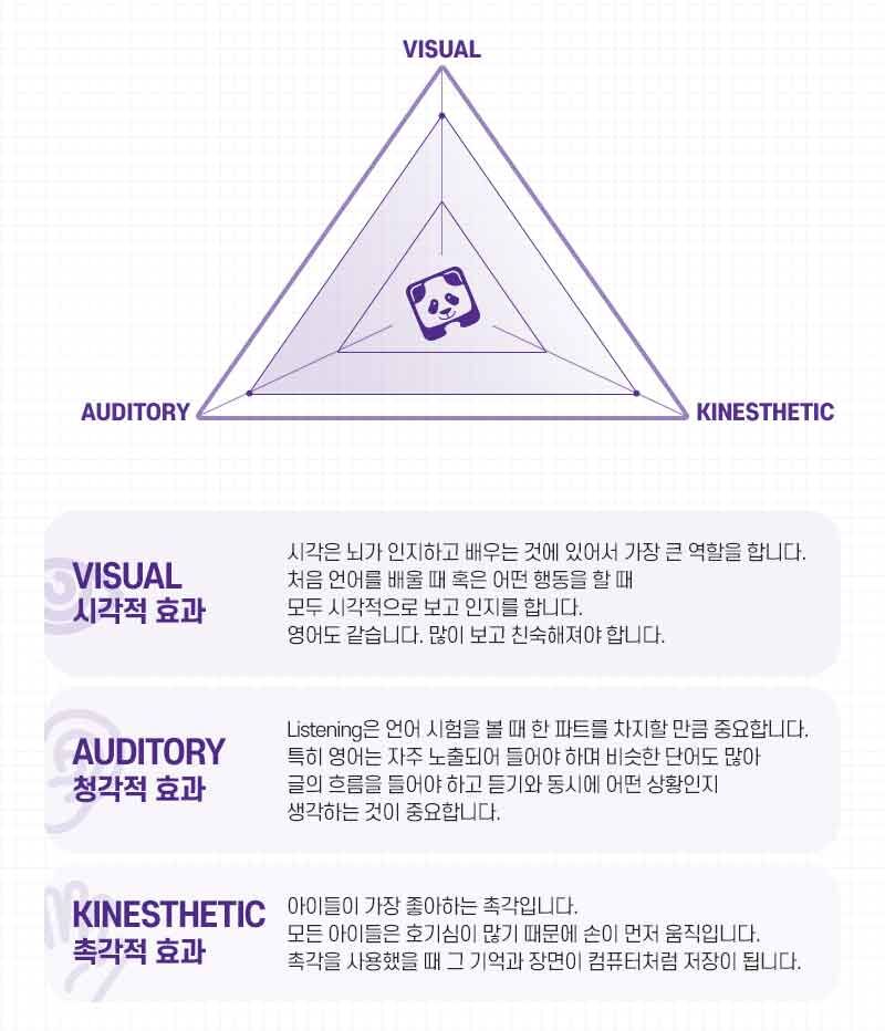 시각, 청각, 촉각을 사용하여 아이들을 지도하는 학습법입니다. 아이들은 언어를 배울 때 가장 효과적으로 쉽게 습득하는 방법이 다중감각을 활용하는 것입니다.