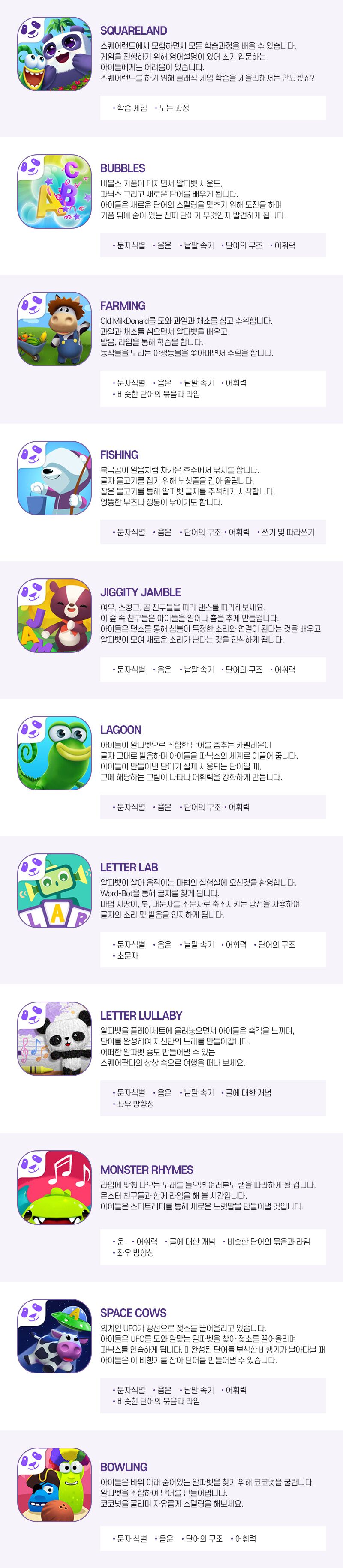 스퀘어판다 11개의 러닝게임앱을 통해 커리큘럼에 맞추어 학습이 가능합니다.