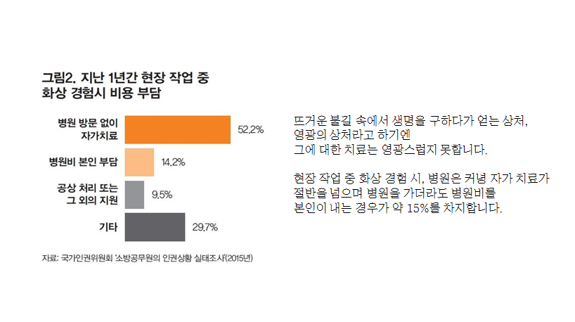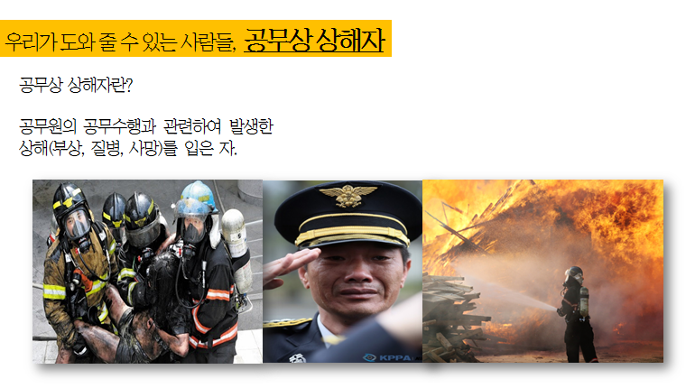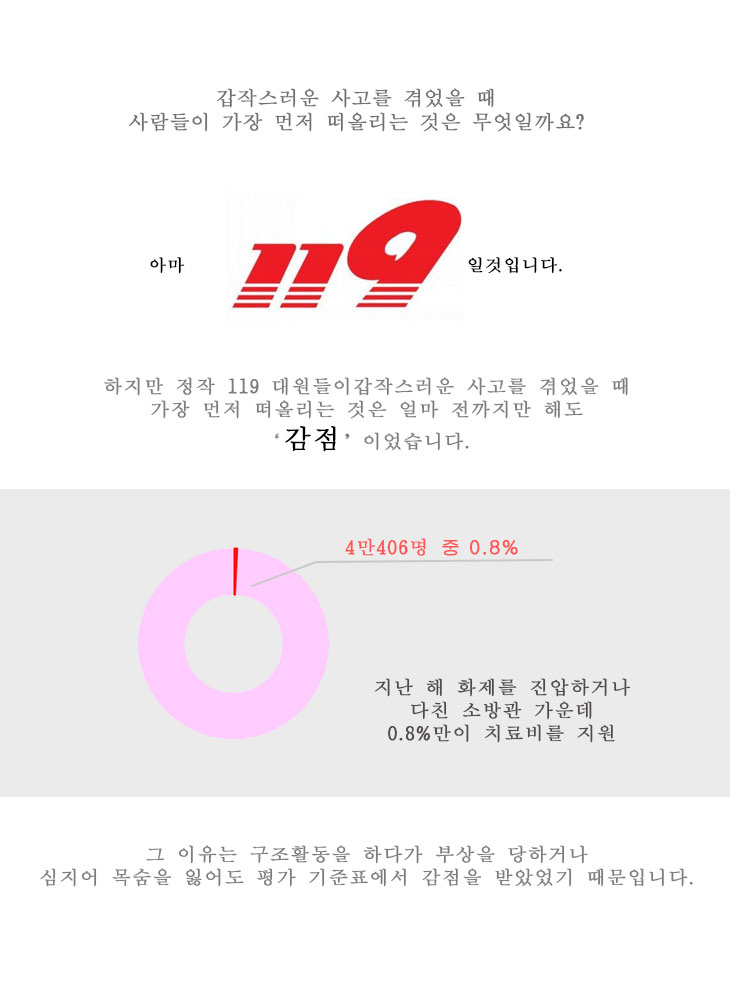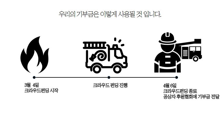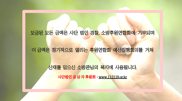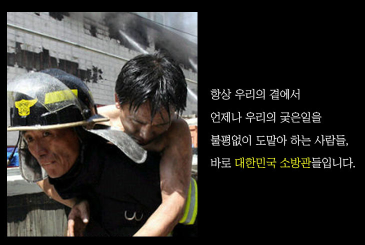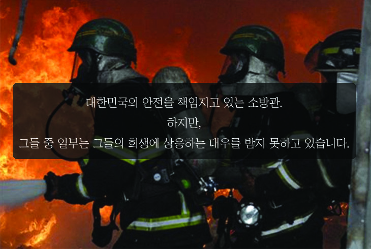 뜨거운 불길속에서 늘 우리의 목숨이 먼저였던 대한민국 소방관, 이제는 우리가 그들을 지켜줄 차례입니다. 소방관심과 함께 노후된 소방장비 교체와 소방관의 산재 병원비를 마련해 주세요.