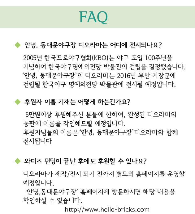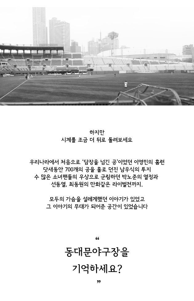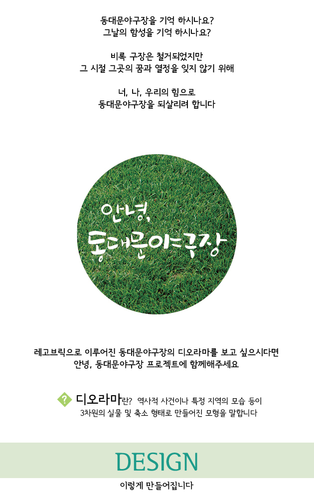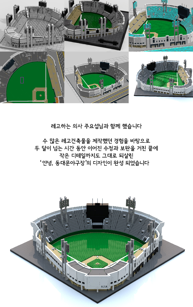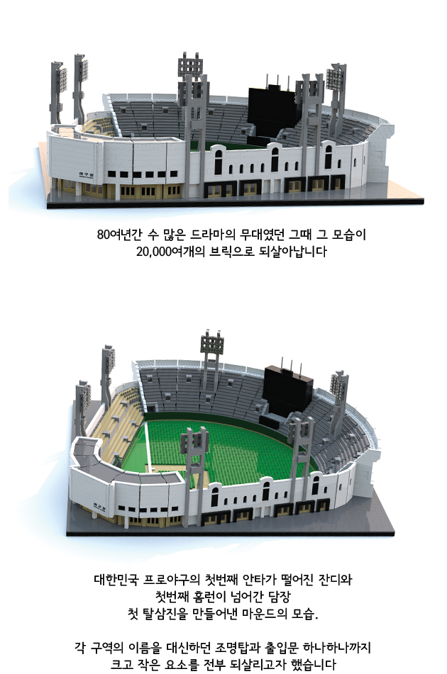 [안녕, 동대문야구장]은 한국야구의 추억이 담긴 공간인 동대문야구장을 기억할 수 있도록 레고로 복원하여 한국 야구 명예의 전당에 기증하는 프로젝트 입니다.
