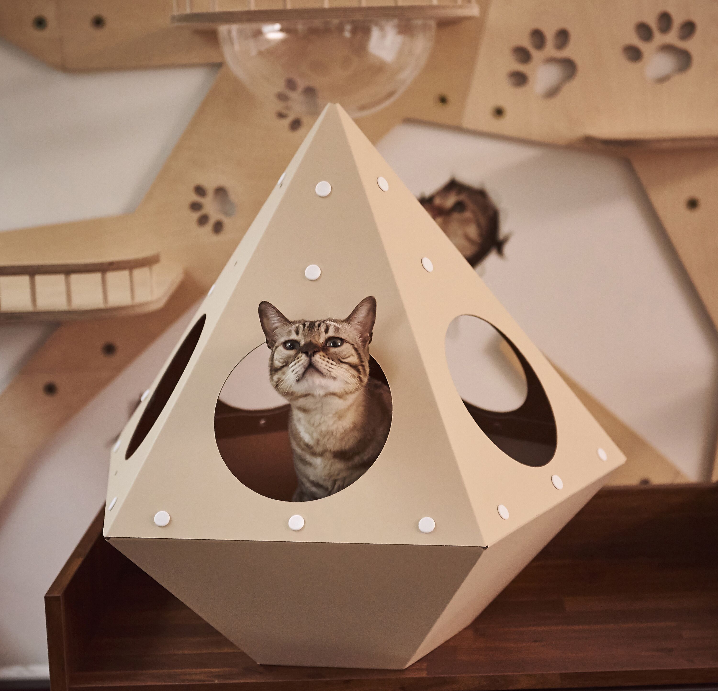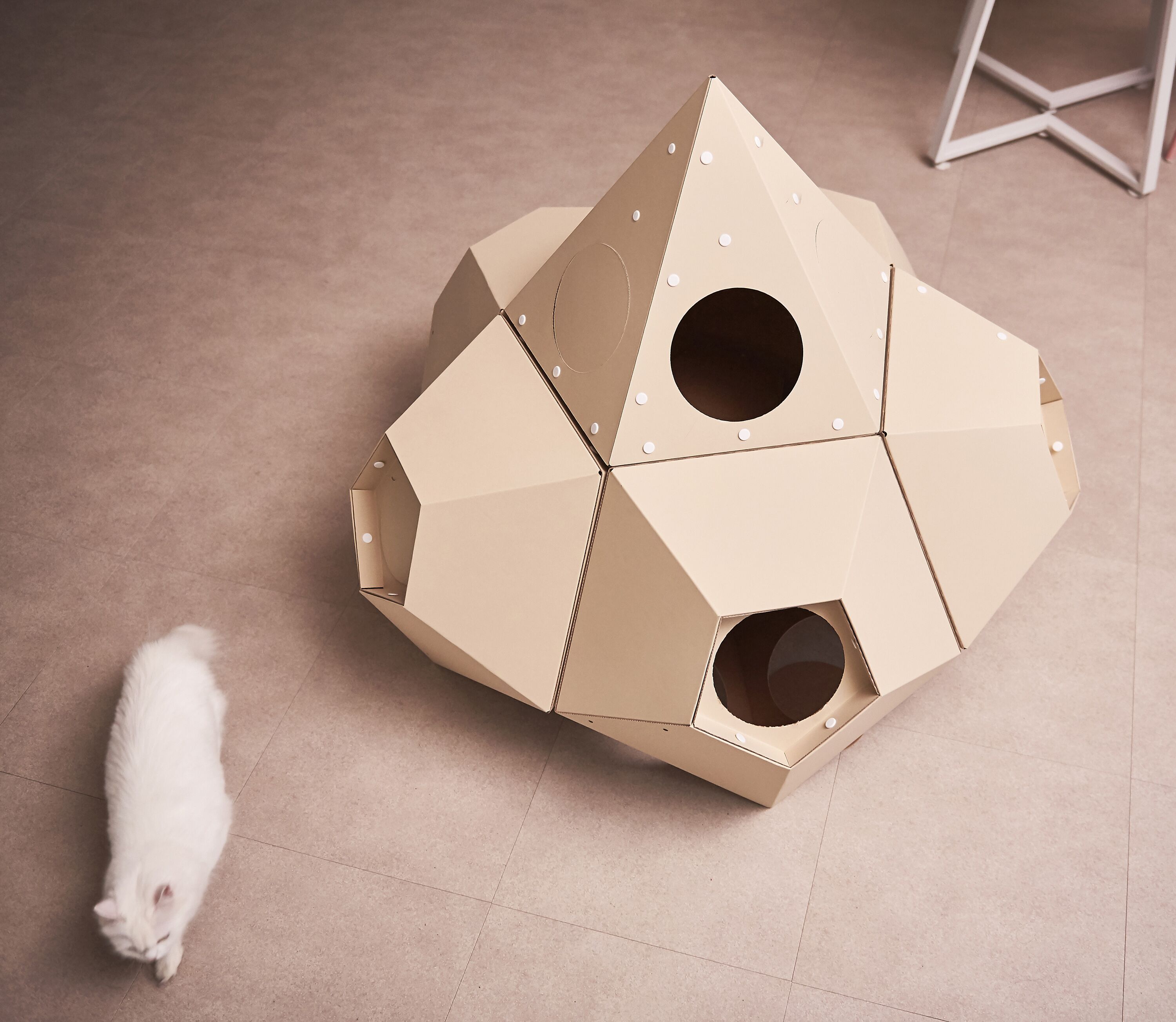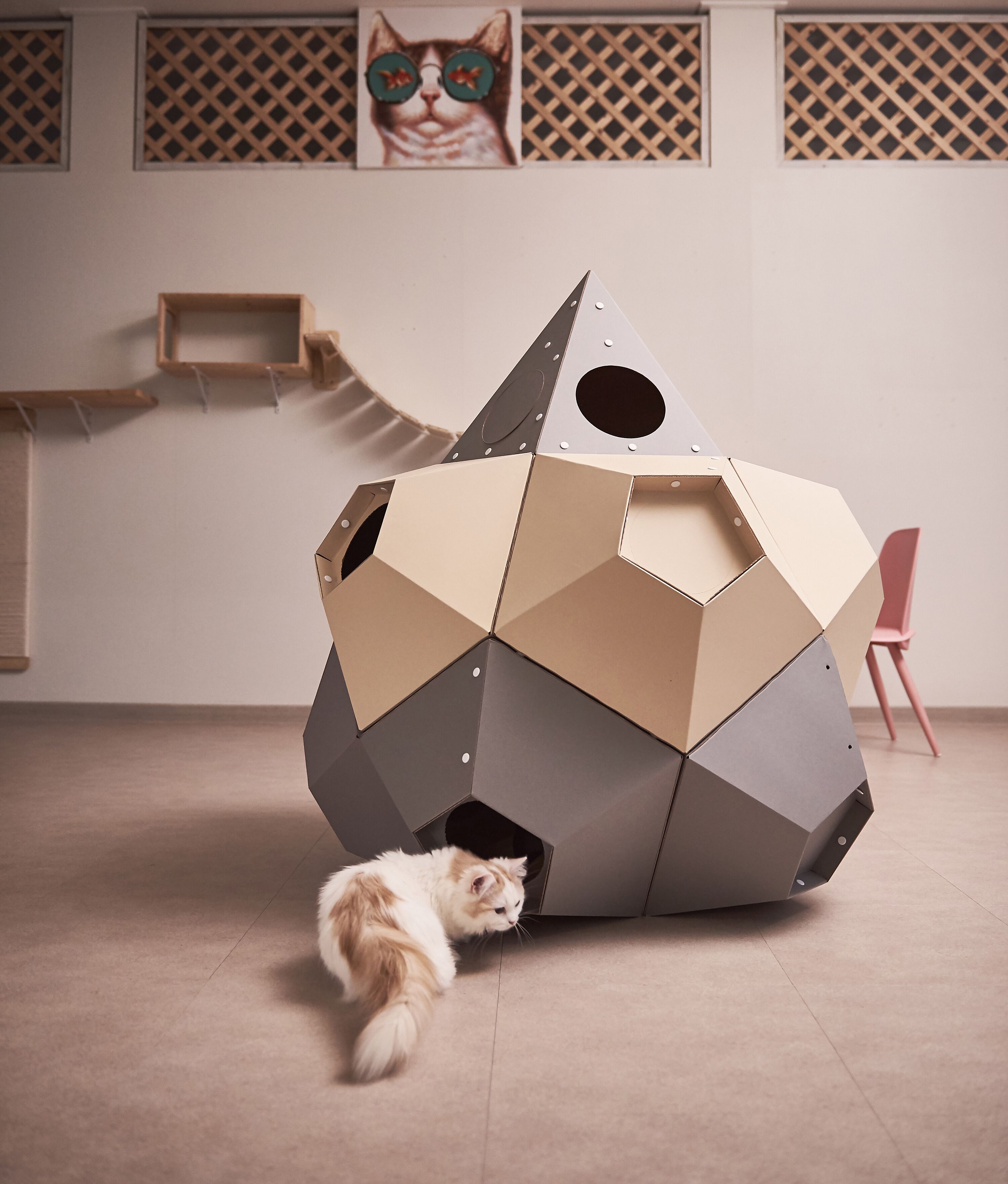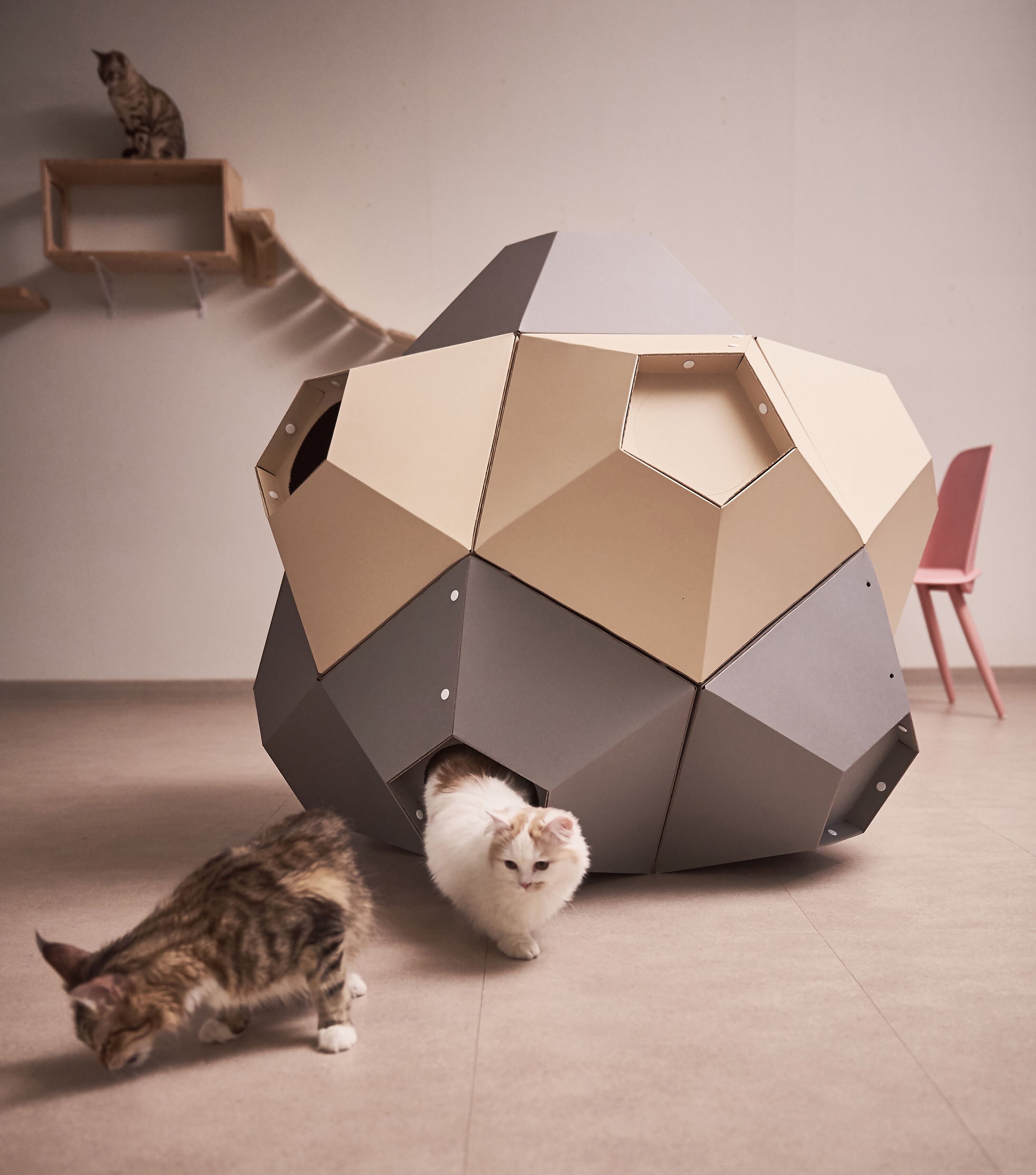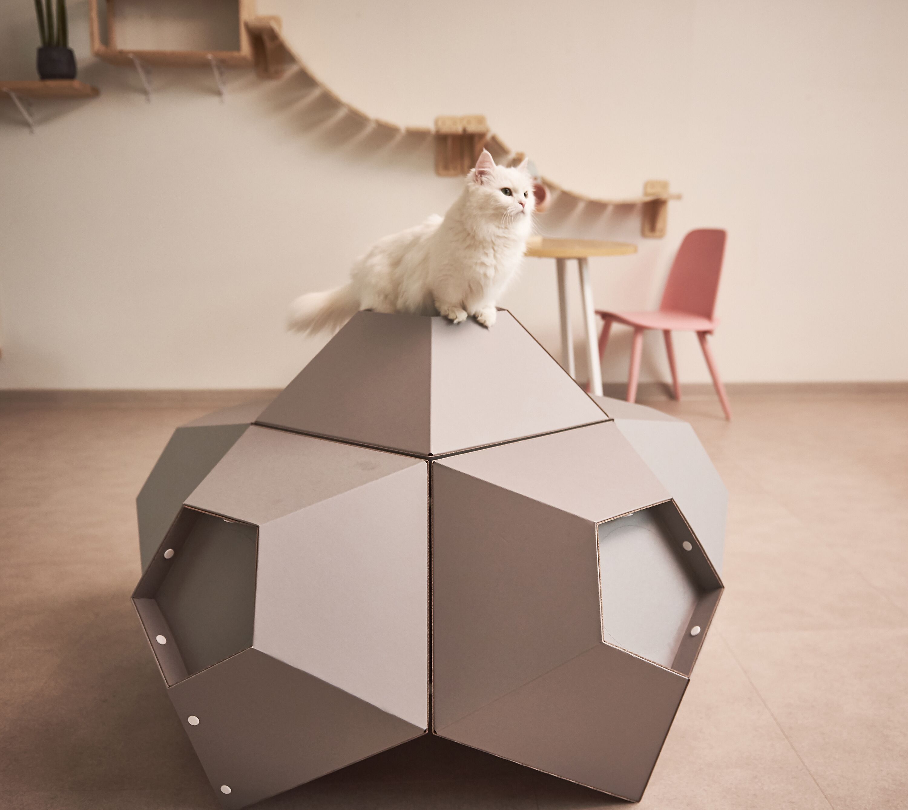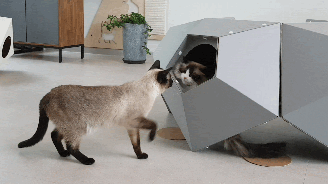 : 고양이의 선호도, 집사님의 취향, 공간적인 여유, 인테리어 등을 고려하여 자유자재로 형태를 변형할 수 있는 모듈형 조립구조.
