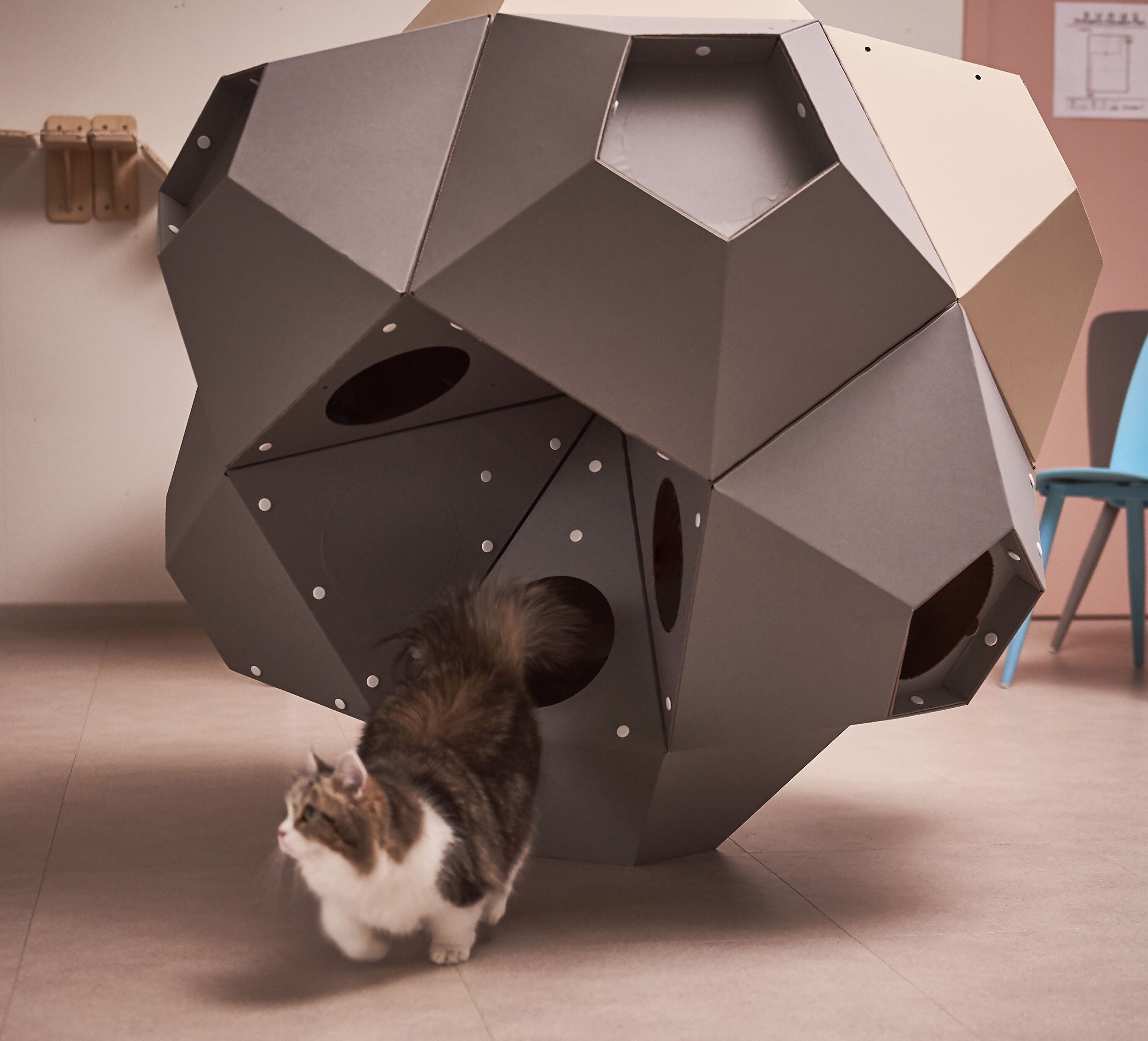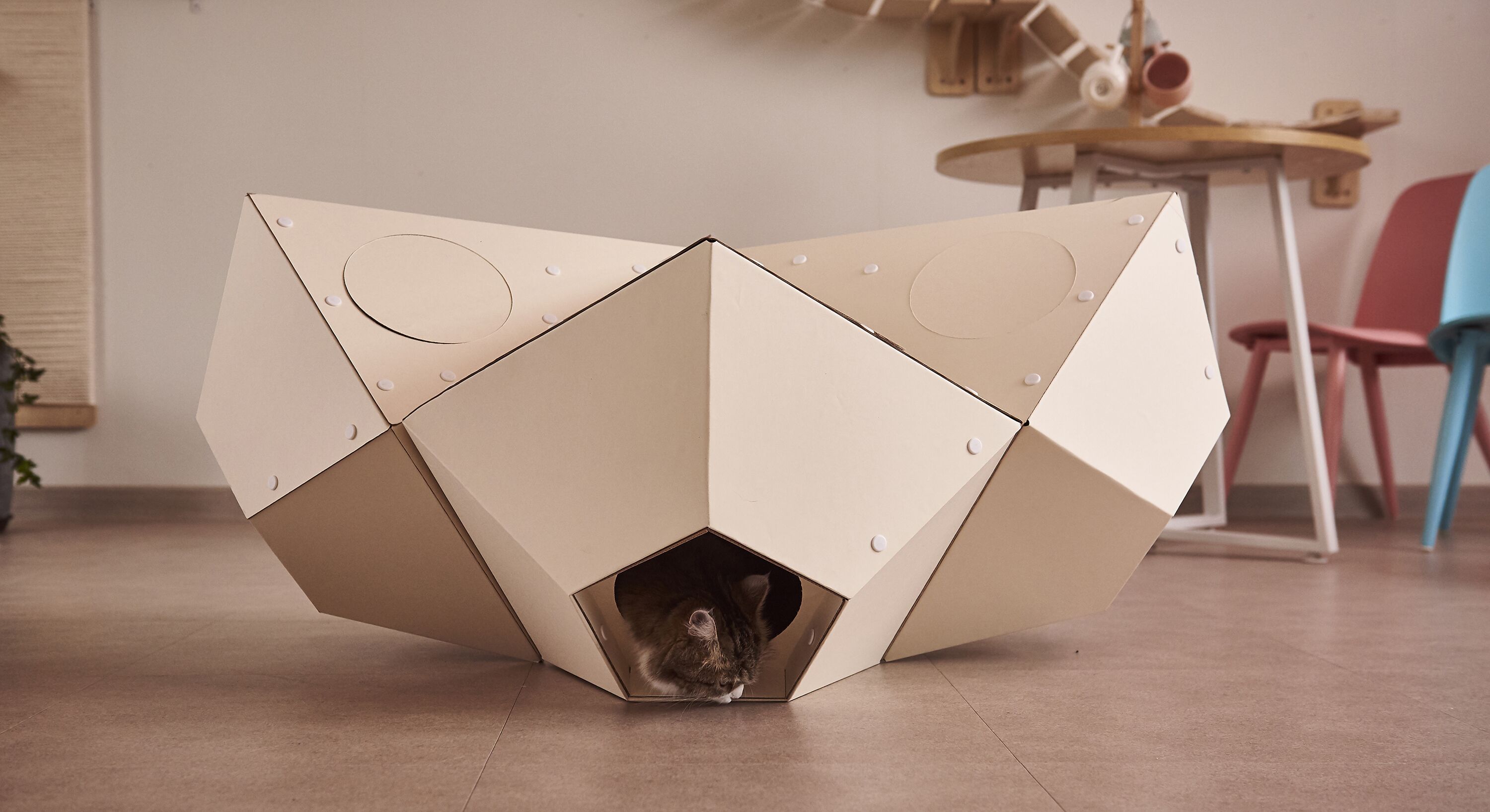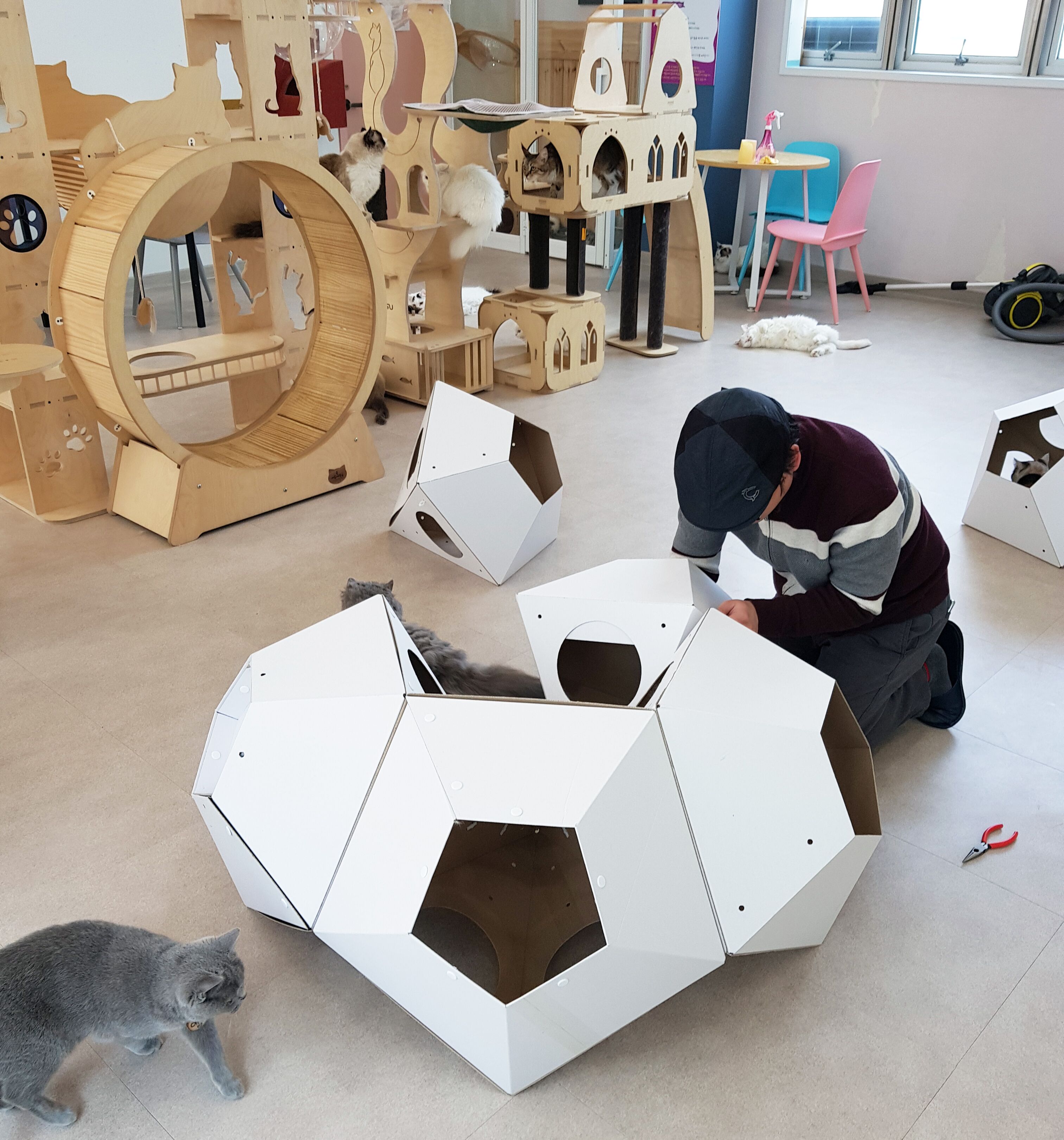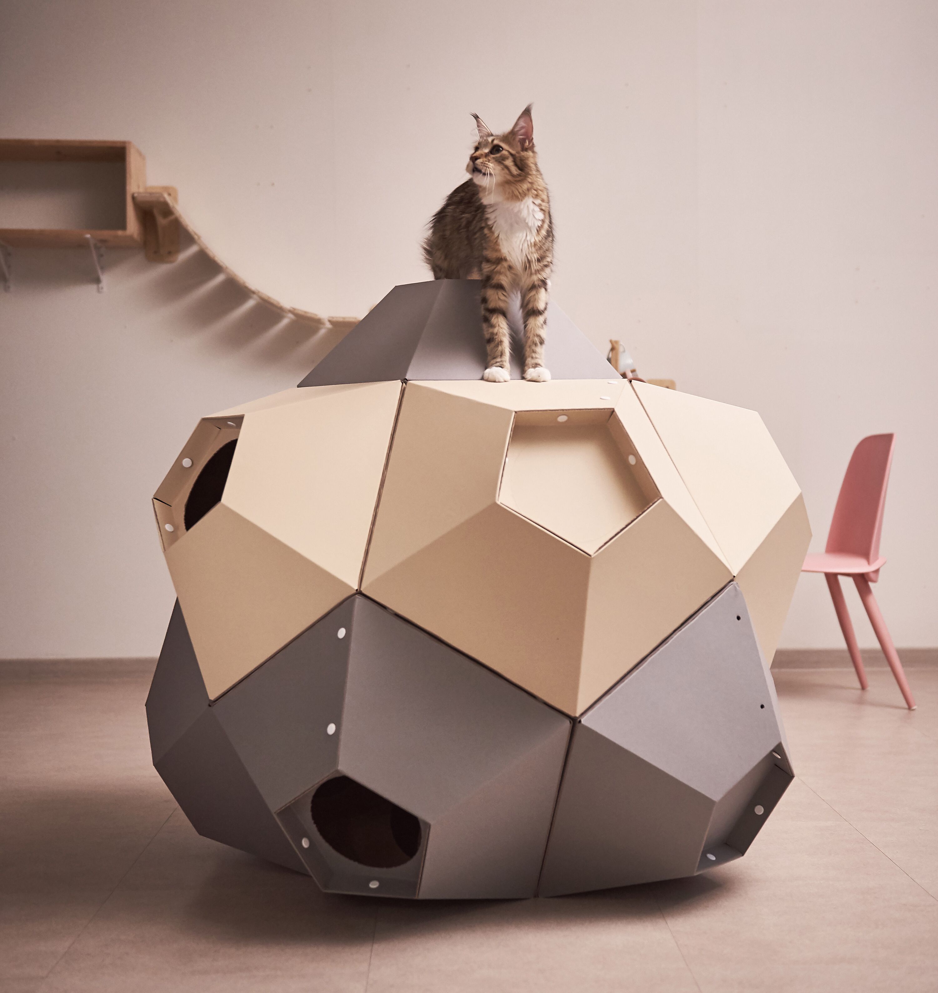 : 고양이의 선호도, 집사님의 취향, 공간적인 여유, 인테리어 등을 고려하여 자유자재로 형태를 변형할 수 있는 모듈형 조립구조.