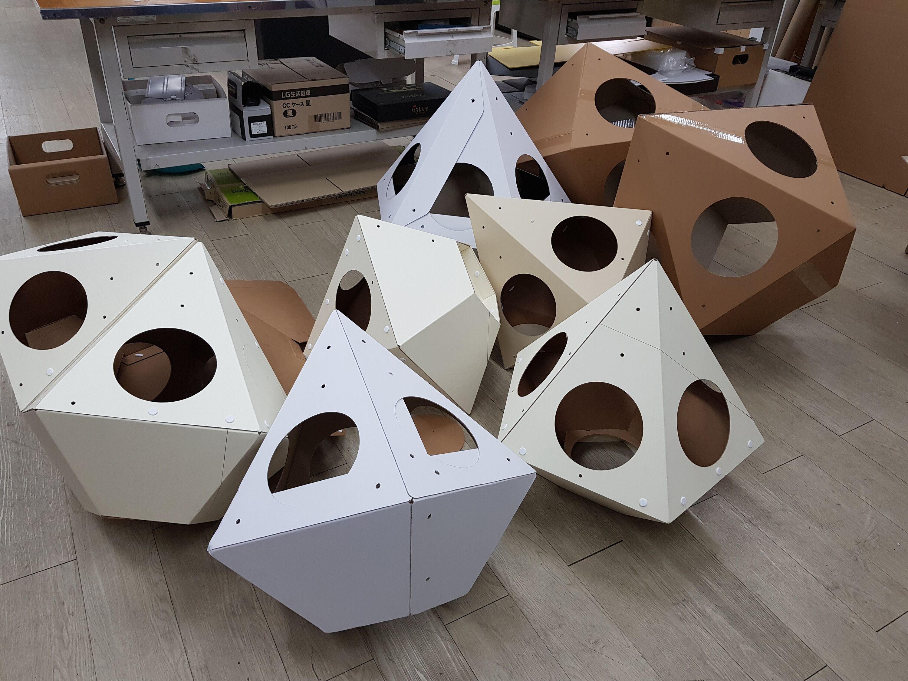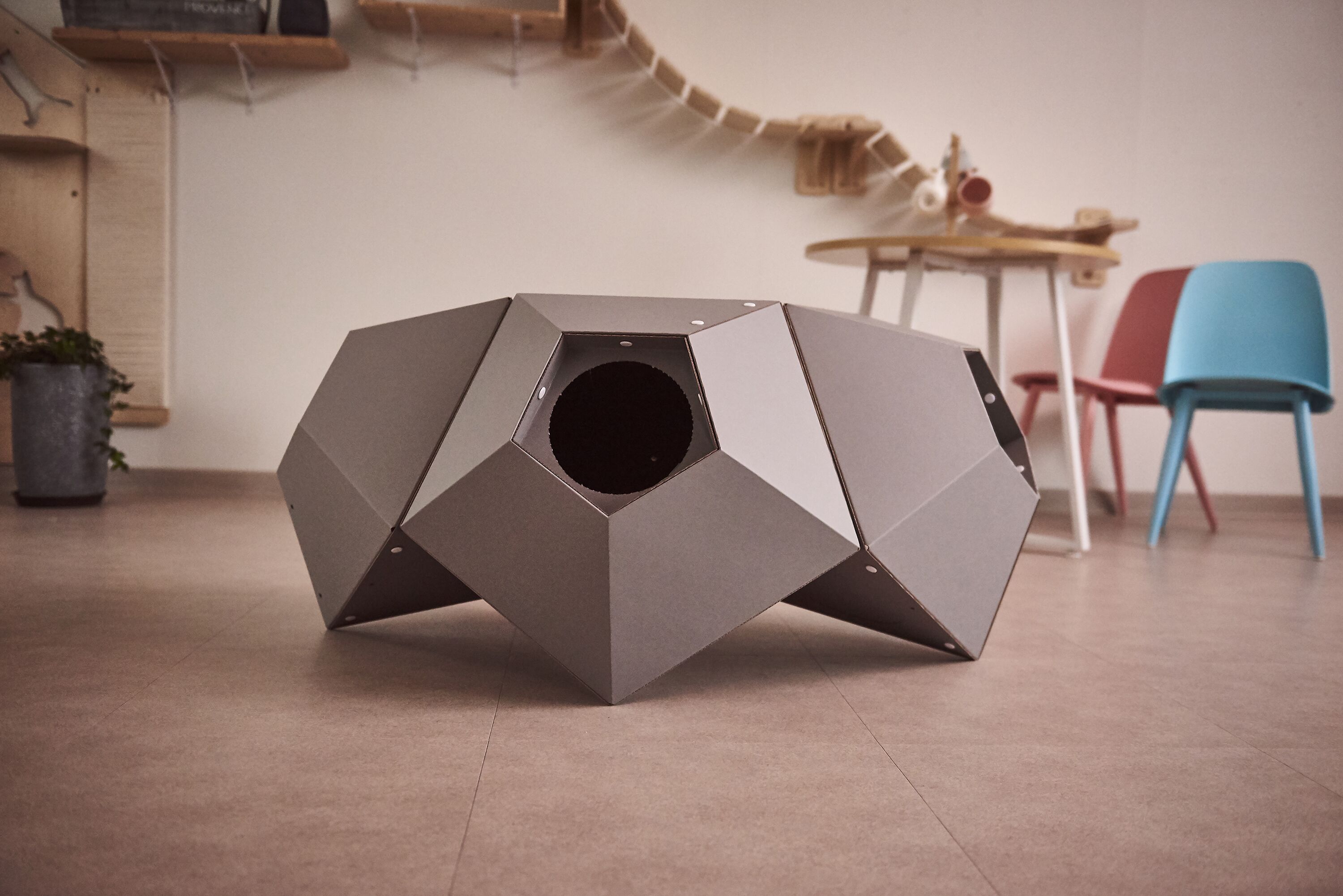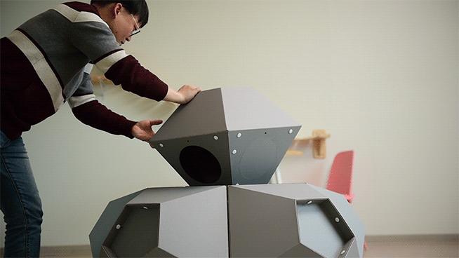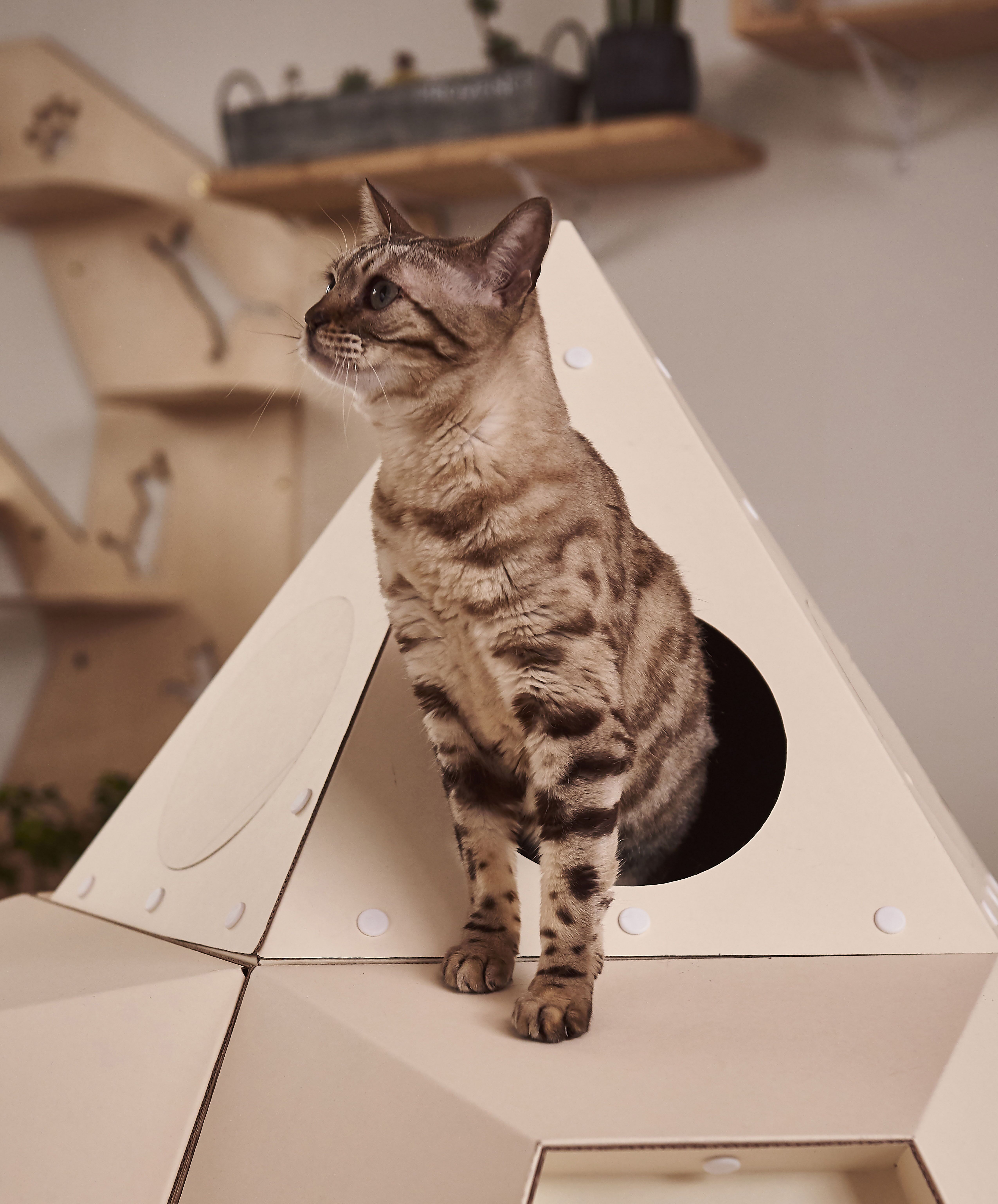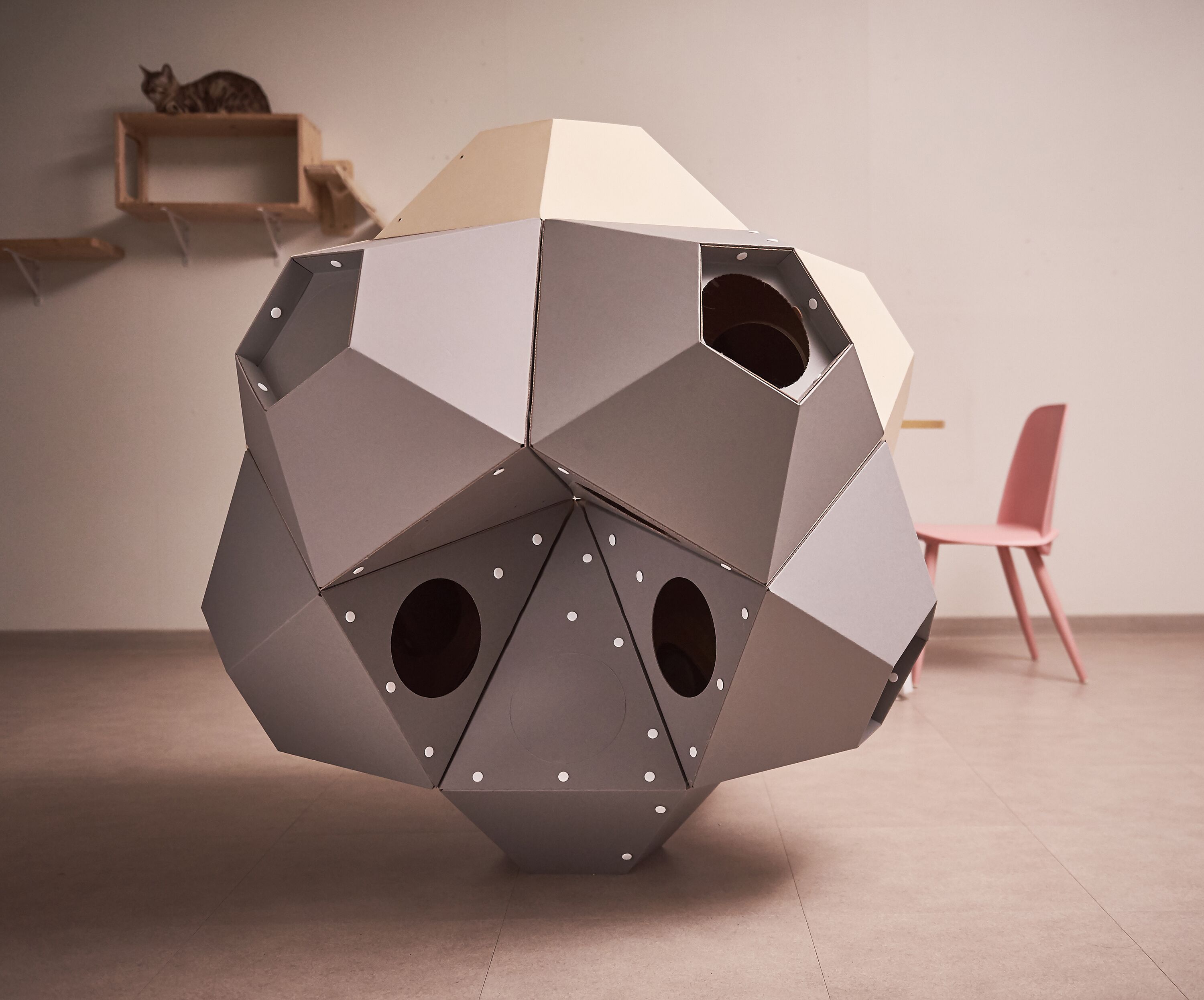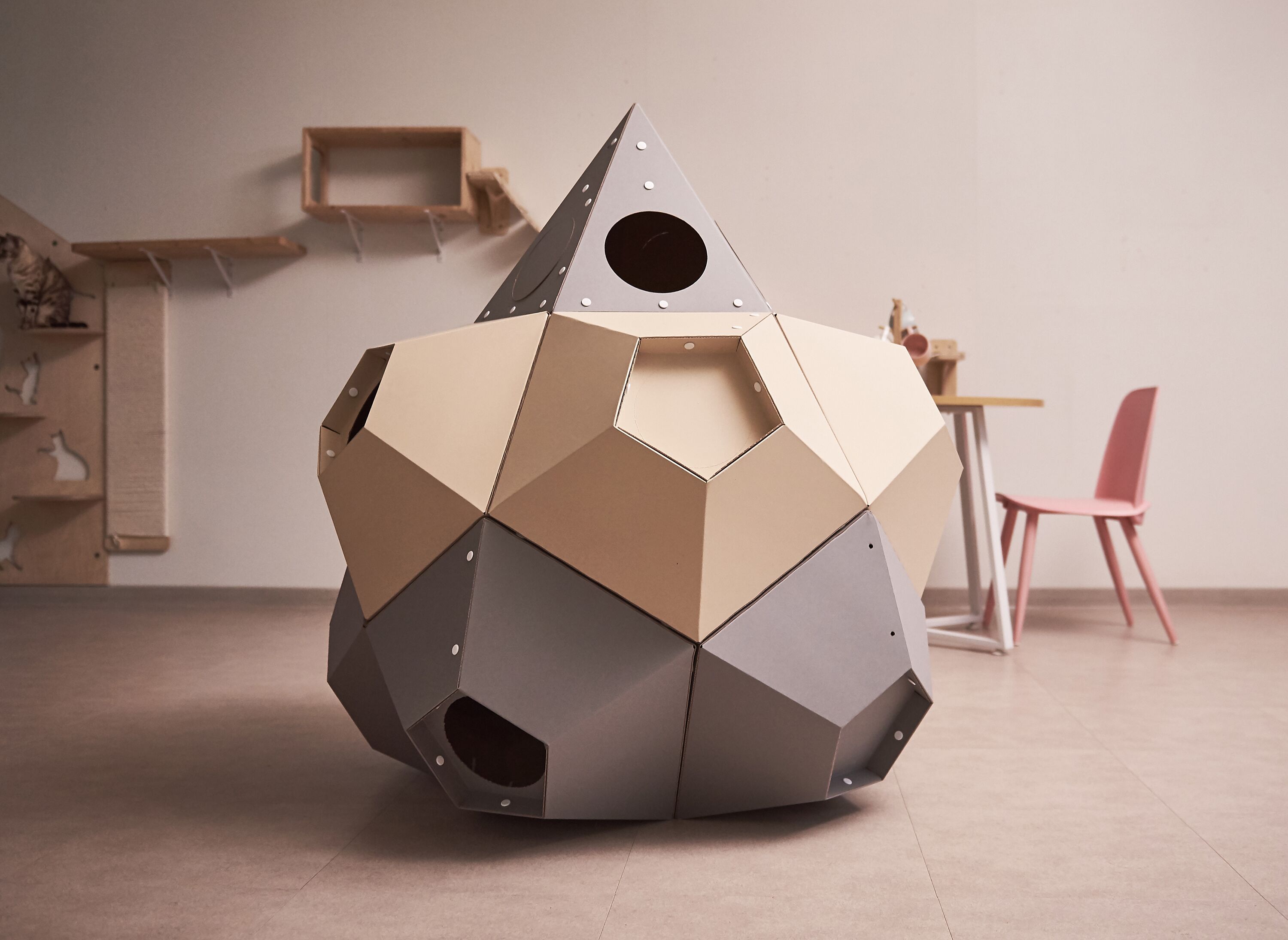 : 고양이의 선호도, 집사님의 취향, 공간적인 여유, 인테리어 등을 고려하여 자유자재로 형태를 변형할 수 있는 모듈형 조립구조.
