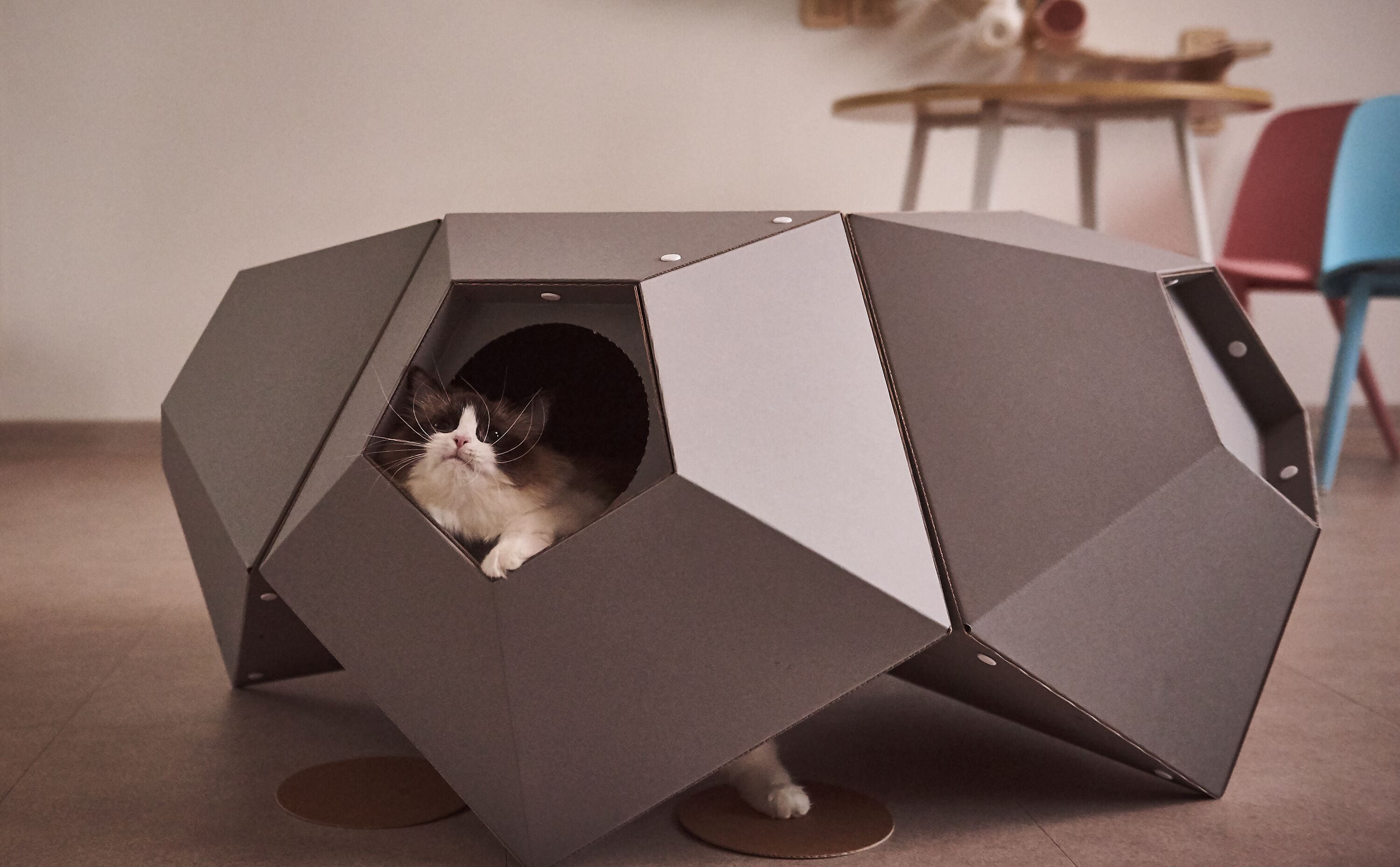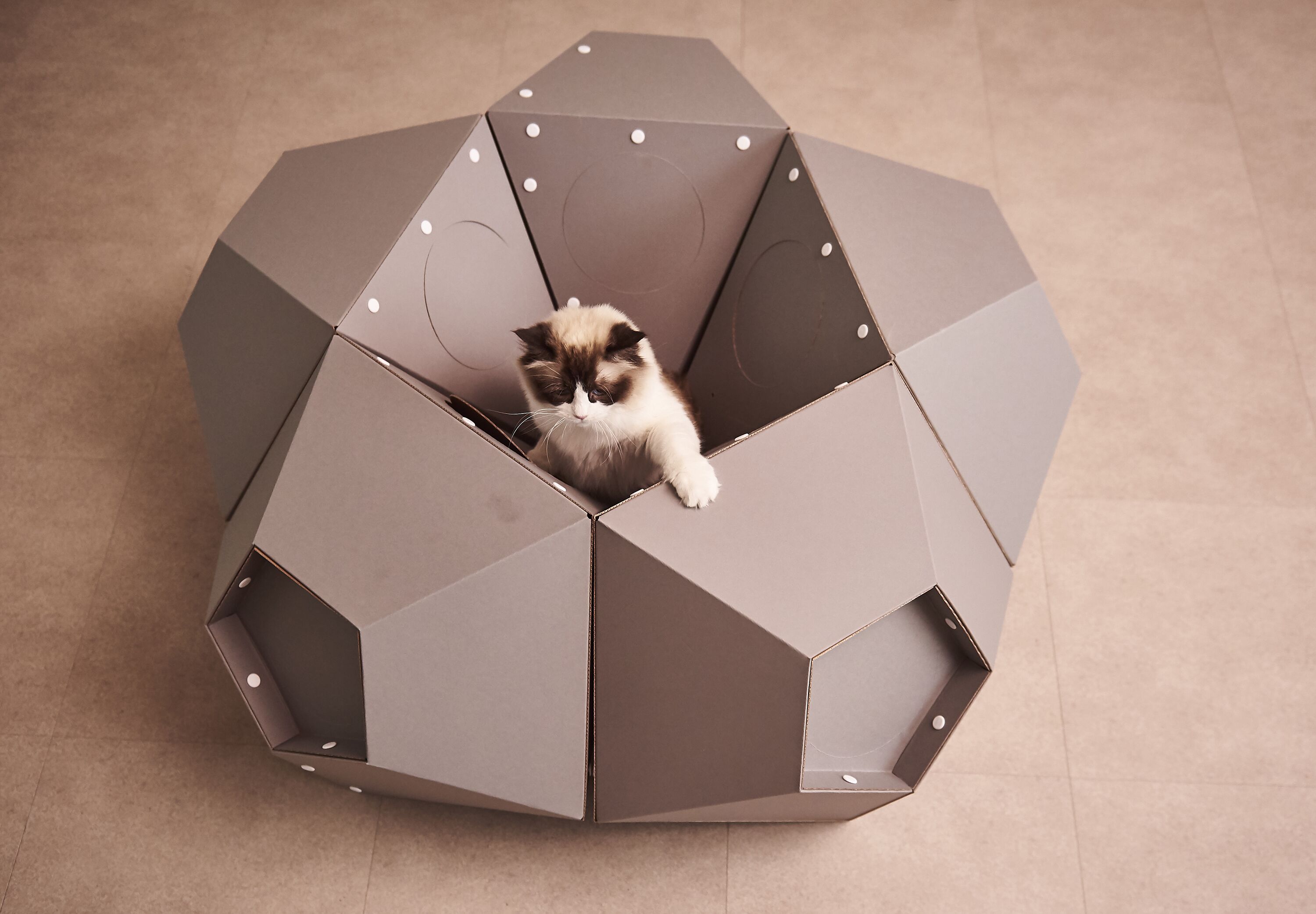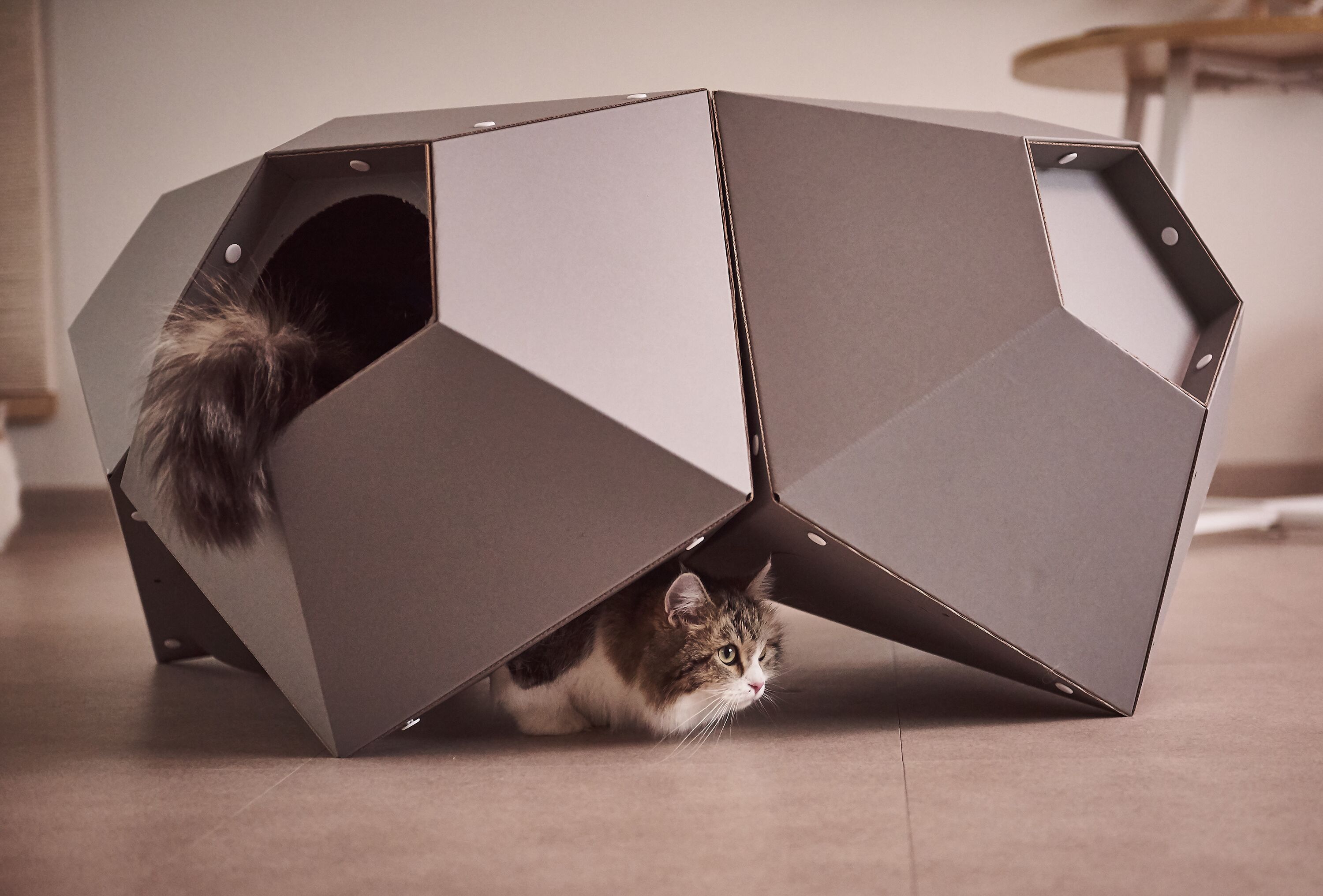 고양이의 스트레스를 줄여주고 체온 유지 & 안정감을 느끼게 해주는 종이 박스 재질. 가볍고 재활용 분리 배출도 OK !