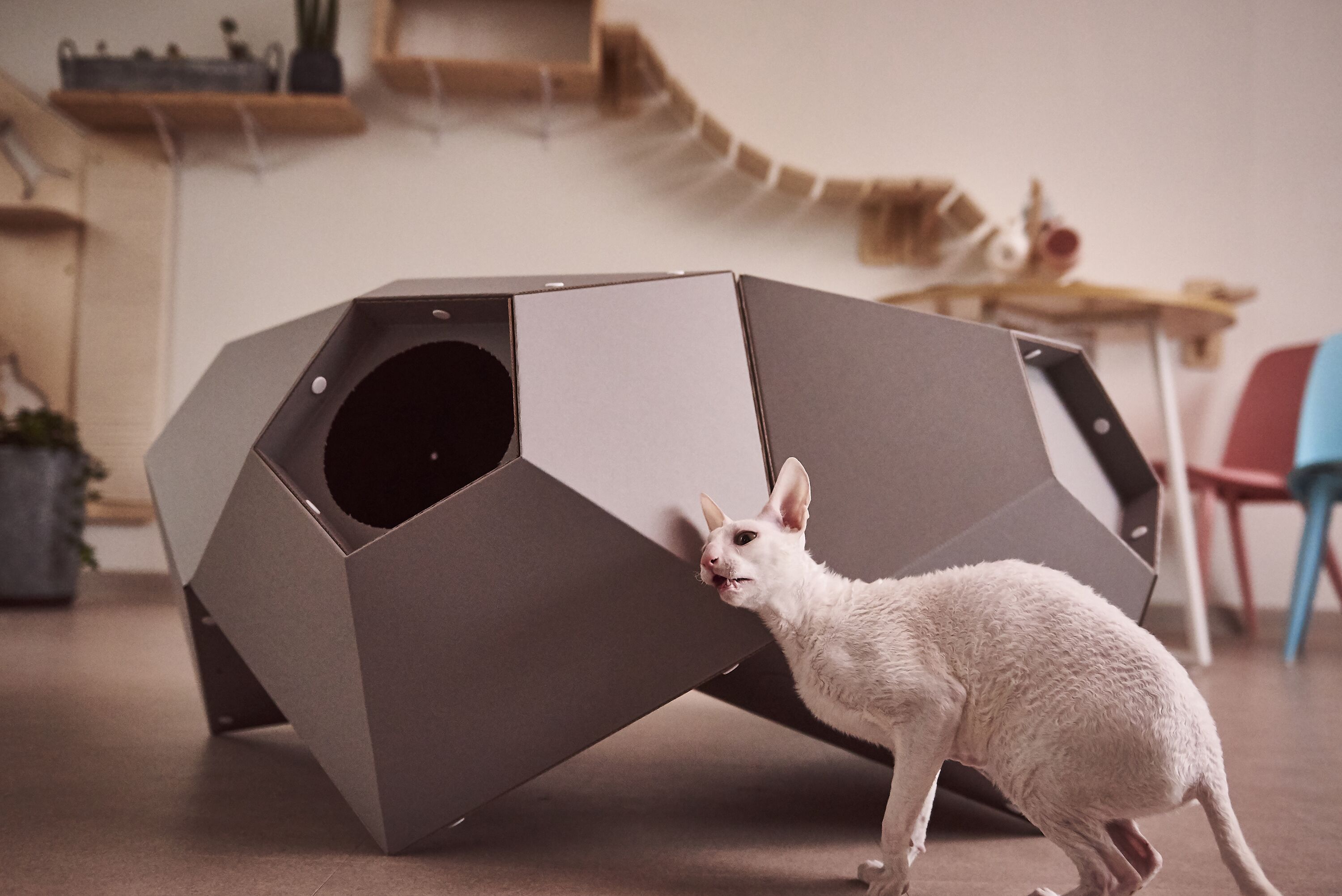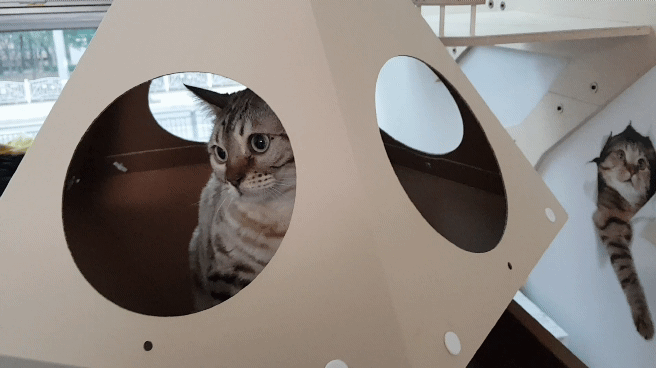 11개로 만들어진 캣미로의 내부에 뚫린 여러개의 구멍을 통해 마치 미로 탐험을 하듯 사방으로 자유롭게 이동할 수 있어요. 단순하게 상하 혹은, 좌우로 이동할 수 있는 다른 기구들과는 달리 상.하.좌.우 내부 공간을 자유롭게 이동할 수 있는 흥미진진한 고양이 놀이터랍니다!