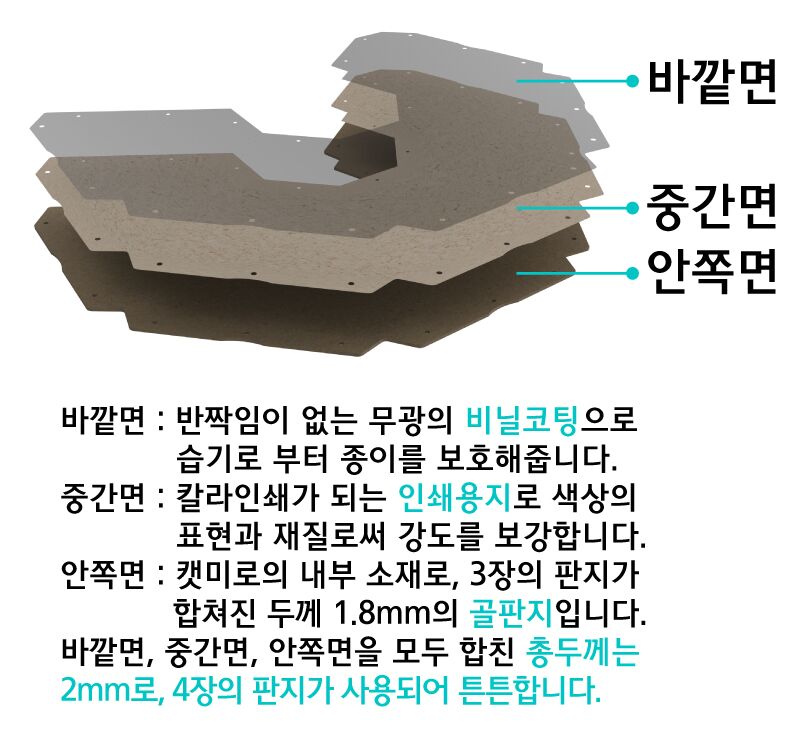 - 사용한 종이는 총 4겹, 2mm 의 슬림한 두께의 골판지