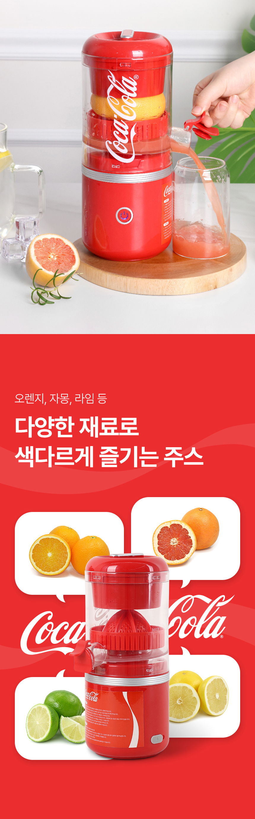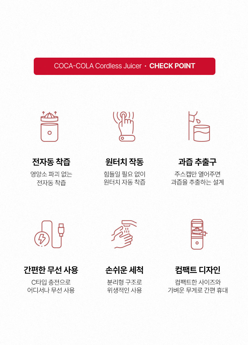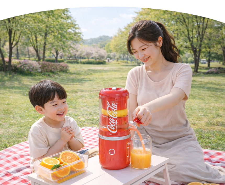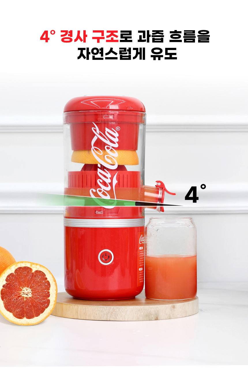 1. 🍊 코카콜라 무선 착즙기 - 원터치 자동 작동으로 신선한 오렌지 주스 착즙 2. ⚡ 무선 충전과 휴대성 - CE 타입 무선 충전으로 집·야외 어디서나 사용 가능 3. 🧼 분리형 구조 세척 용이 - 분리 세척으로 위생적이고 간편한 관리 가능
