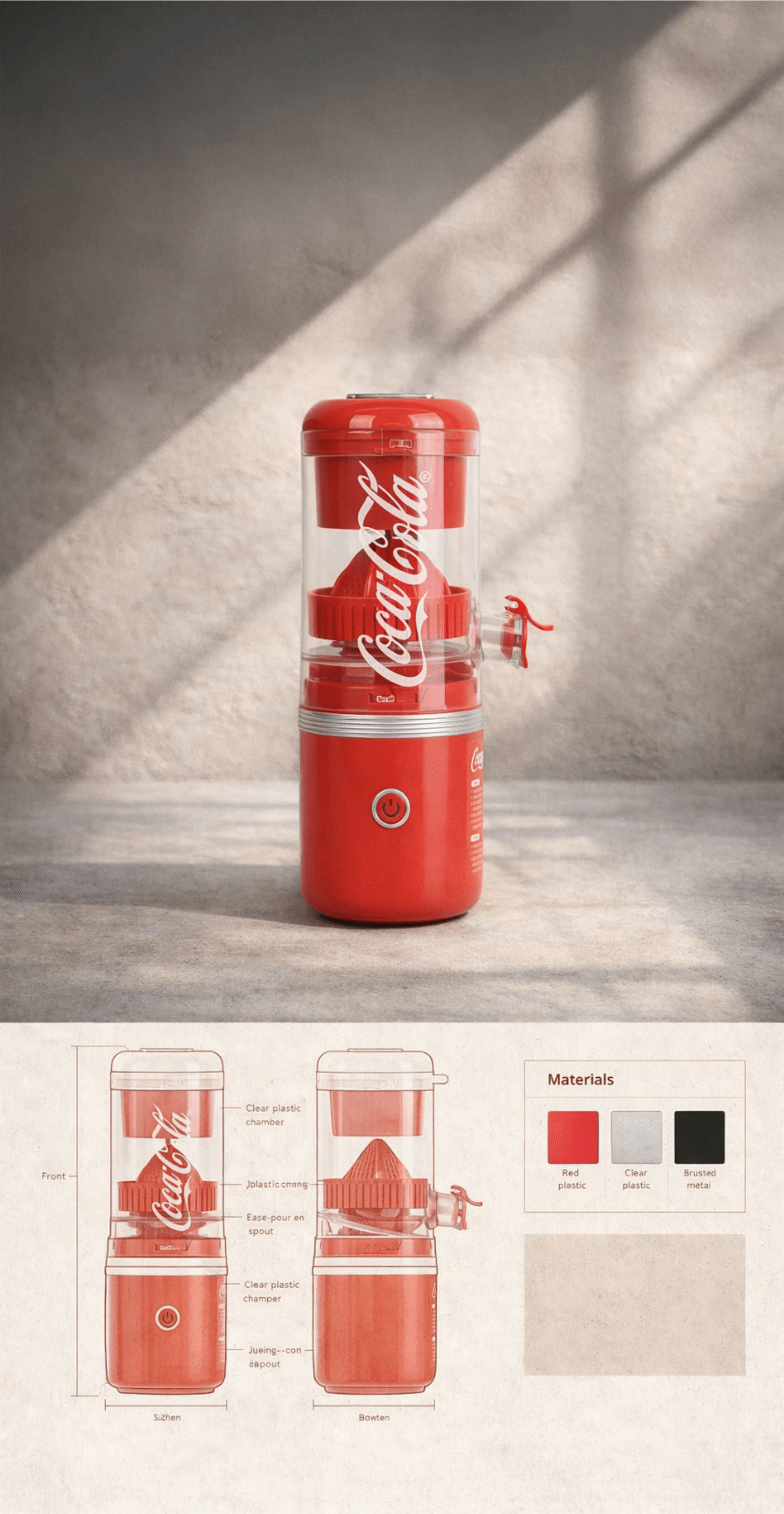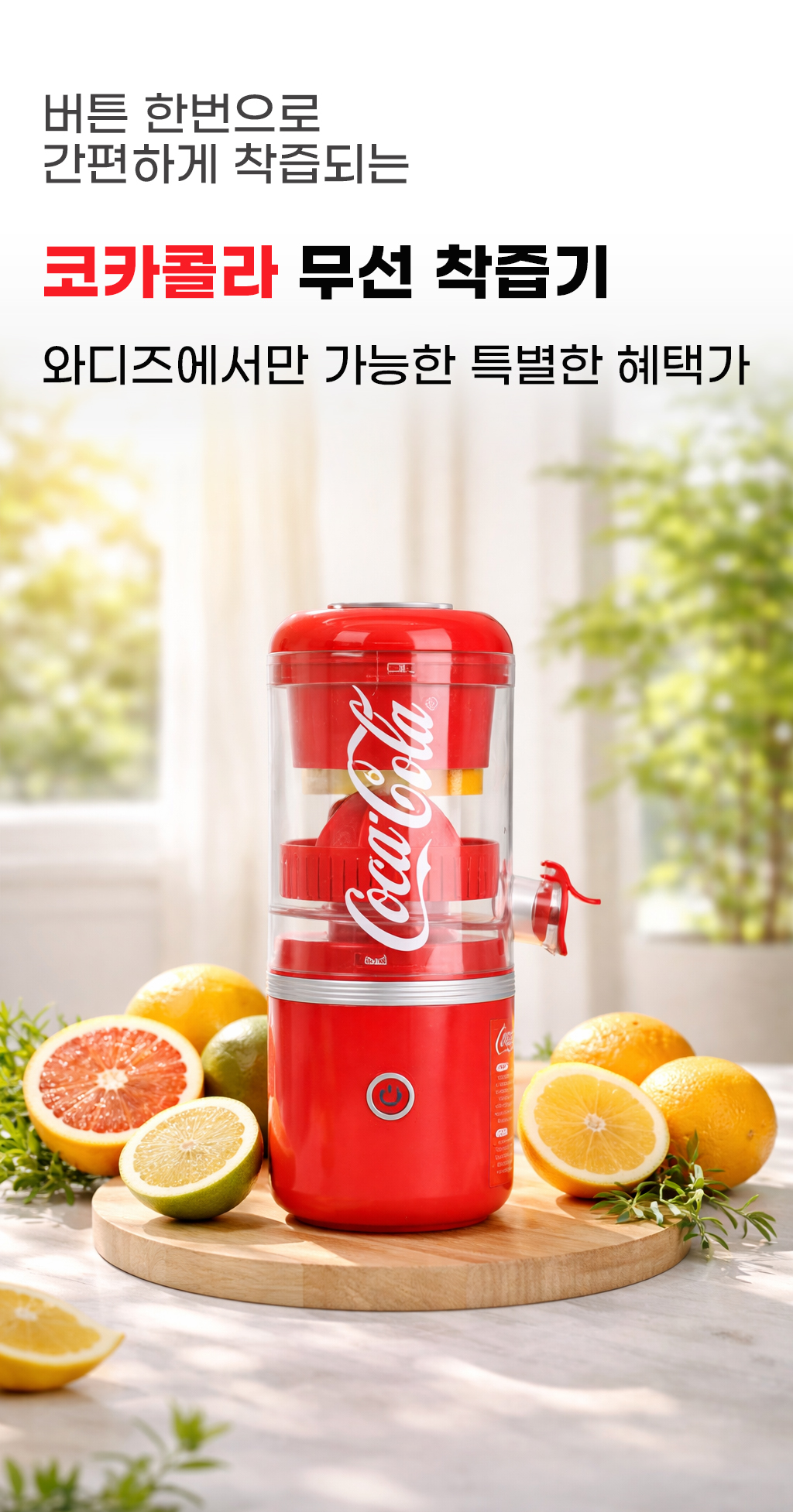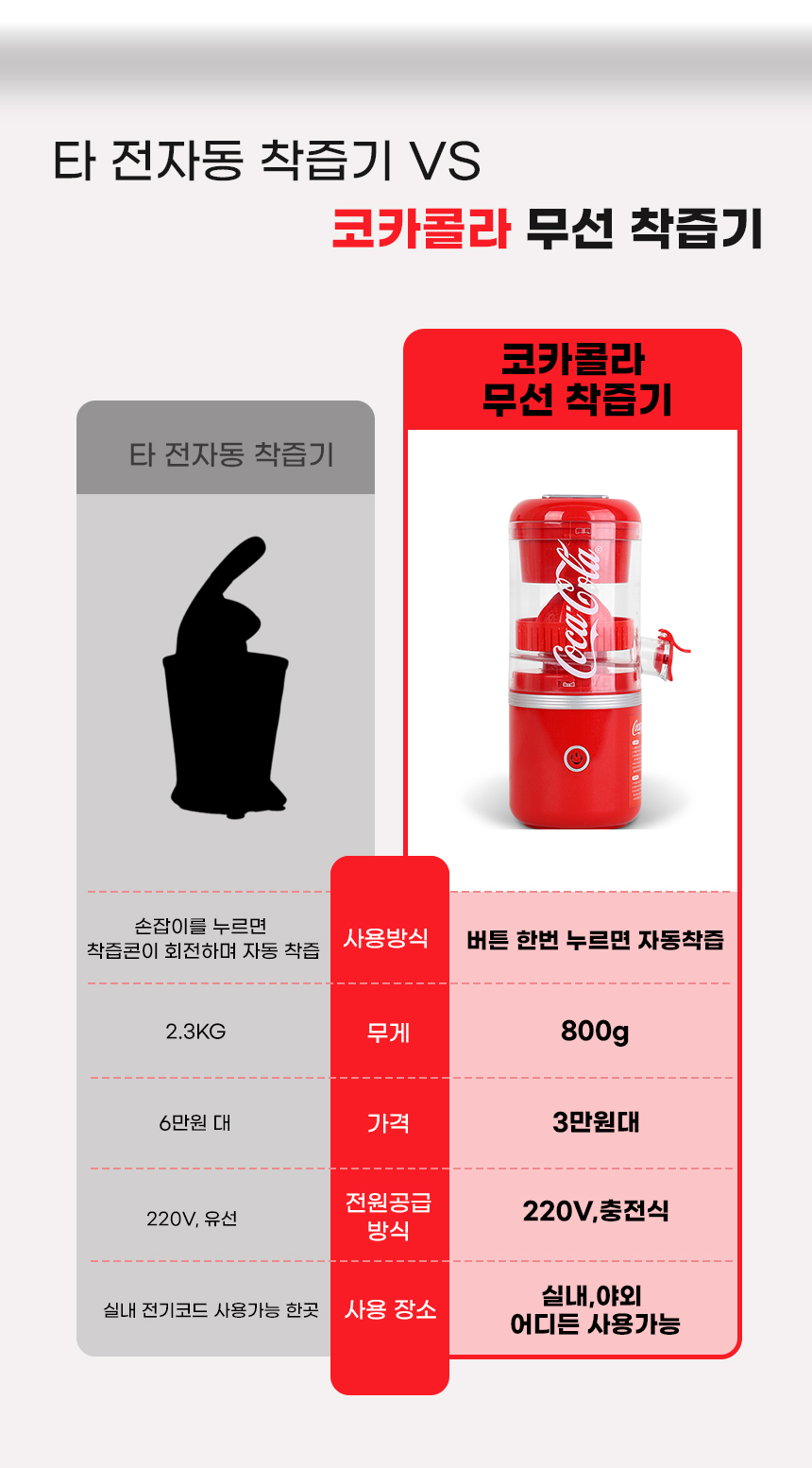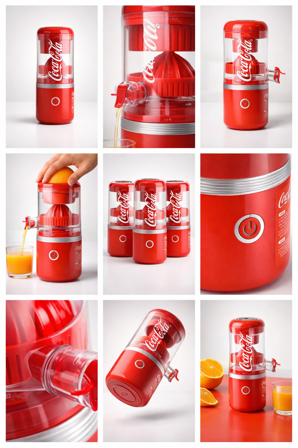 1. 🍊 코카콜라 무선 착즙기 - 원터치 자동 작동으로 신선한 오렌지 주스 착즙 2. ⚡ 무선 충전과 휴대성 - CE 타입 무선 충전으로 집·야외 어디서나 사용 가능 3. 🧼 분리형 구조 세척 용이 - 분리 세척으로 위생적이고 간편한 관리 가능