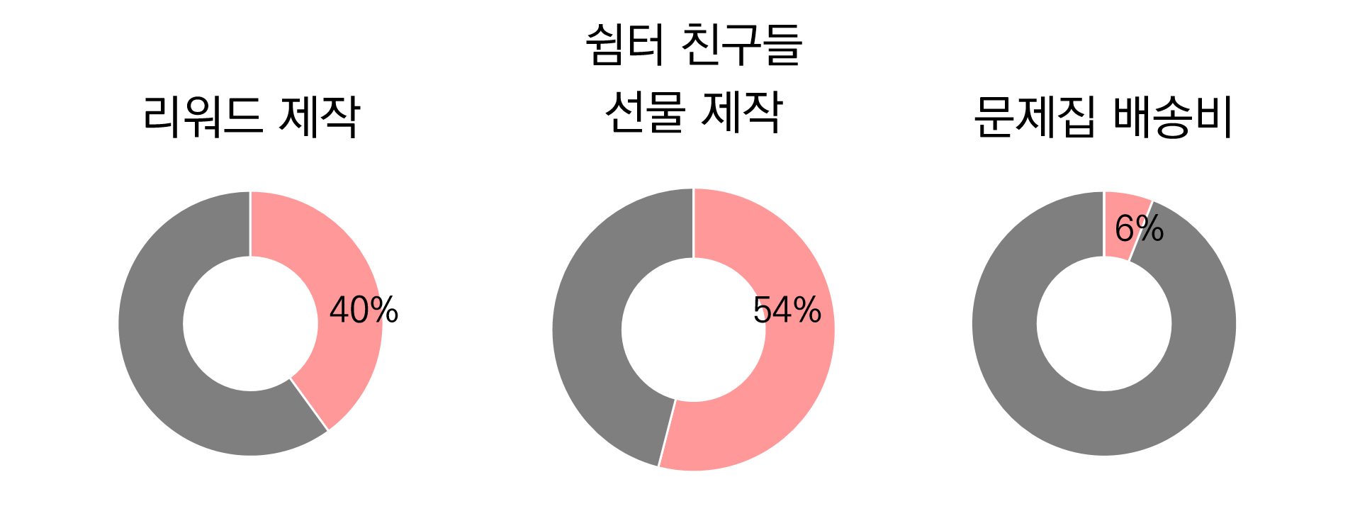 리워드 제작 40% / 배송비 6% / 쉼터 친구들의 학습 지원 물품 구매 54%
