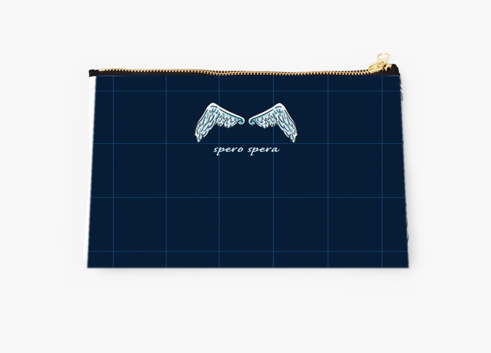 "spero spera"는 "숨을 쉬는 한 희망이 존재한다." 라는 뜻의 라틴어에요. '희망의 날개' 모양과 함께, 친구들의 희망이 영원히 빛나기를 소망하며 문구를 작성해봤어요. 파우치는 일반 지퍼 파우치로 제작될 예정이에요.