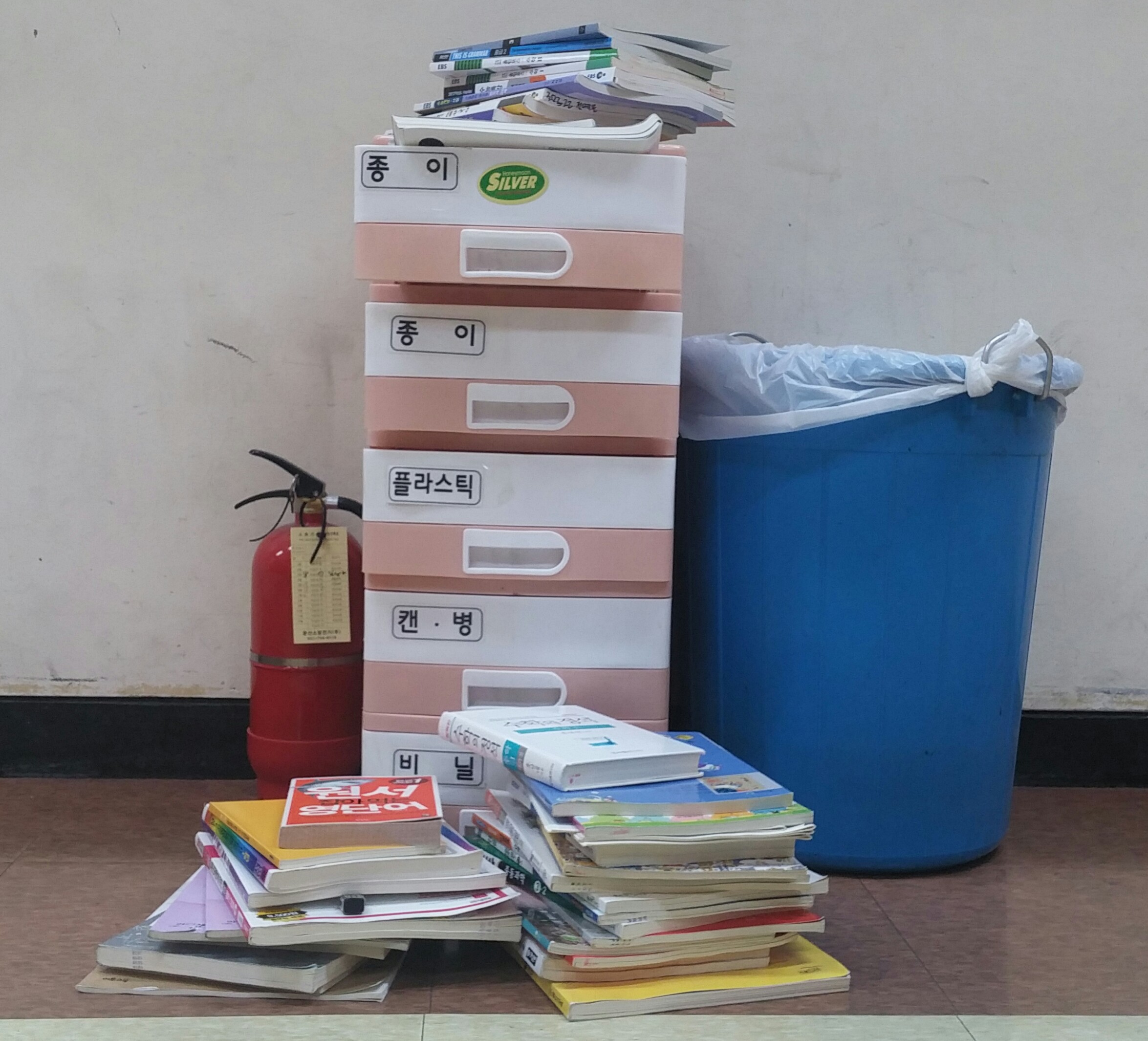 1학년이 끝나가는 겨울이었어요. 온 학교의 학생들이 문제집을 끌고 나와서 쓰레기통 옆에 잔뜩 쌓아놓는 모습을 보았죠. 새 것으로 보이는 것들이 대다수였고요!