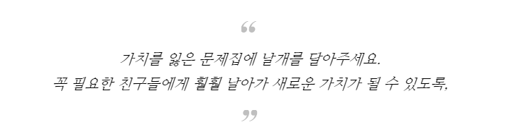 새 학기가 되고, 기말고사가 끝나고, 새 학원에 등록할 때, 우리들은 손도 대지 않은 수많은 문제집을 버리고 있지만, 우리 주변엔 이 문제집 한 권이 꼭 필요한 친구들이 있습니다.