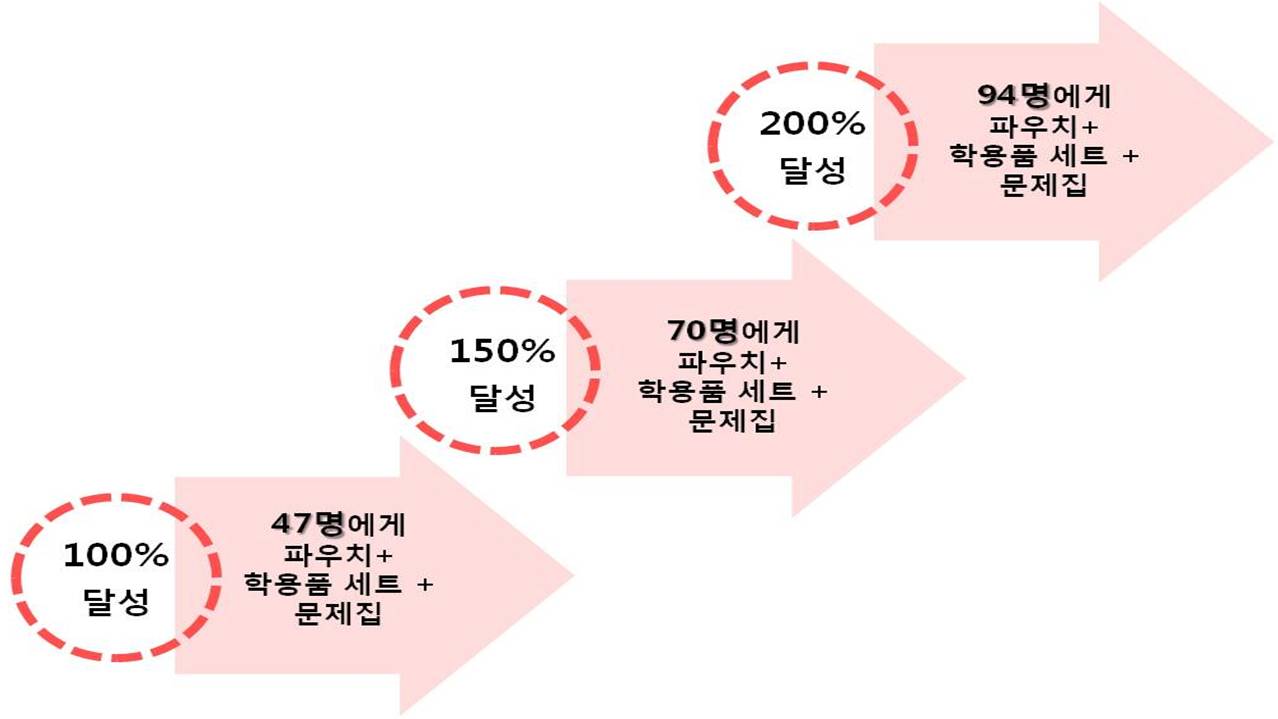목표 금액이 100% 달성되면 47명의 친구들에게, 150%가 달성되면 70명의 친구들에게, 200%가 달성되면 94명의 친구들에게 꿈을 응원하고 지지하는 희망의 문제집과 학용품 세트가 전달되어요!!