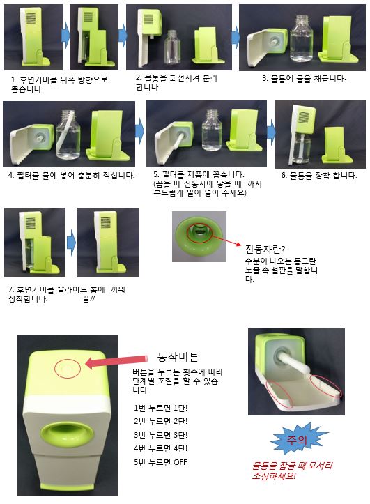 진동자에서 올라오는 수분입자를 공기와 함께 목적된 부분에 직진성으로 분사하는 것이 특징입니다.
