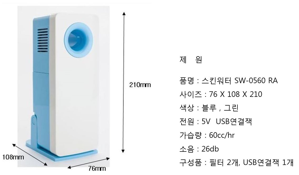 하지만 본 제품 '스킨워터'는 기존 미스트 기기에 비해 매우 저렴할 뿐 아니라 저가형 가습기, 선풍기에 비교해도 비싸지 않은 가격입니다. 또한 저전력 12V를 사용하여 차량 및 여러 용도로 사용할 수 있는 것이 특징입니다. 그러나 12V제품은 사무실 전원의 콘센트 사용제한과 5만원 대의 비교적 부담스러운 가격이라는 의견등이 있어, 보급형 5V USB 전원 제품을 출시하여 피부보습기의 대중화를 시작하고자 합니다.