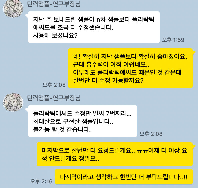수십번의 제형 수정과 수십명이 연구원님들을 만나고 드디어 원하는 것을 모두 구현한 제형을 만들었습니다.