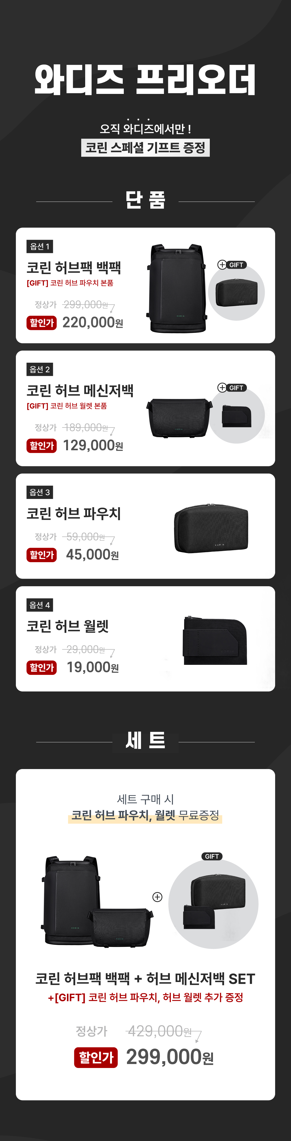 2) 백팩 또는 슬링백 단품, 그리고 세트 구매 시 코린 파우치와 월렛 등 실용적인 사은품을 특별 증정합니다.