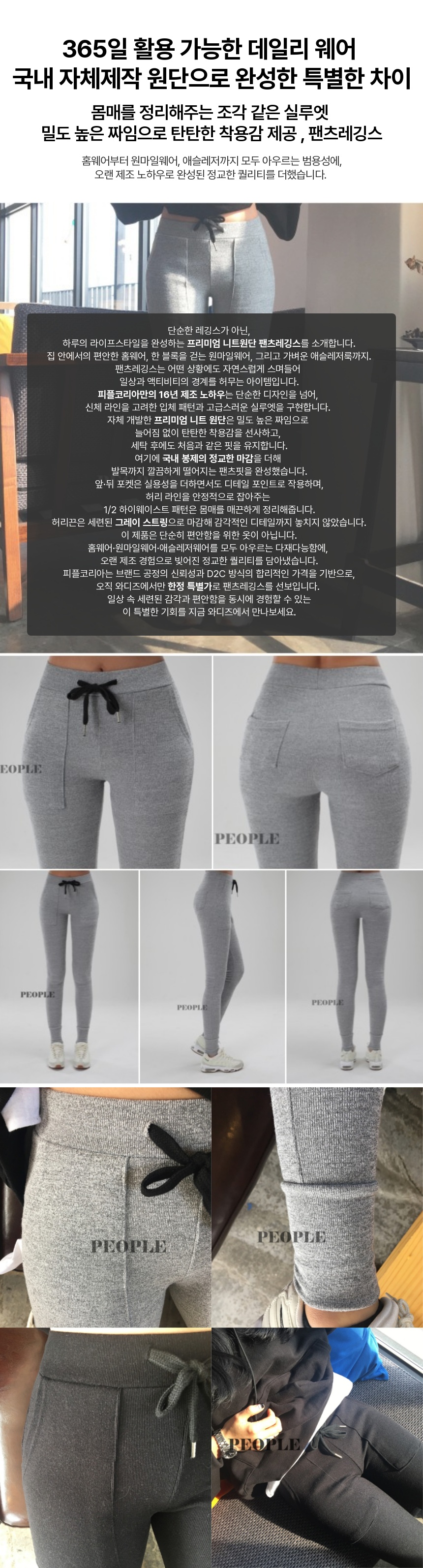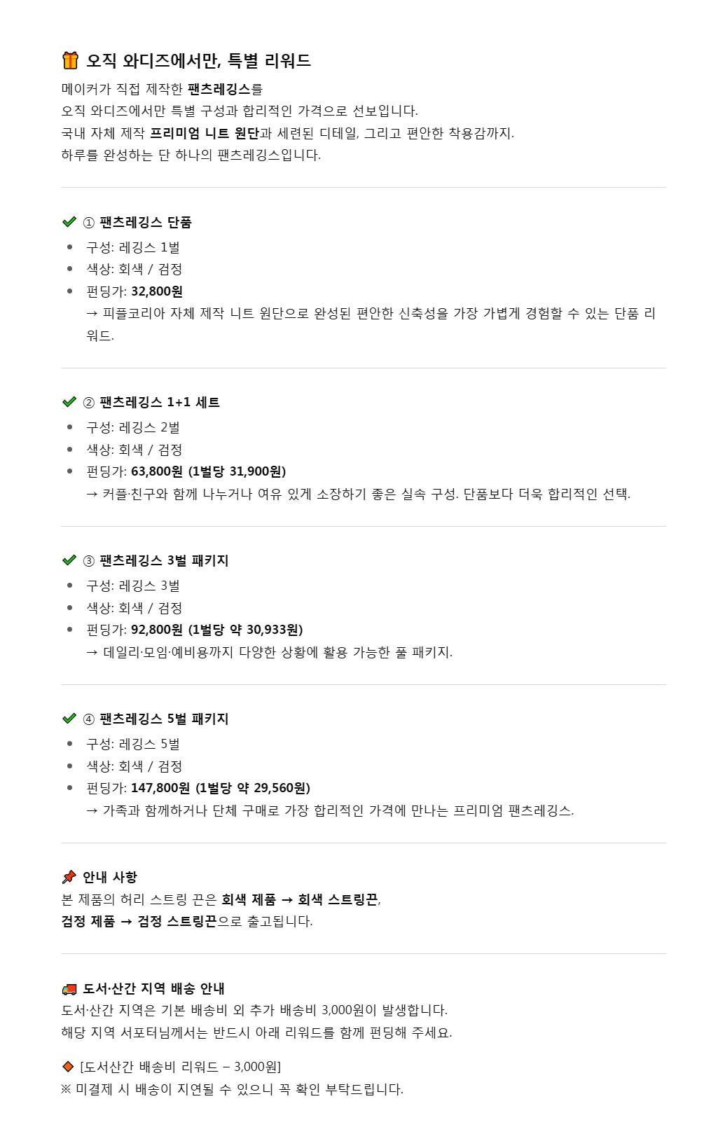 1. 👖 프리미엄 니트 팬츠레깅스 - 16년 노하우와 국내 장인 봉제 기술 결합 2. ✨ 홈웨어·원마일·애슬레저 다용도 - 편안함과 세련된 실루엣을 동시에 제공 3. 🎁 와디즈 한정 특별가 혜택 - 단품부터 5벌 패키지까지 다양한 구성