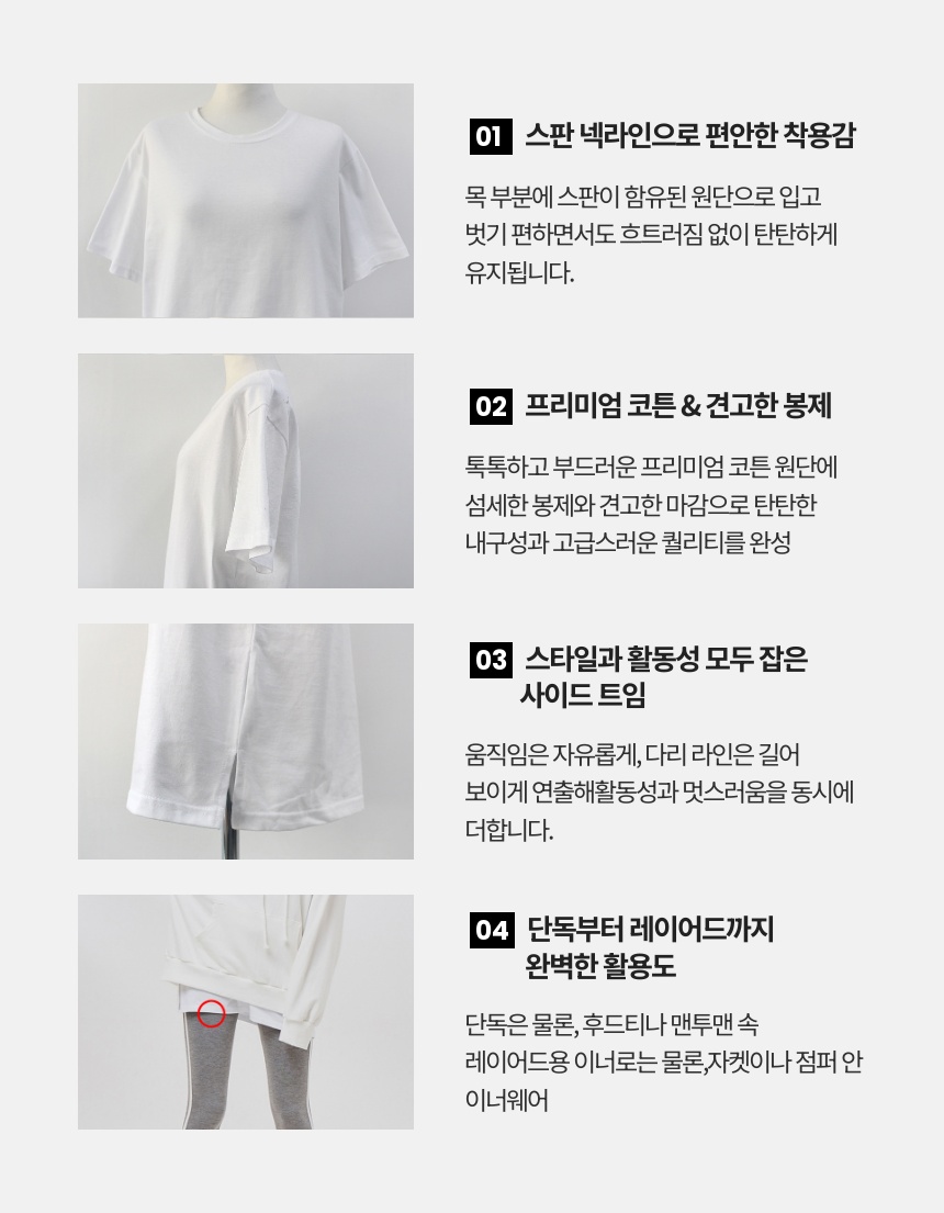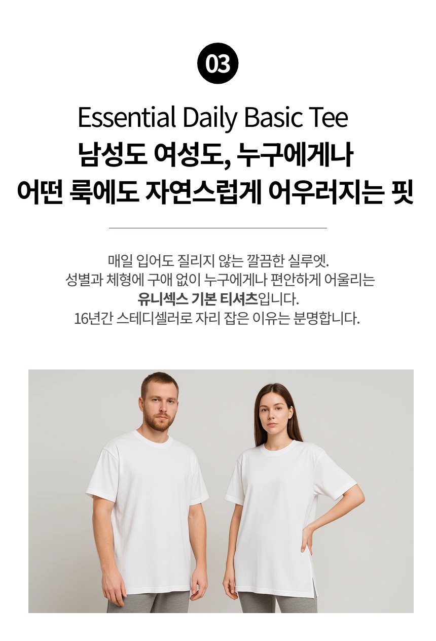 1. 👕 프리미엄 코튼 기본 티셔츠 - 16년 스테디셀러, 남녀 모두 편안한 유니섹스 디자인 2. ✨ 완성된 핏과 스타일 - 사이드 트임과 기장으로 단독·레이어드 모두 완벽한 핏 3. 🎁 와디즈 한정 특별가 - 유통 마진 없는 D2C 방식으로 합리적 가격 제공