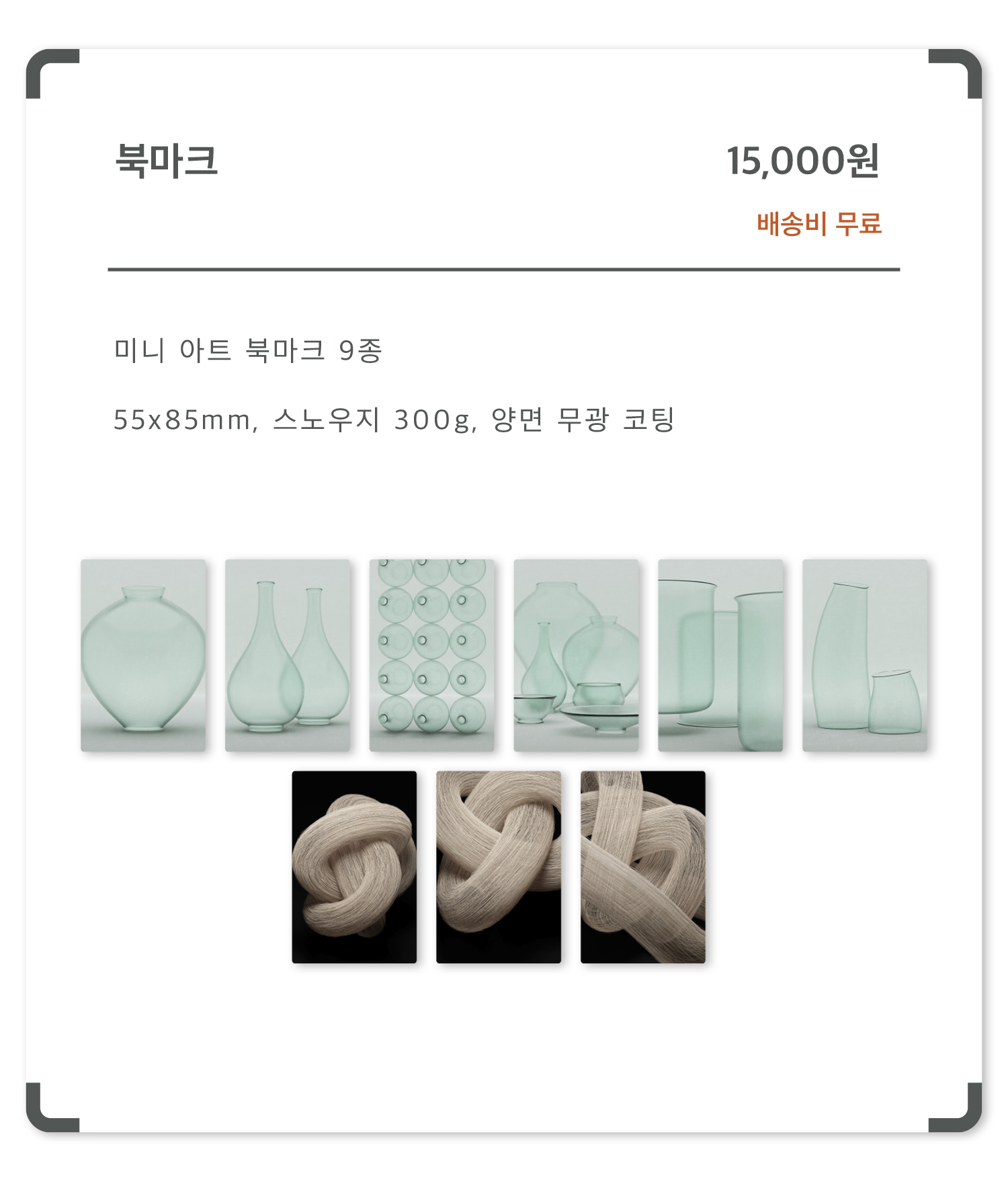 크기는 55x85mm 이며 총 9종 세트의 북마크를 준비했습니다.