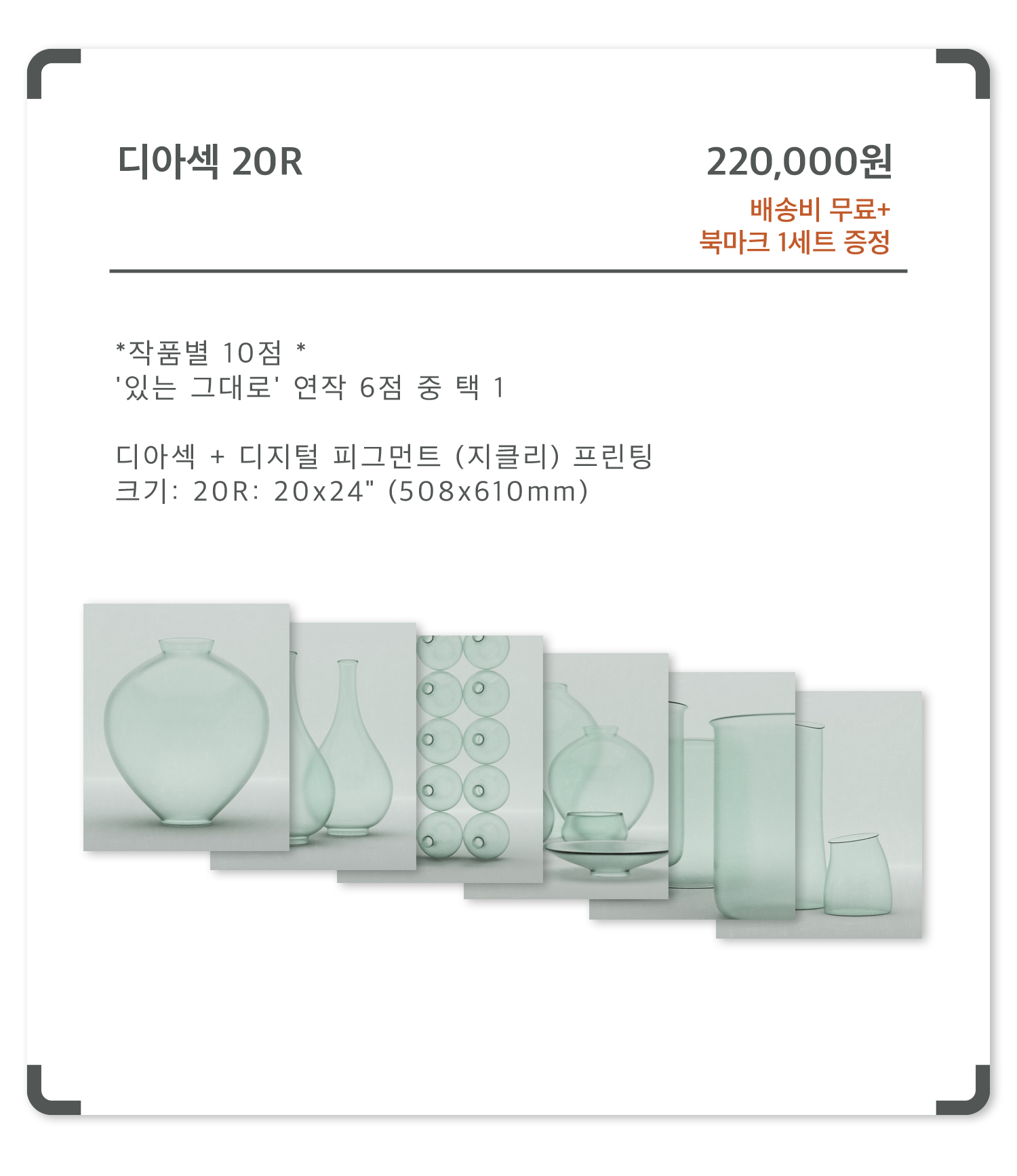 1. 🖼️ 디지털 아트 프린트 연작 - '있는 그대로'와 '매듭' 연작의 고품질 디지털 아트 프린트 2. 🎨 전통과 현대 융합 작품 - 도자기와 유리의 질감으로 신뢰와 사회적 연결성 표현 3. 🎁 한정판 및 서포터 혜택 - 액자 옵션 다양, 미니 아트 북마크 9종 세트 증정 포함