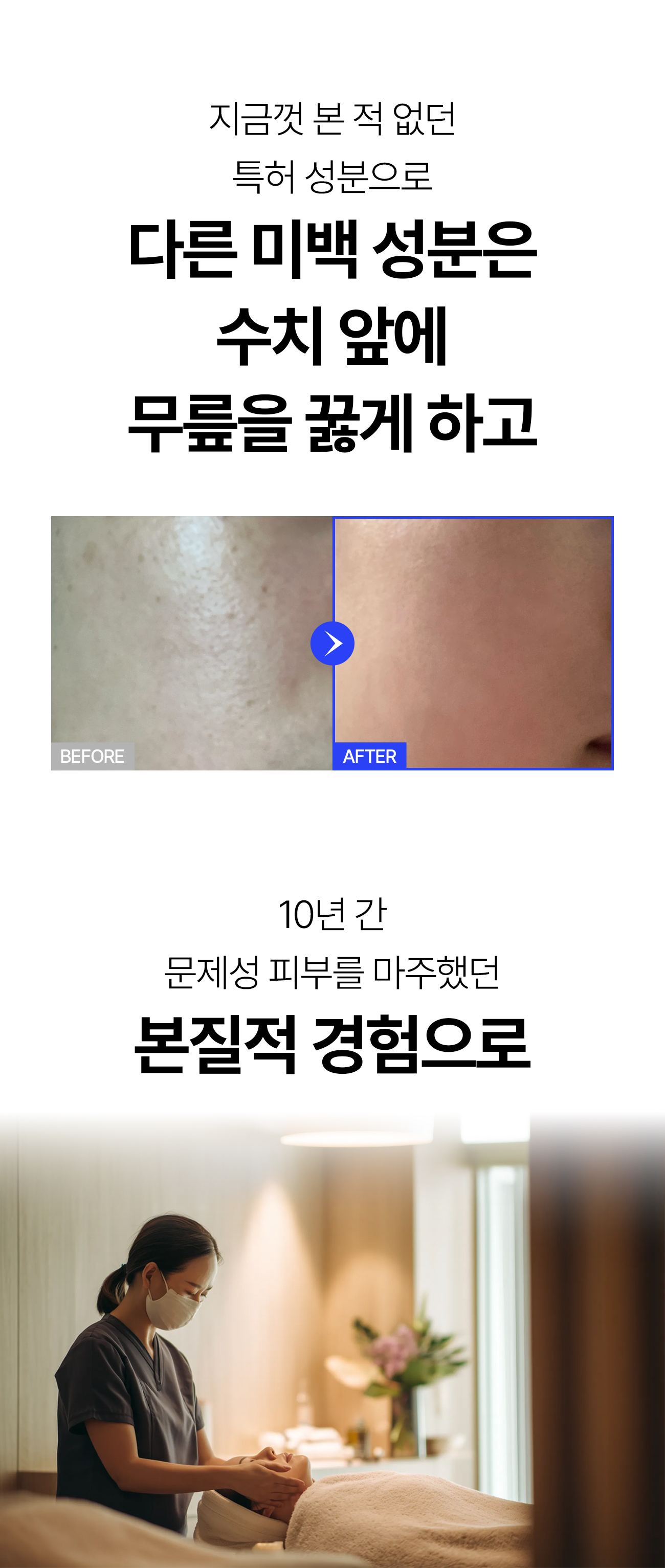 저는 20년 동안 피부관리 전문가로 살아오며 수많은 고객의 피부를 만나왔고, 그중 10년은 피부관리실을 직접 운영하며 현장에서 고객들의 고민을 가장 가까이에서 들어왔습니다. 수많은 화장품을 소비자 입장에서 써보기도 하고 손님들에게 피부관리 제품으로 써보기도 했지만, 오랜 세월 질리지 않고 매일같이 손이 가는, 피부에 진짜 도움이 되는 화장품을 찾는 일은 늘 어려웠습니다. 그래서 언젠가 직접, 고객이 믿고 오래도록 곁에 둘 수 있는 화장품을 만들어야겠다는 다짐을 하게 되었습니다.