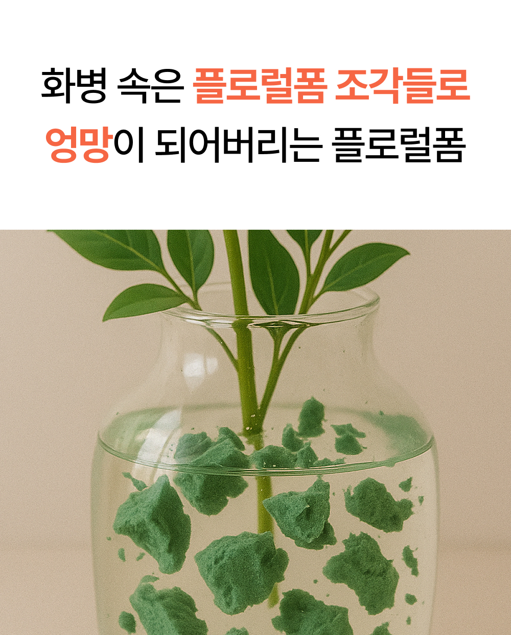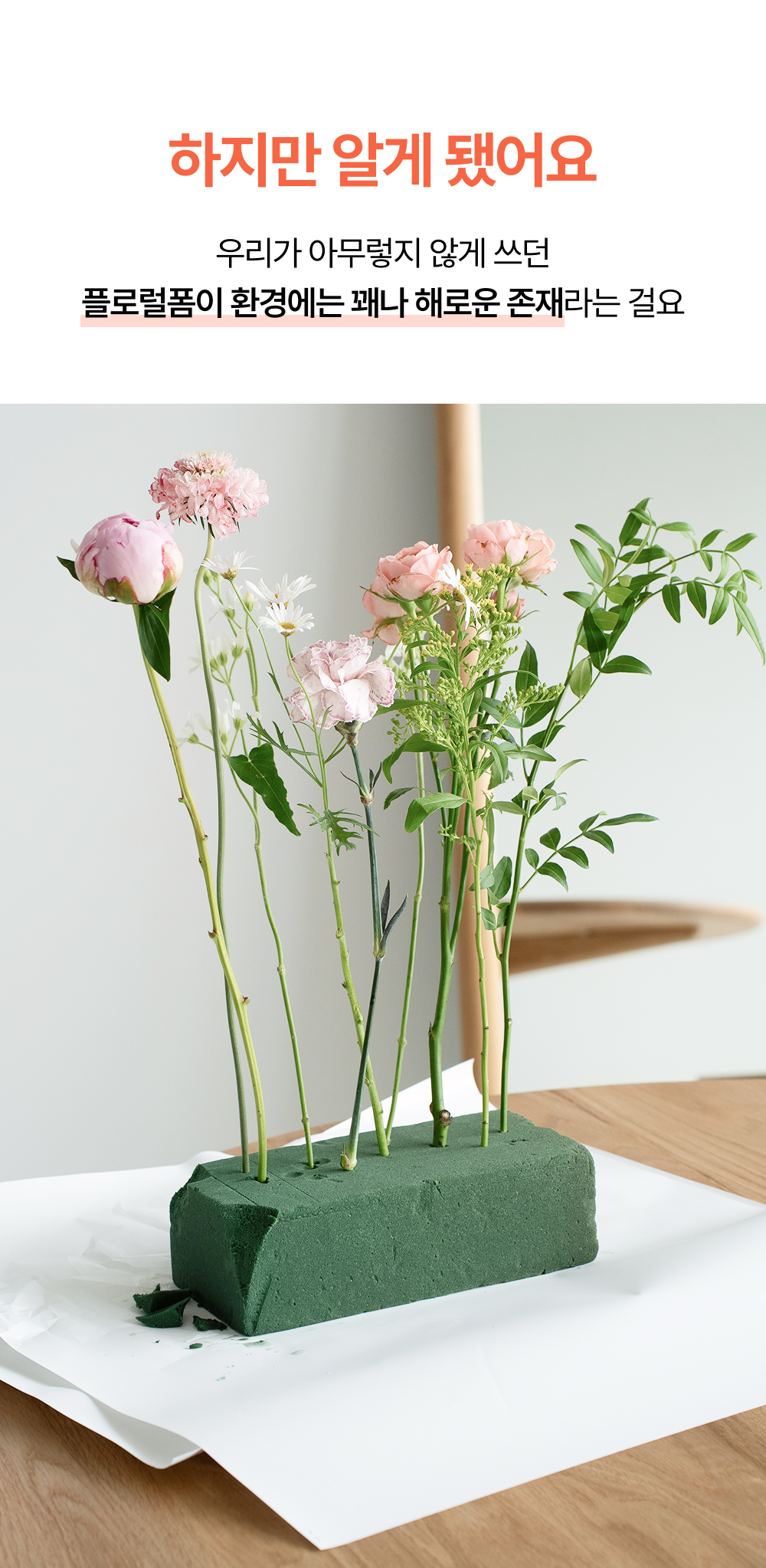 저는 일상 속에서 꽃을 가까이 두고 즐기는 것을 좋아하는 플로리스트이자 디자이너 박영미입니다. 아름다운 꽃이 누군가에게 기쁨이 되길 바라면 꽃꽂이를 만들던 어느날, 손에 느껴지는 이상한 가려움과 버려지는 수많은 녹색 스펀지 가루를 마주하게 되었습니다. 그것이 플로럴폼의 정체, 썩지 않는 플라스틱이자 미세플라스틱의 주범이라는 것을 알게 되면서 제 일에 대한 질문이 생겼습니다.