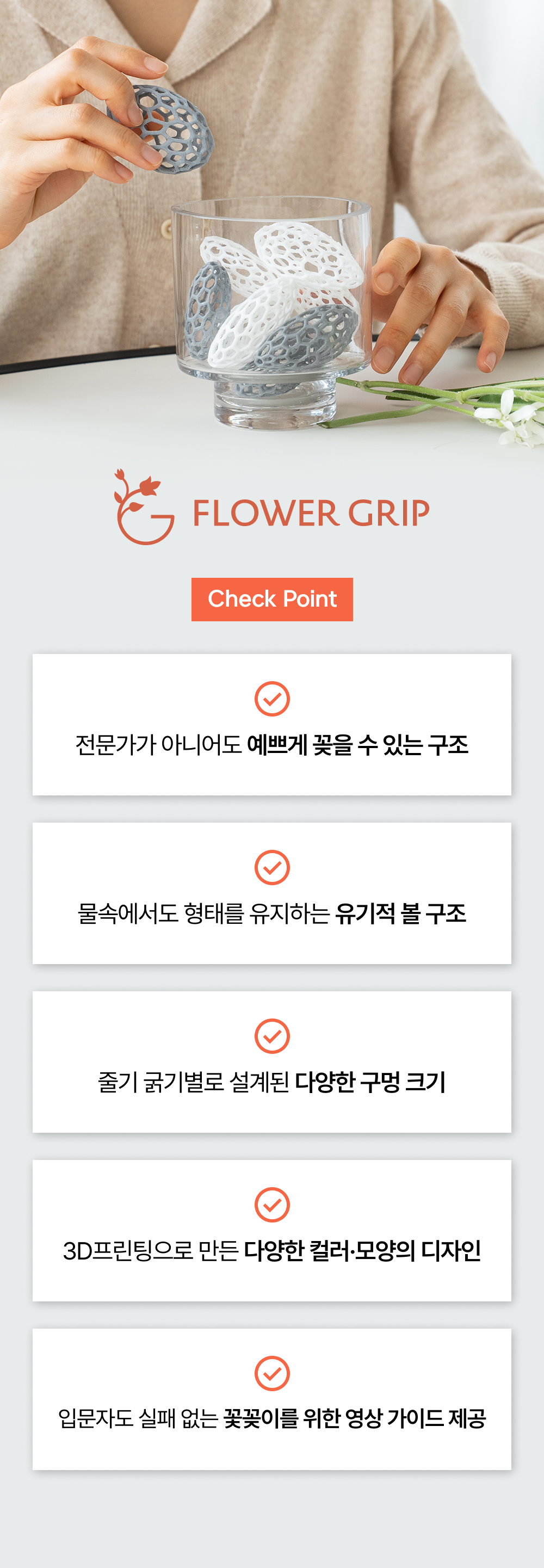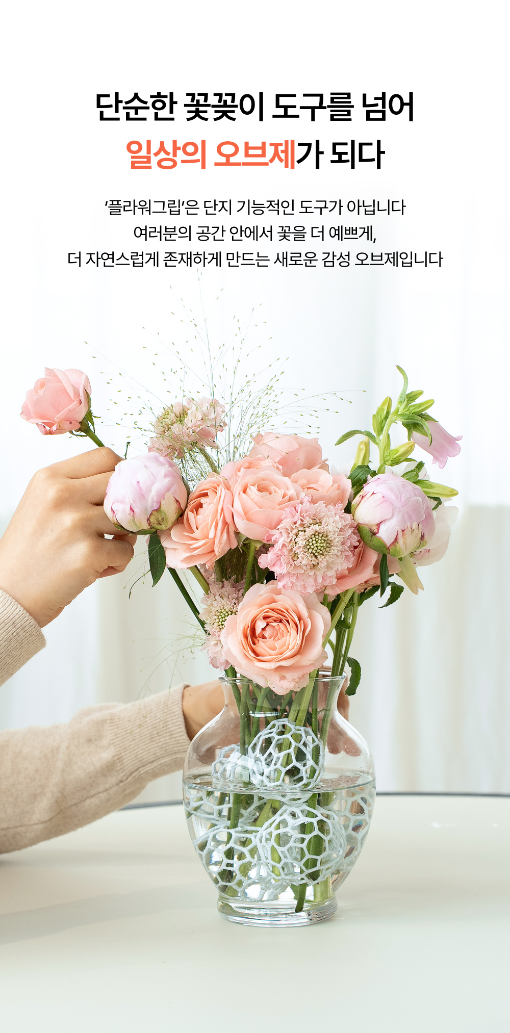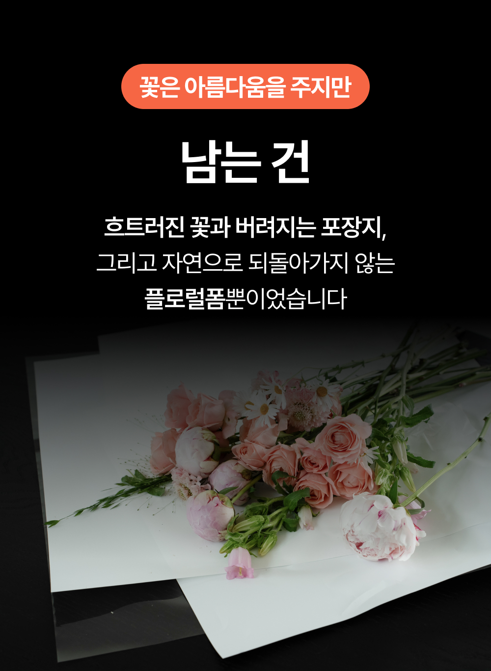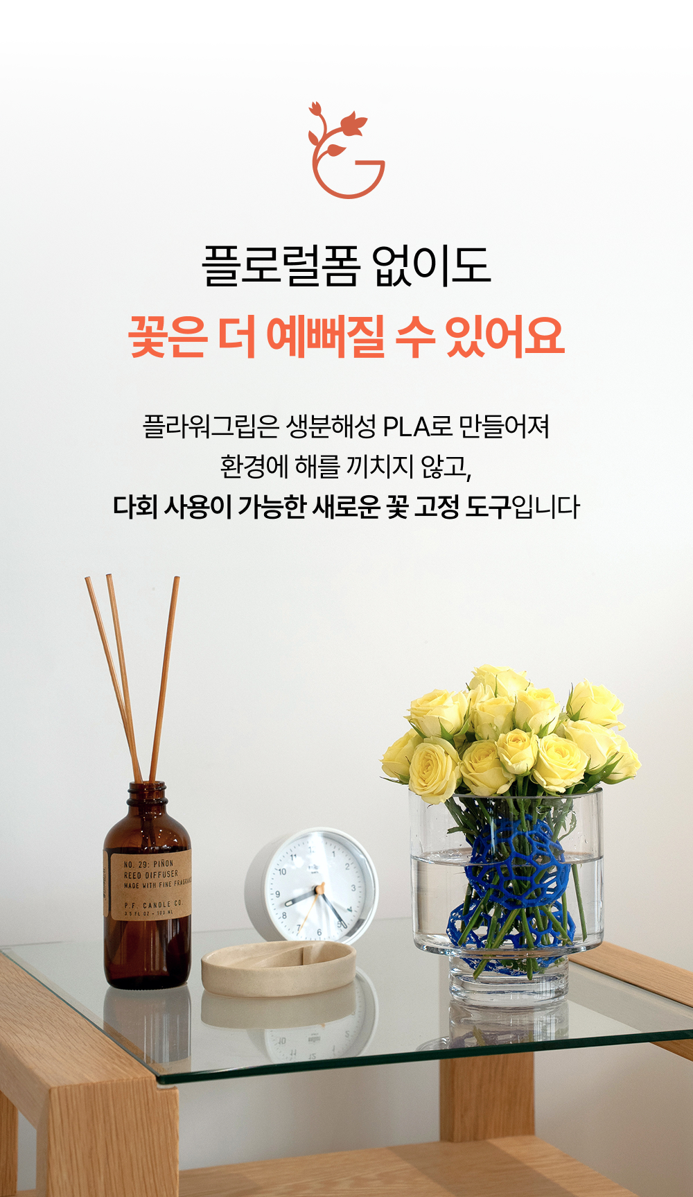 플라워그립은 단순한 꽃꽂이 도구가 아닙니다. 이 제품을 통해 우리는 플로럴폼 사용으로 인해 발생하는 화훼 폐기물과 미세플라스틱 문제를 해결하고자 합니다. 하지만 지금까지 꽃 시장에서 '플로럴폼은 당연한 것'으로 여겨졌기에, 새로운 선택지를 알리고 행동으로 옮기기 위해선 응원이 필요합니다.